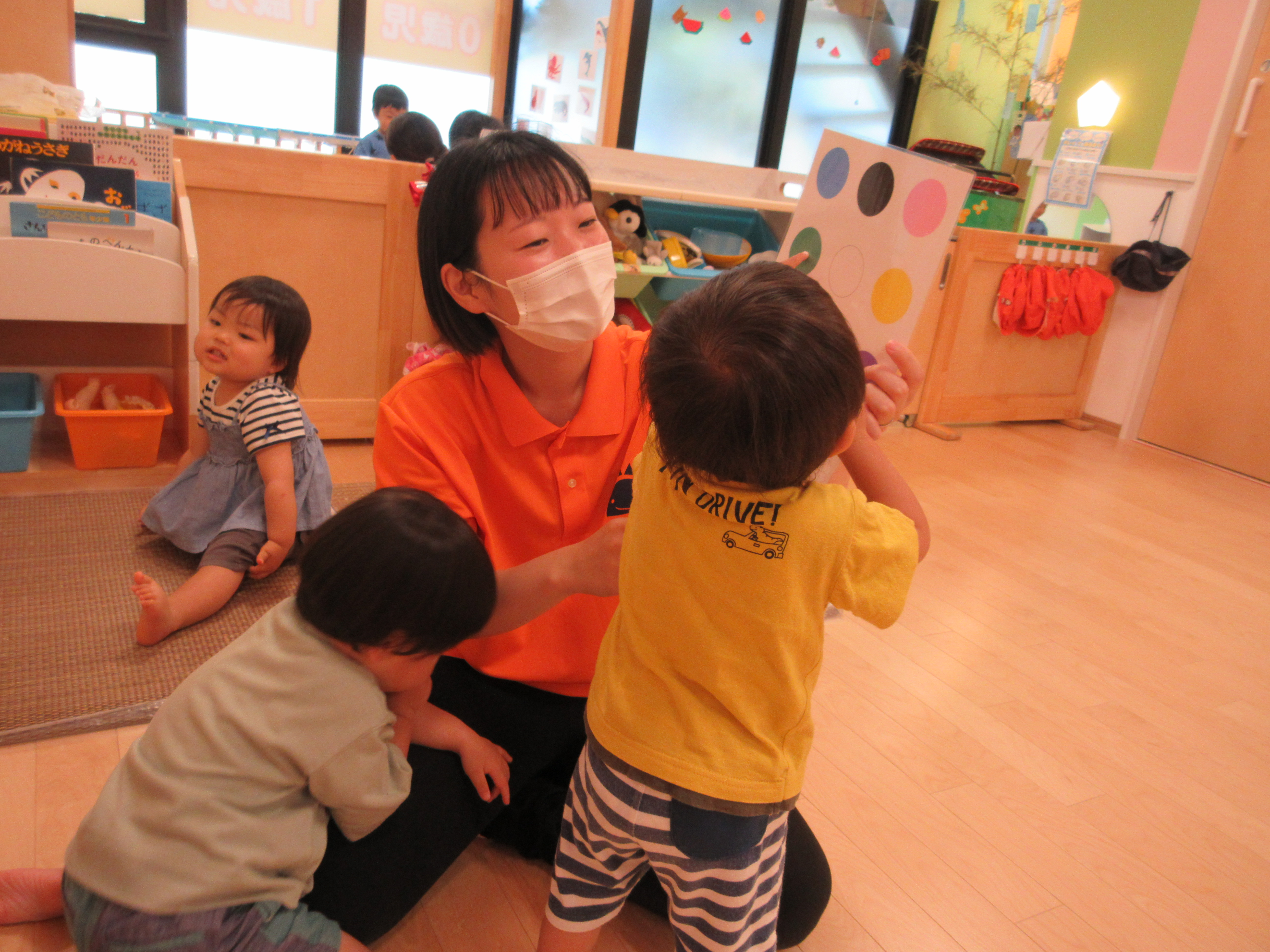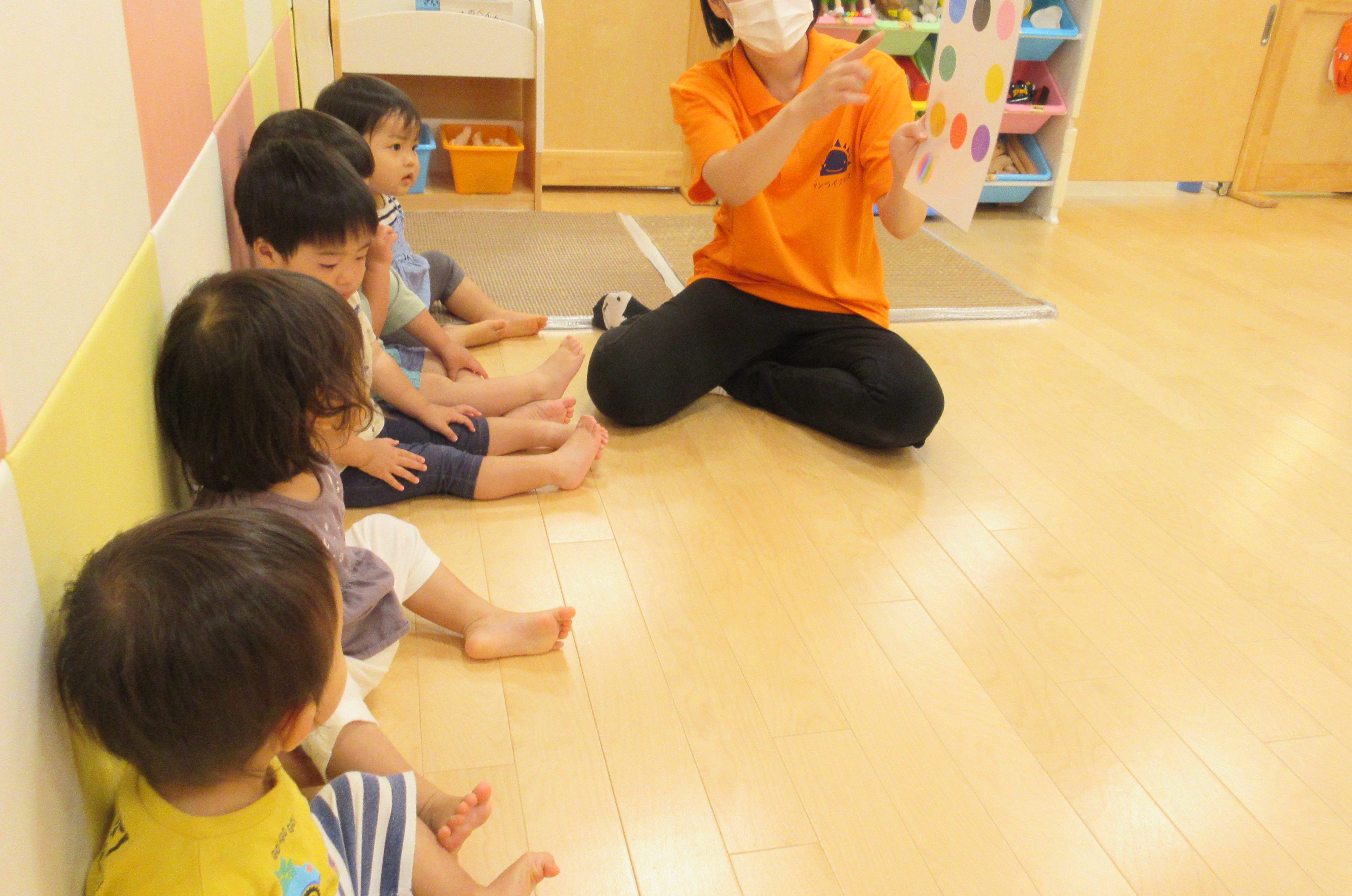 「blue」と先生が口にすると「ぶ~」「ぶる~」と真似をする子どもたち。