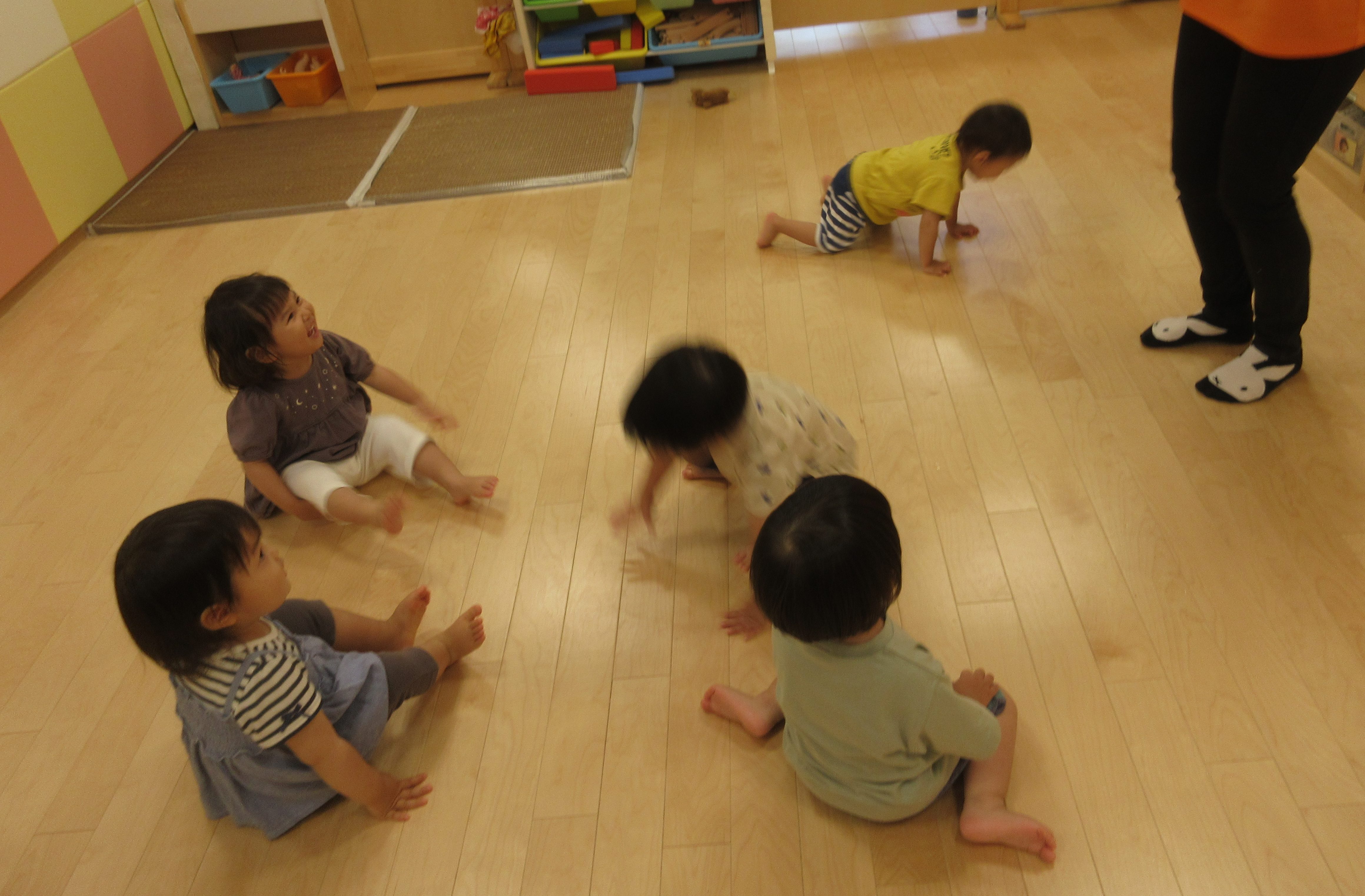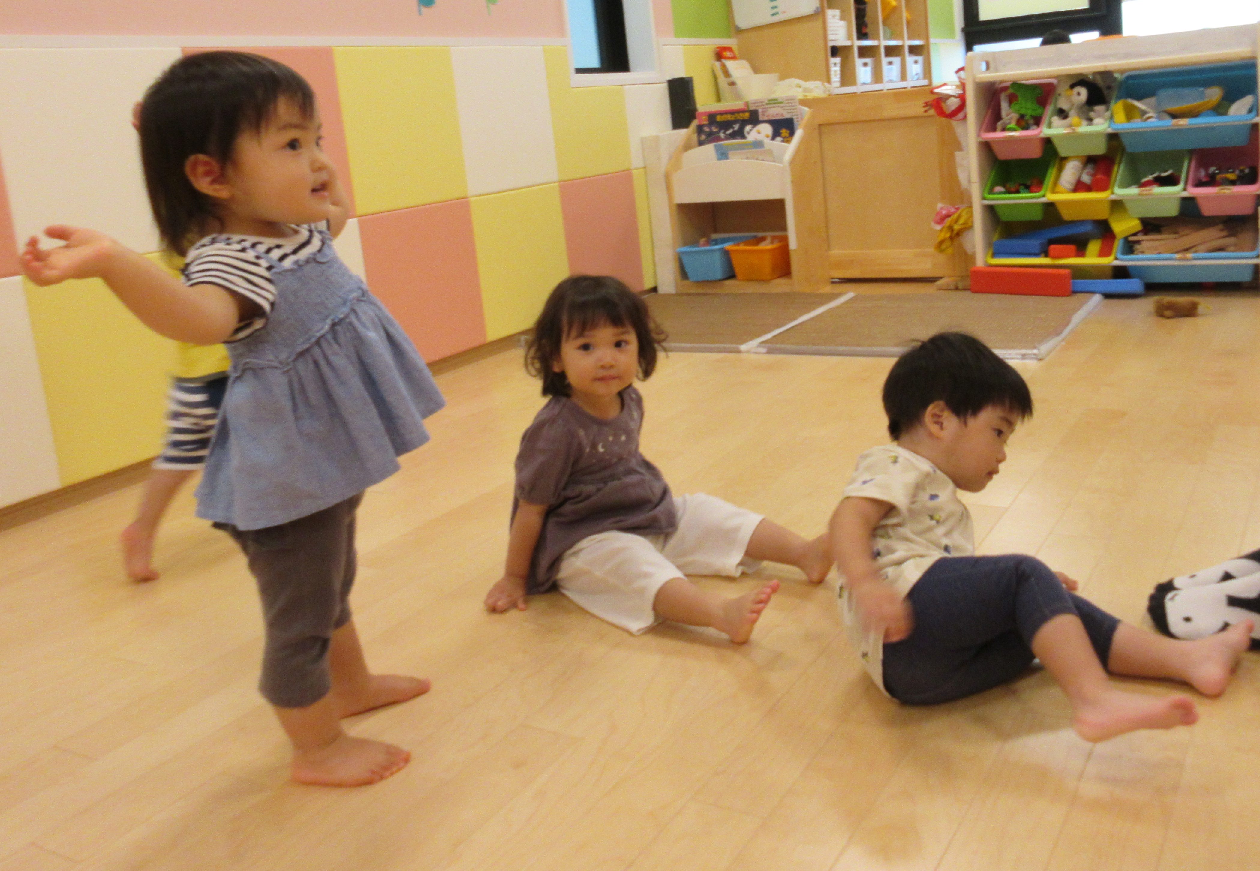 ⇩「I can stamp my feet」では、足をバタバタするのを楽しむ子どもたち。