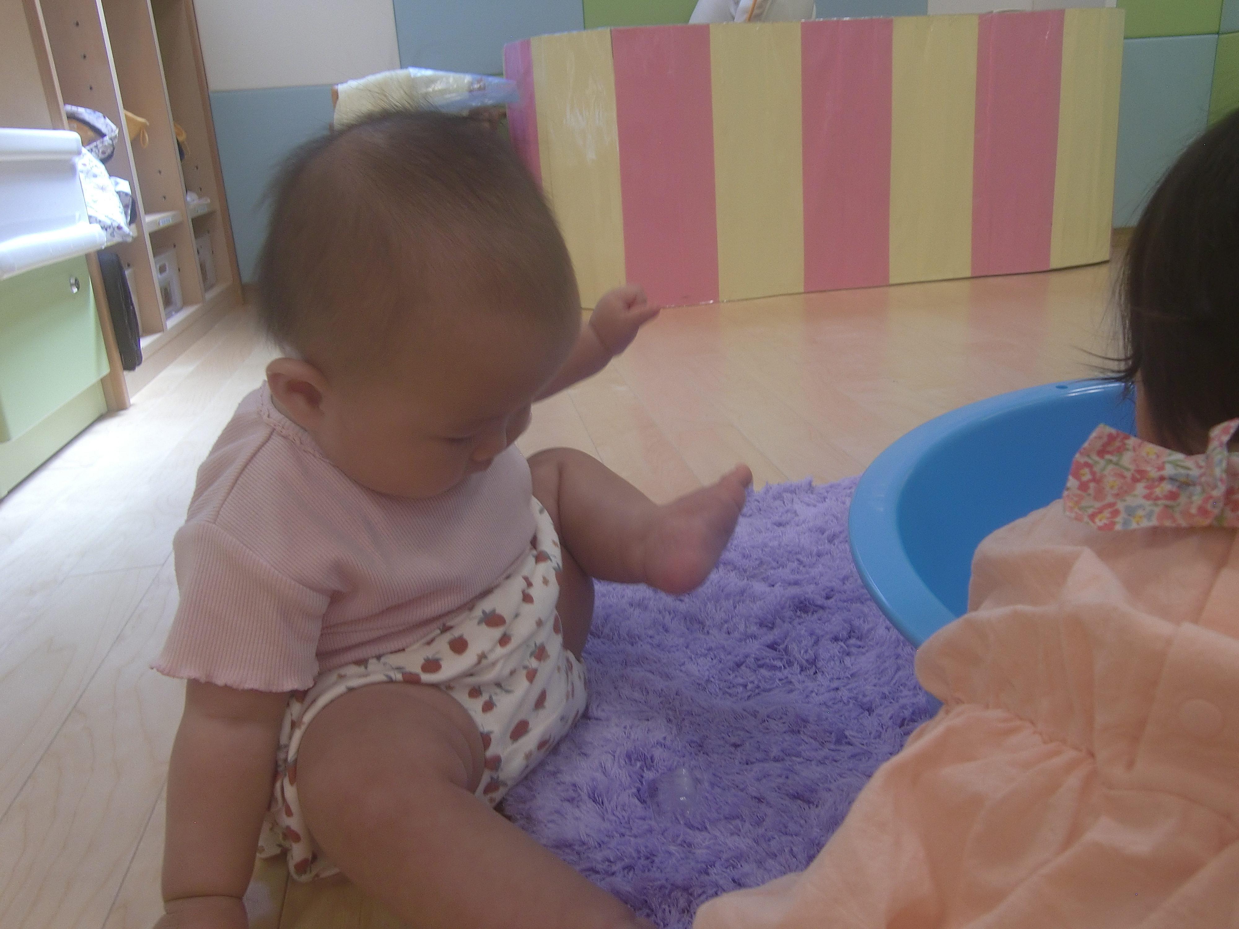 まだ何も入っていないタライの中に手を入れてみたり、マットのモコモコが気に入ったのかちょこんと座って待っている子もいました![]()