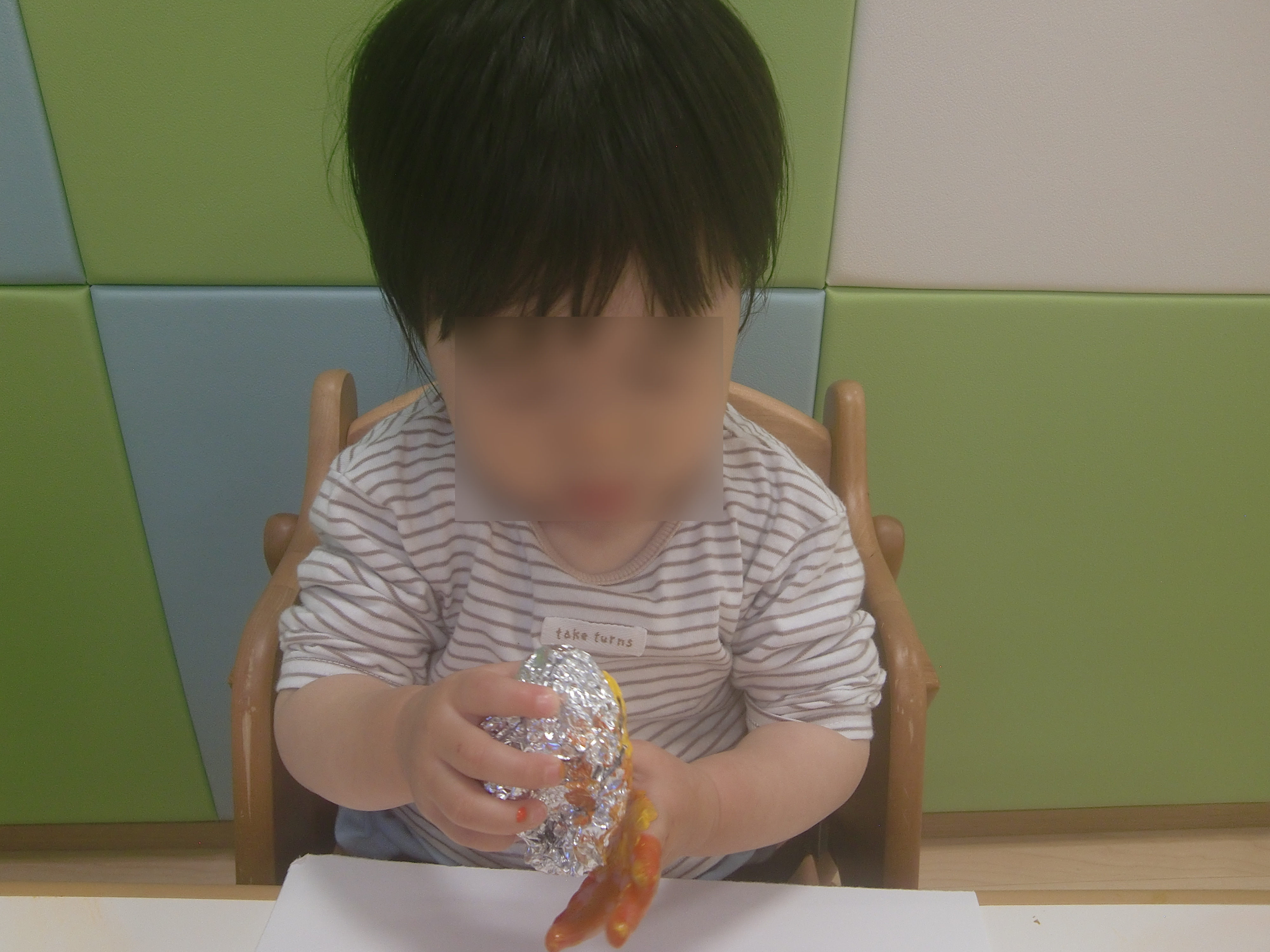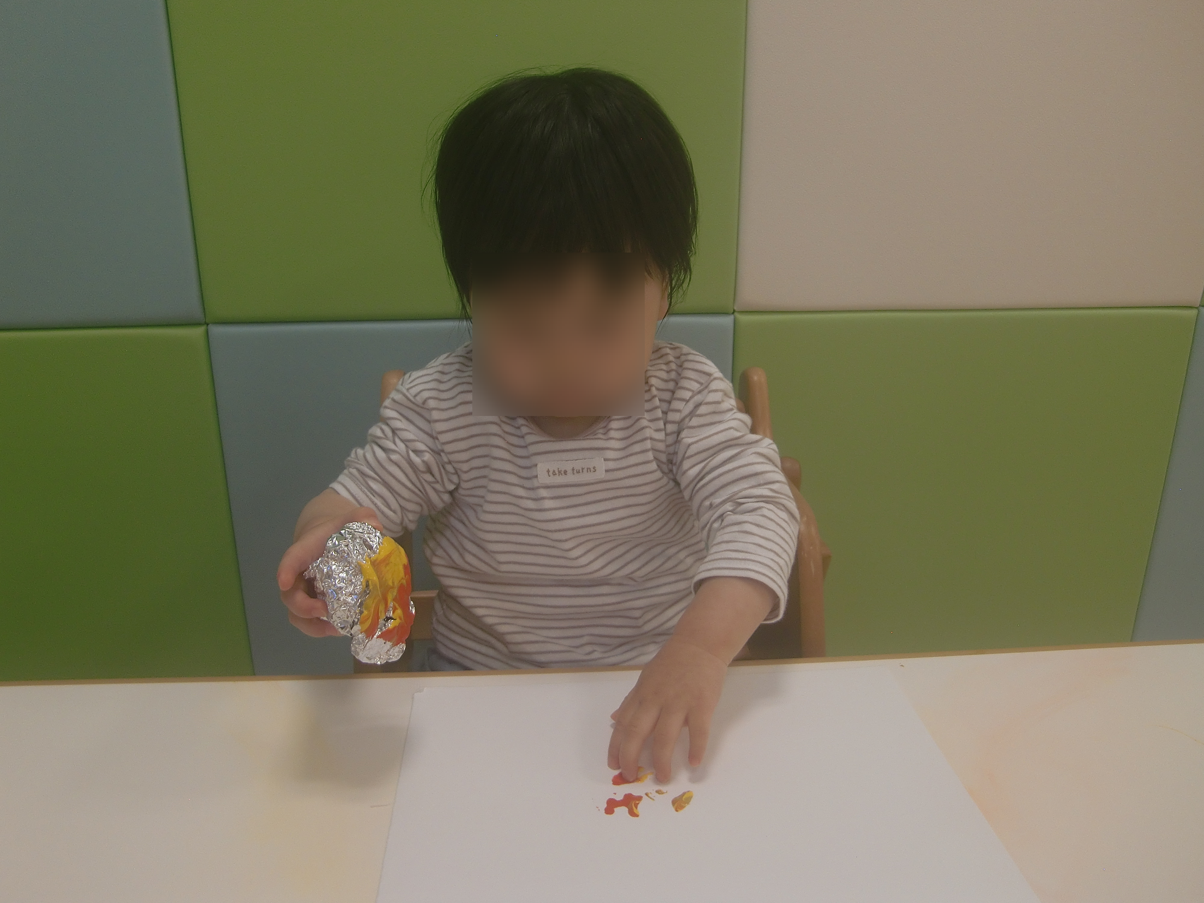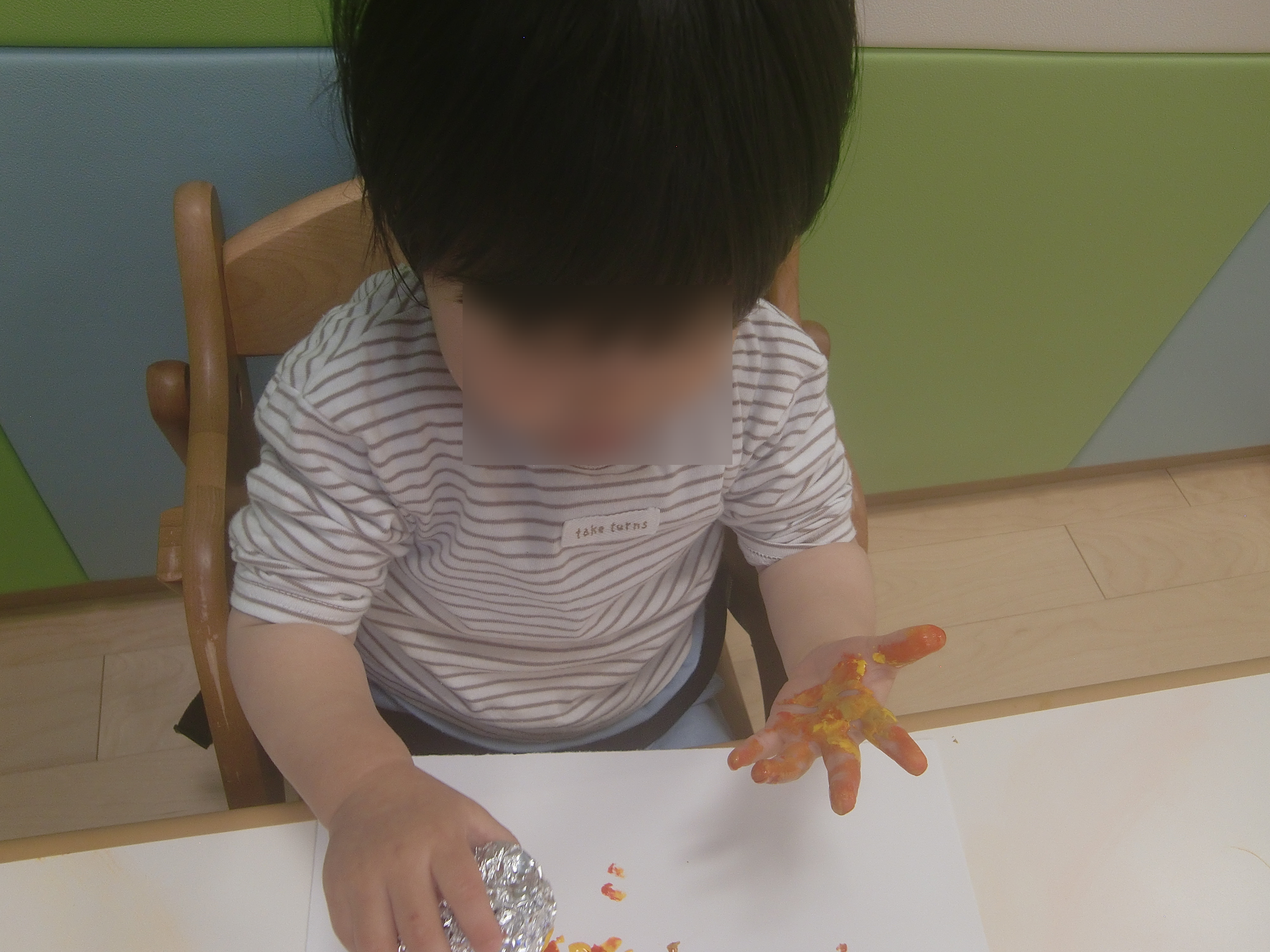 ⇩絵の具を付けたアルミホイルを渡しても、色付く事にもびっくりしたようで目を丸くさせて