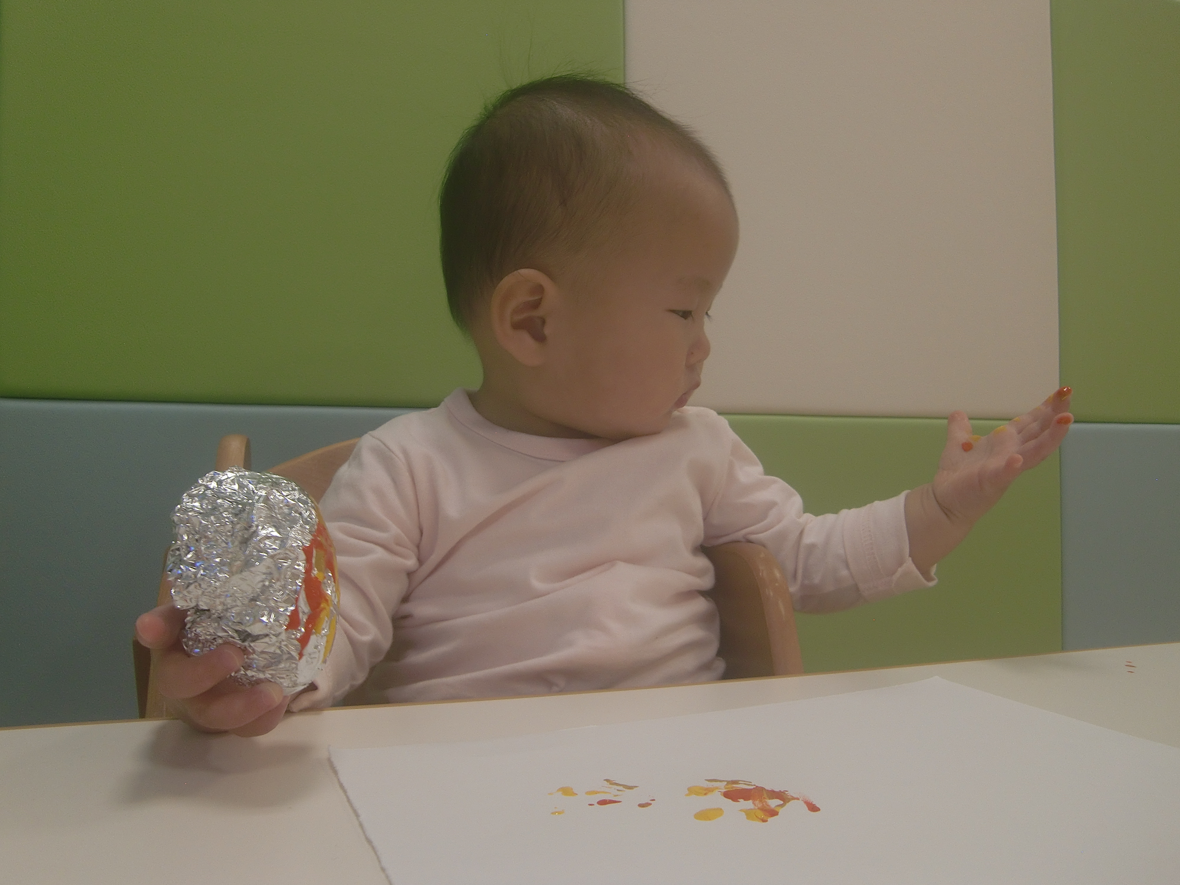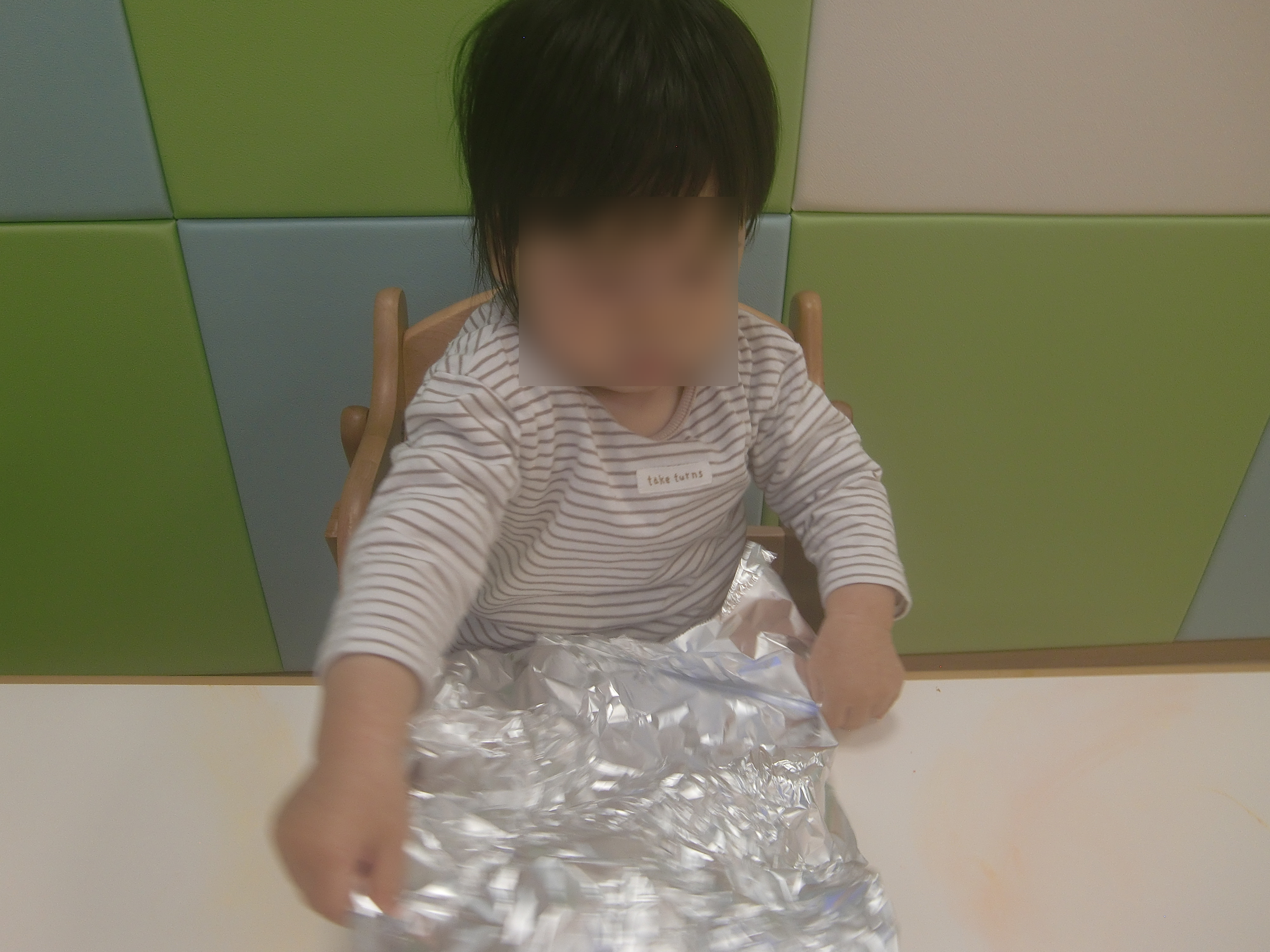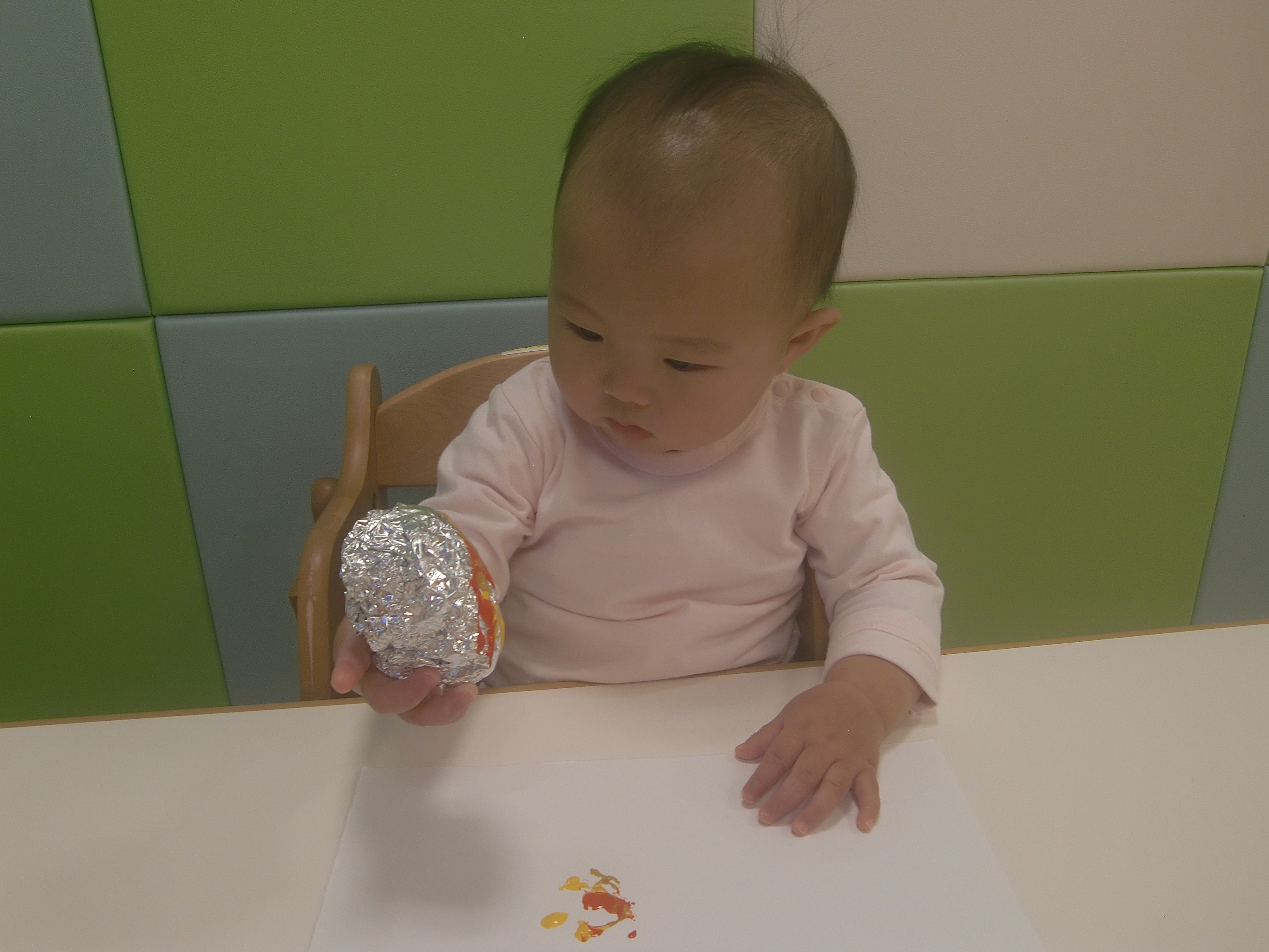 ⇩絵の具を付けたアルミホイルを渡しても、色付く事にもびっくりしたようで目を丸くさせて