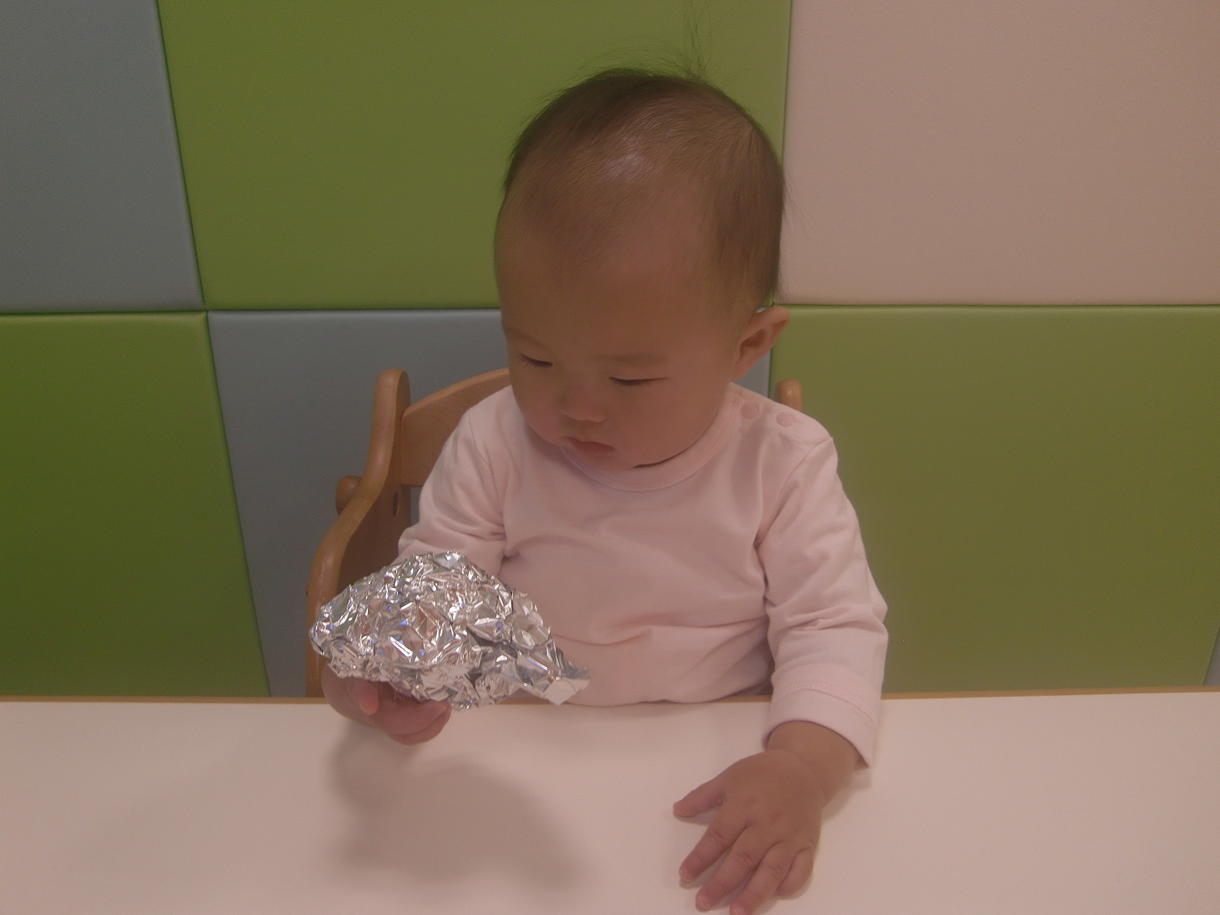 まずは何も付いていないアルミホイルを渡すと、とても興味津々で