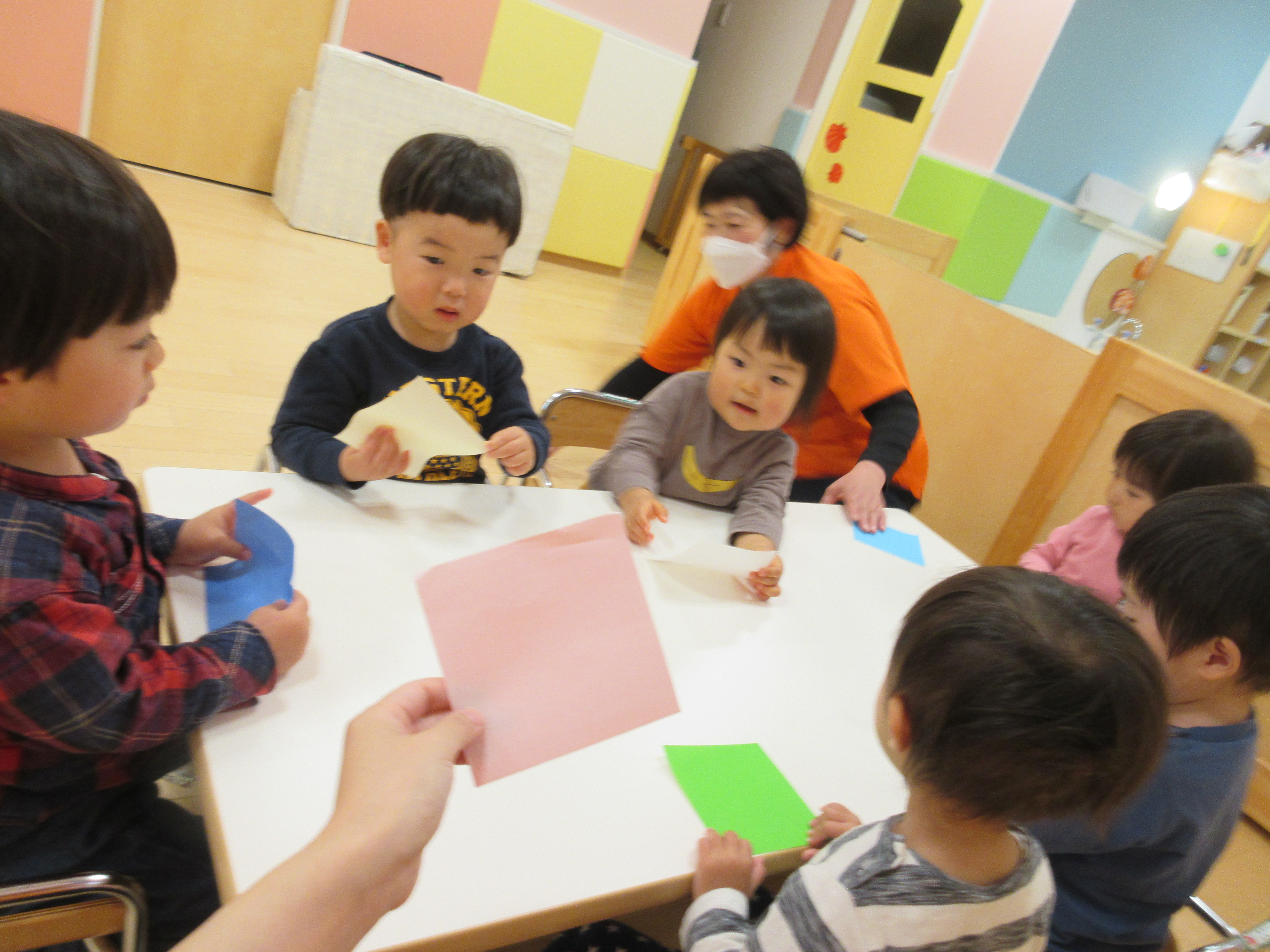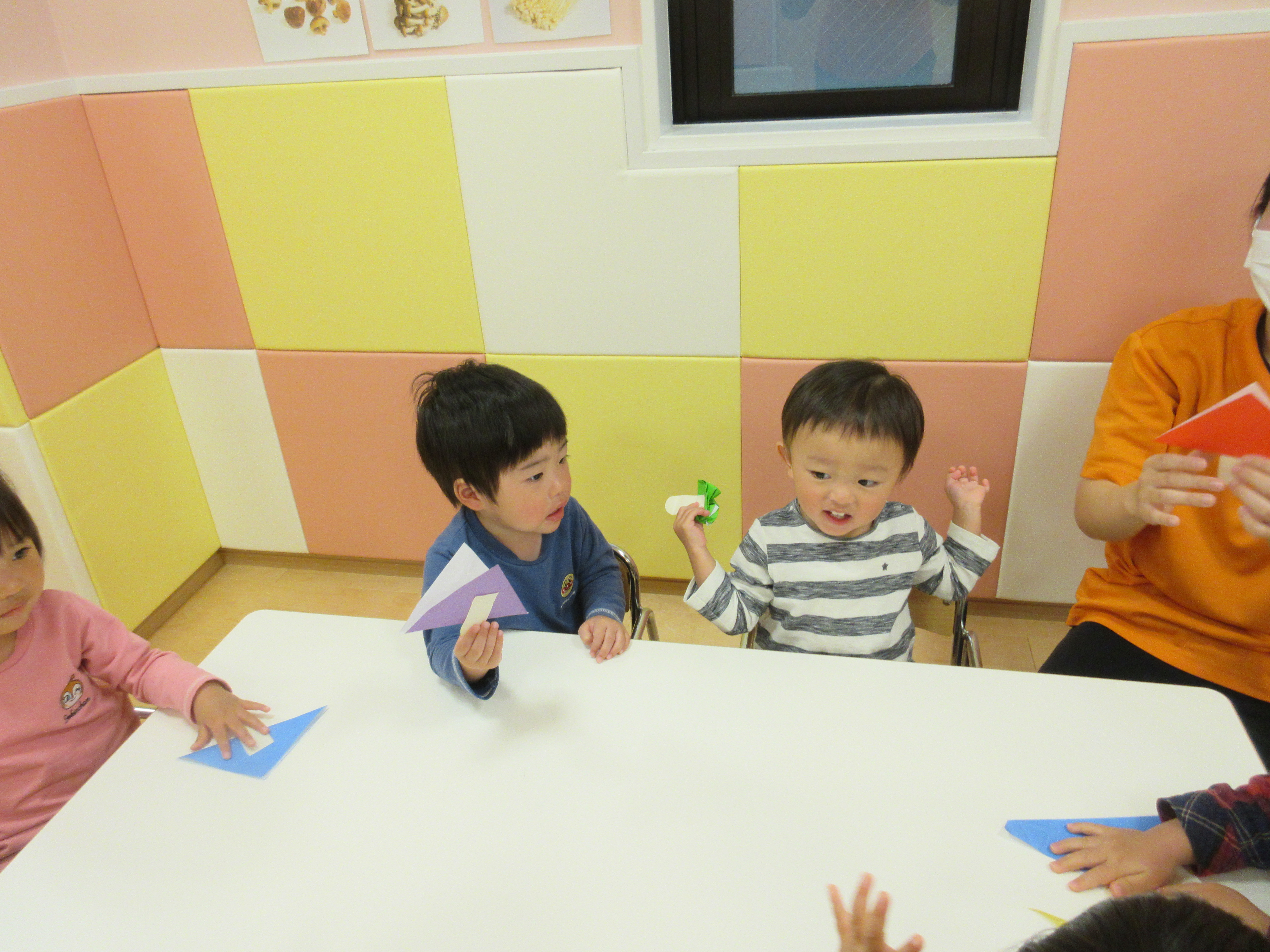 途中、先生がお手伝いする場面もありましたが三角に折ることができると嬉しそうな子どもたちでした。