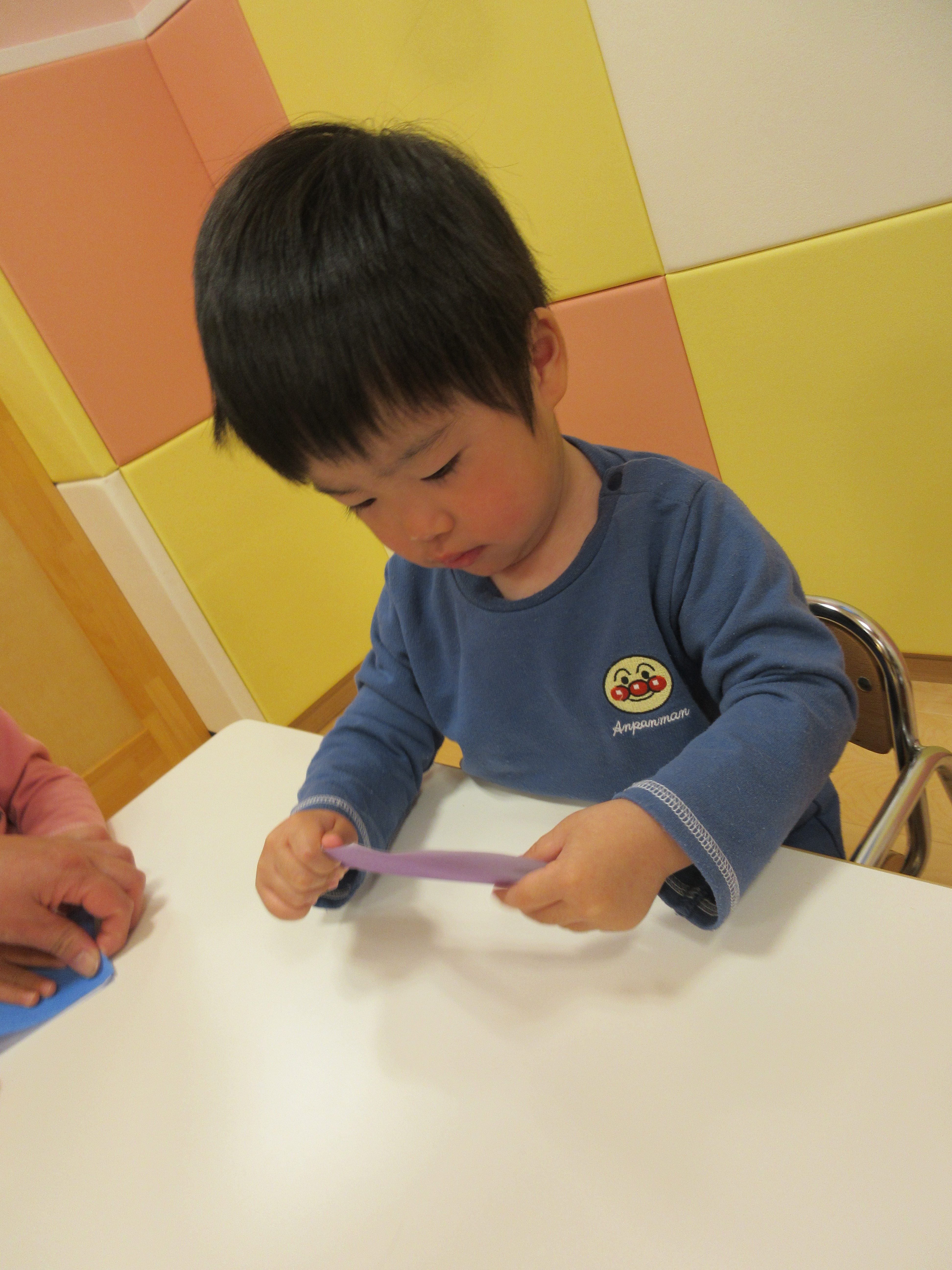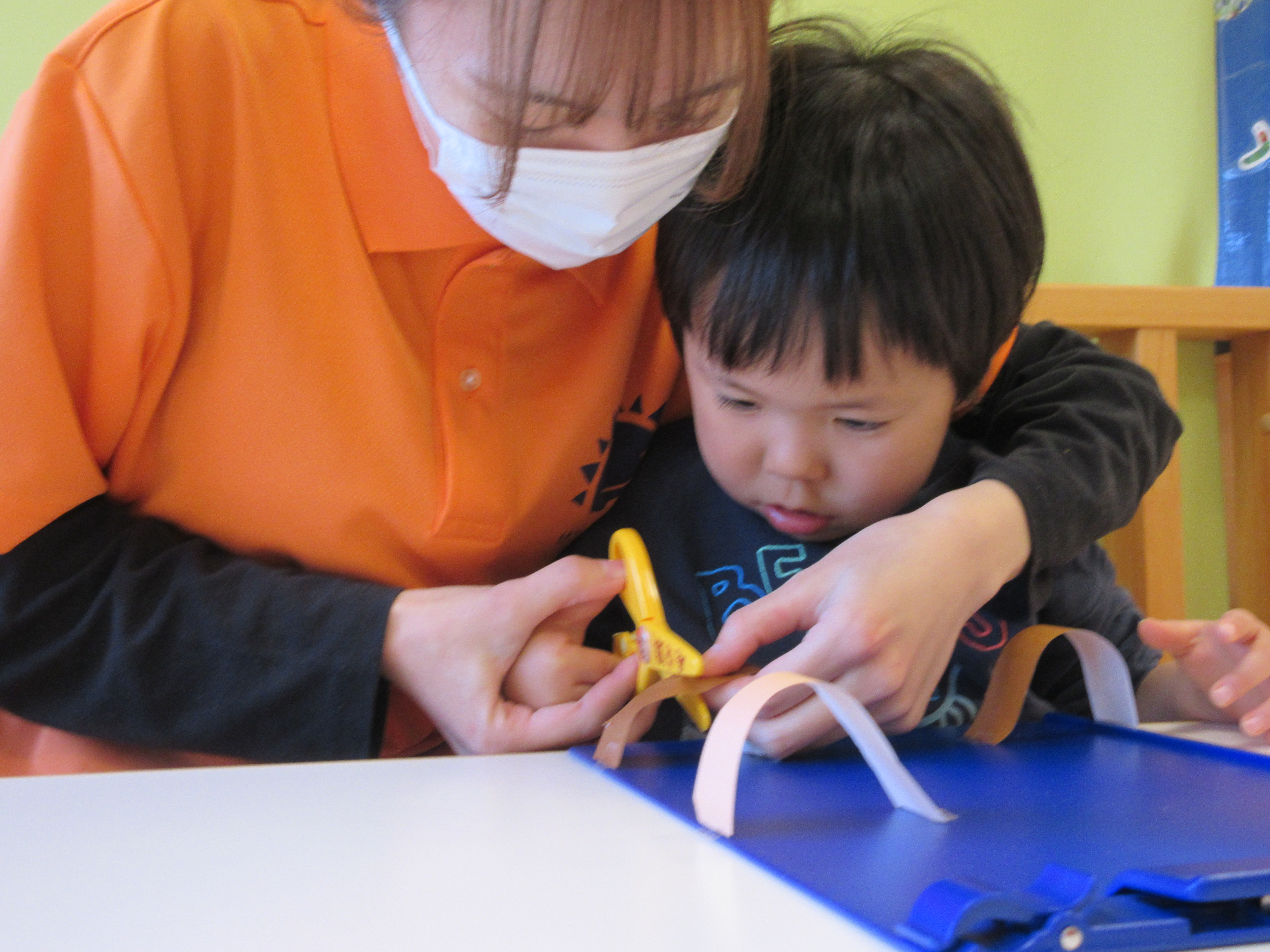 ⇩先生と一緒にハサミを持つとじっくりとハサミで折り紙が切れる瞬間を見つめていた子、
