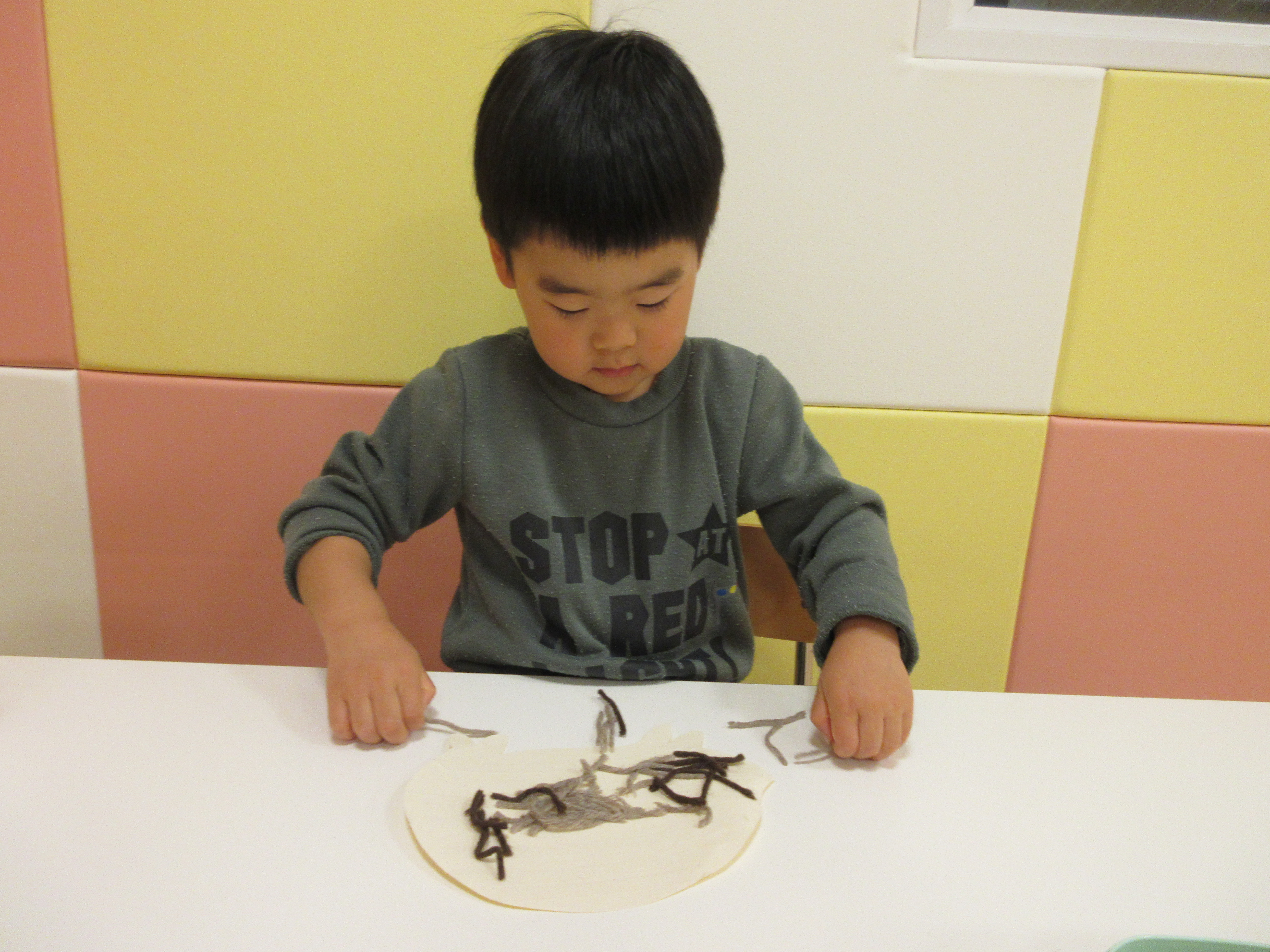 ⇩両面テープの上に隙間がなくなるくらい毛糸を貼っている子