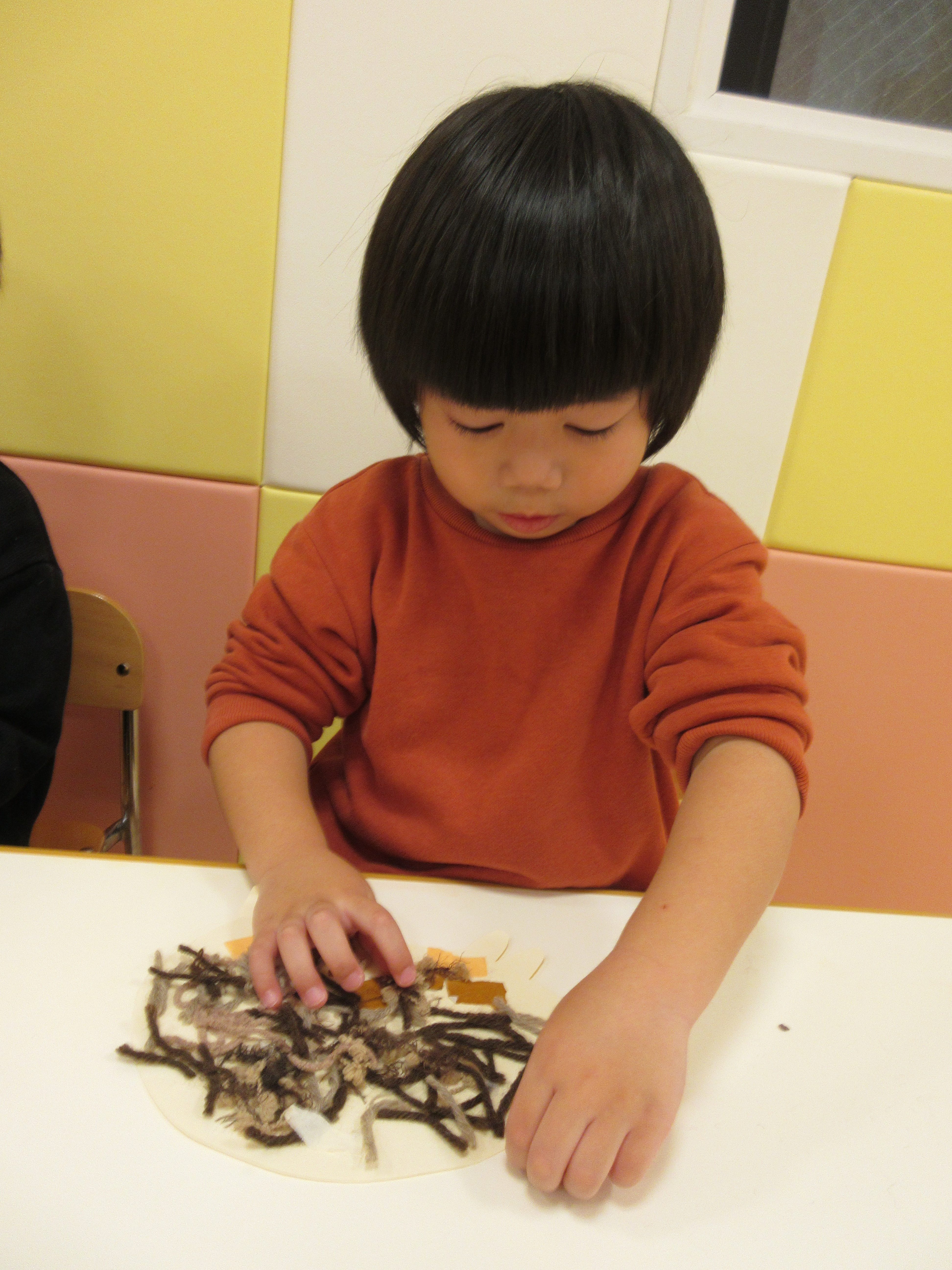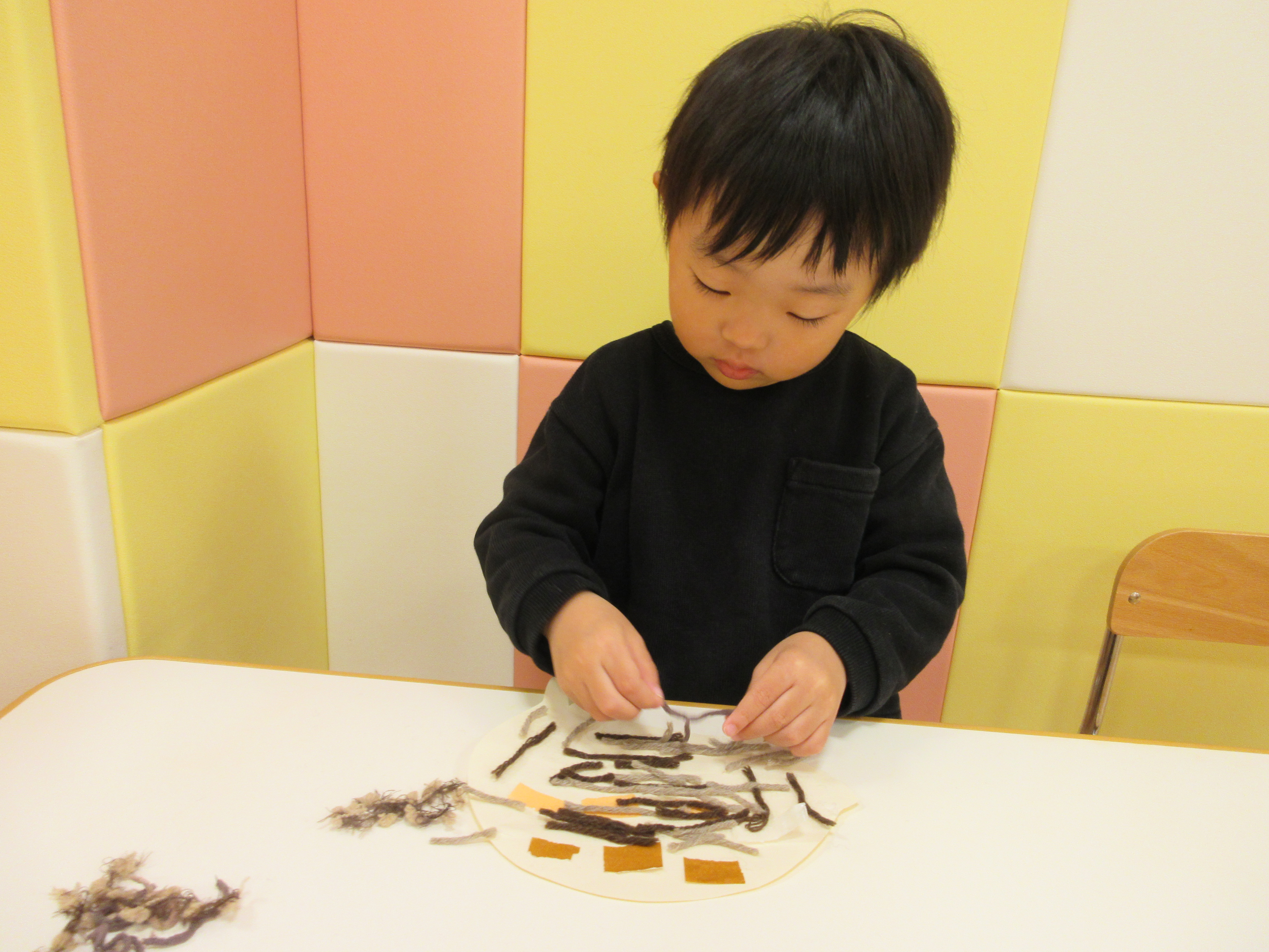 ハサミで折り紙を切った後はハリネズミの身体に折り紙と毛糸を貼っていきます![]()