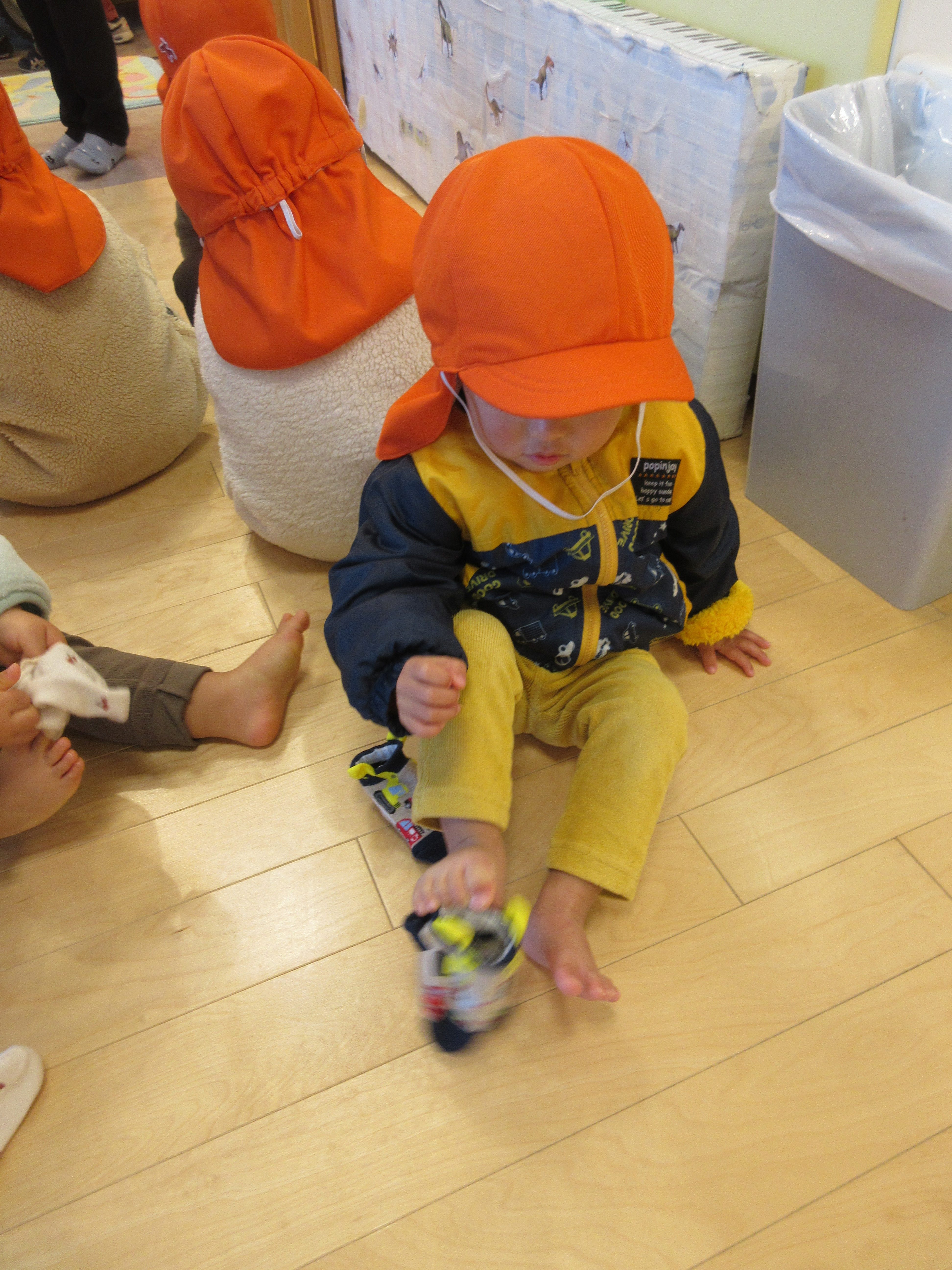 お散歩の準備としては、ジャンバー⇨帽子⇨靴下⇨靴の順番で行っています。