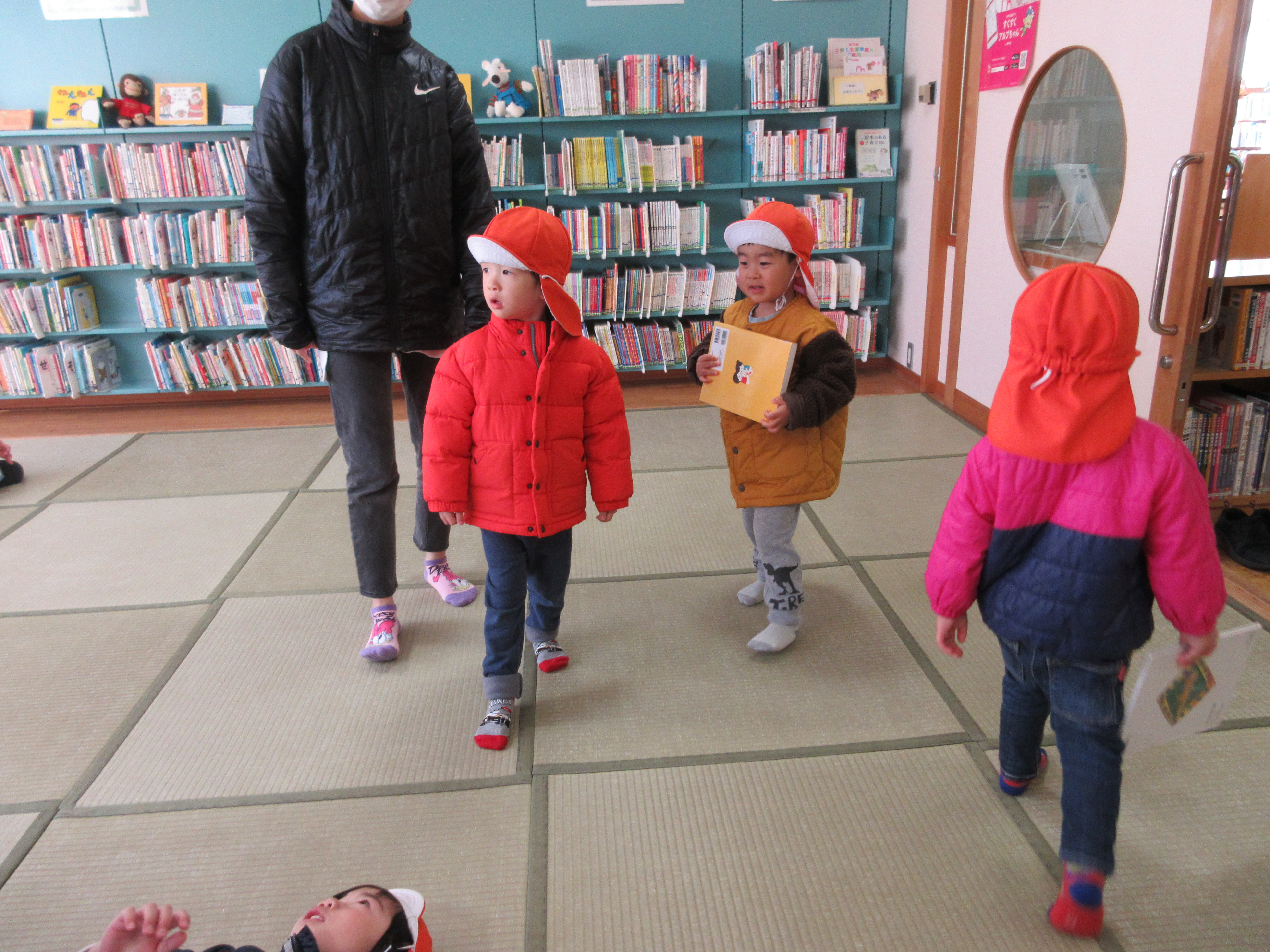 一度みんなで来た場所なので、どこに畳のお部屋があるのか知っている子どもたちは、まっすぐお部屋の方へ向かって、すぐに靴を脱いで絵本を見始めましたよ![]()