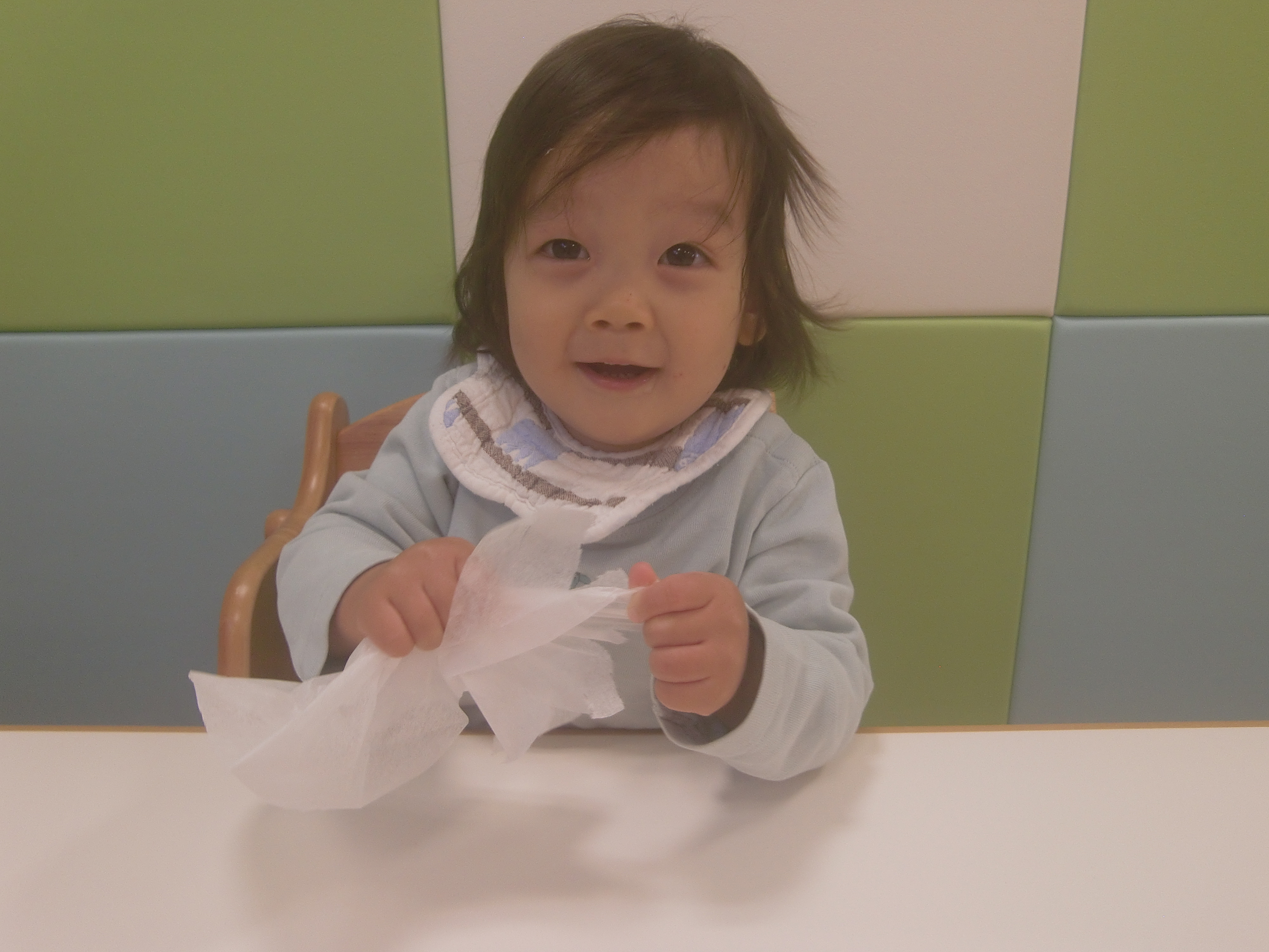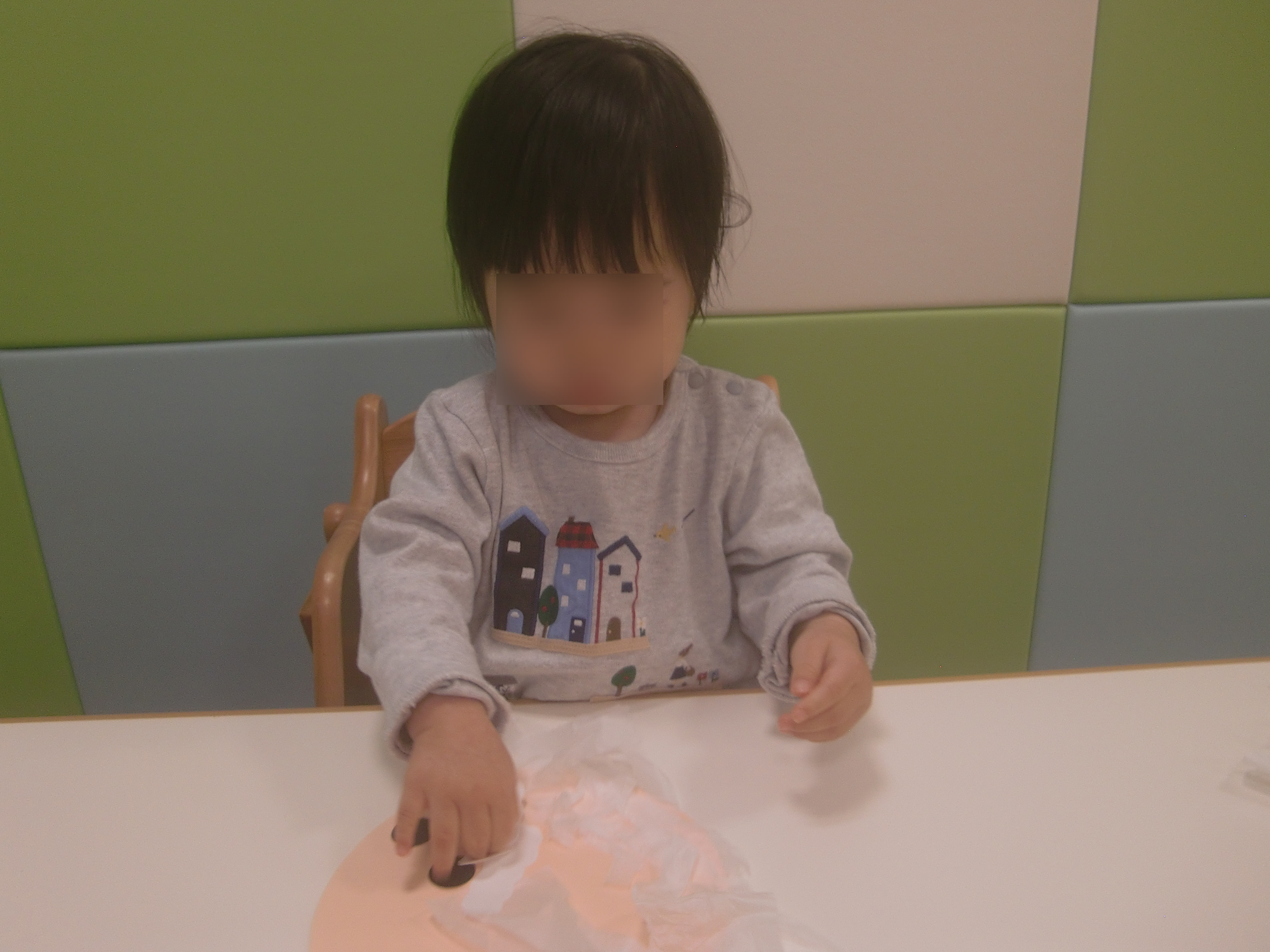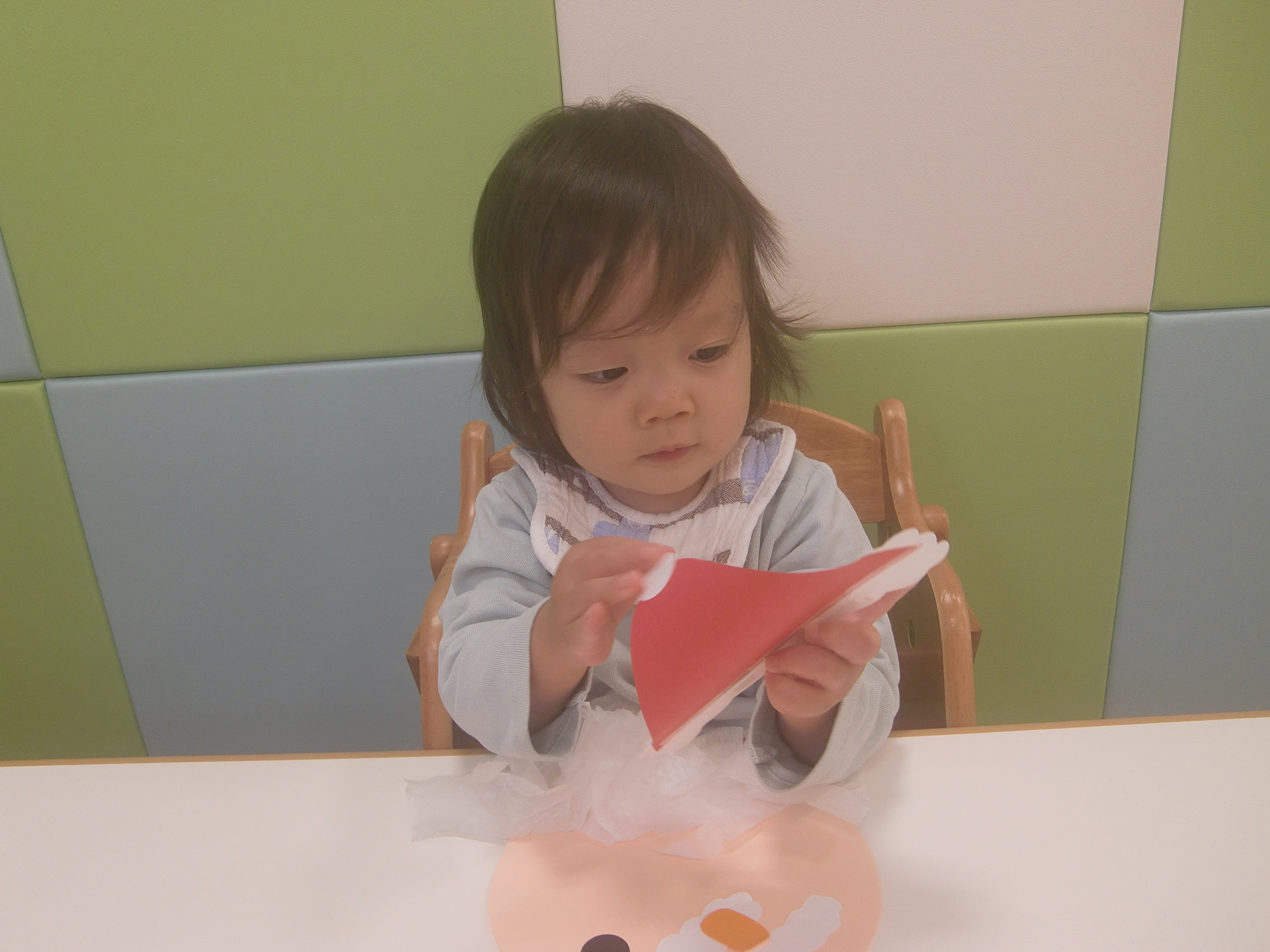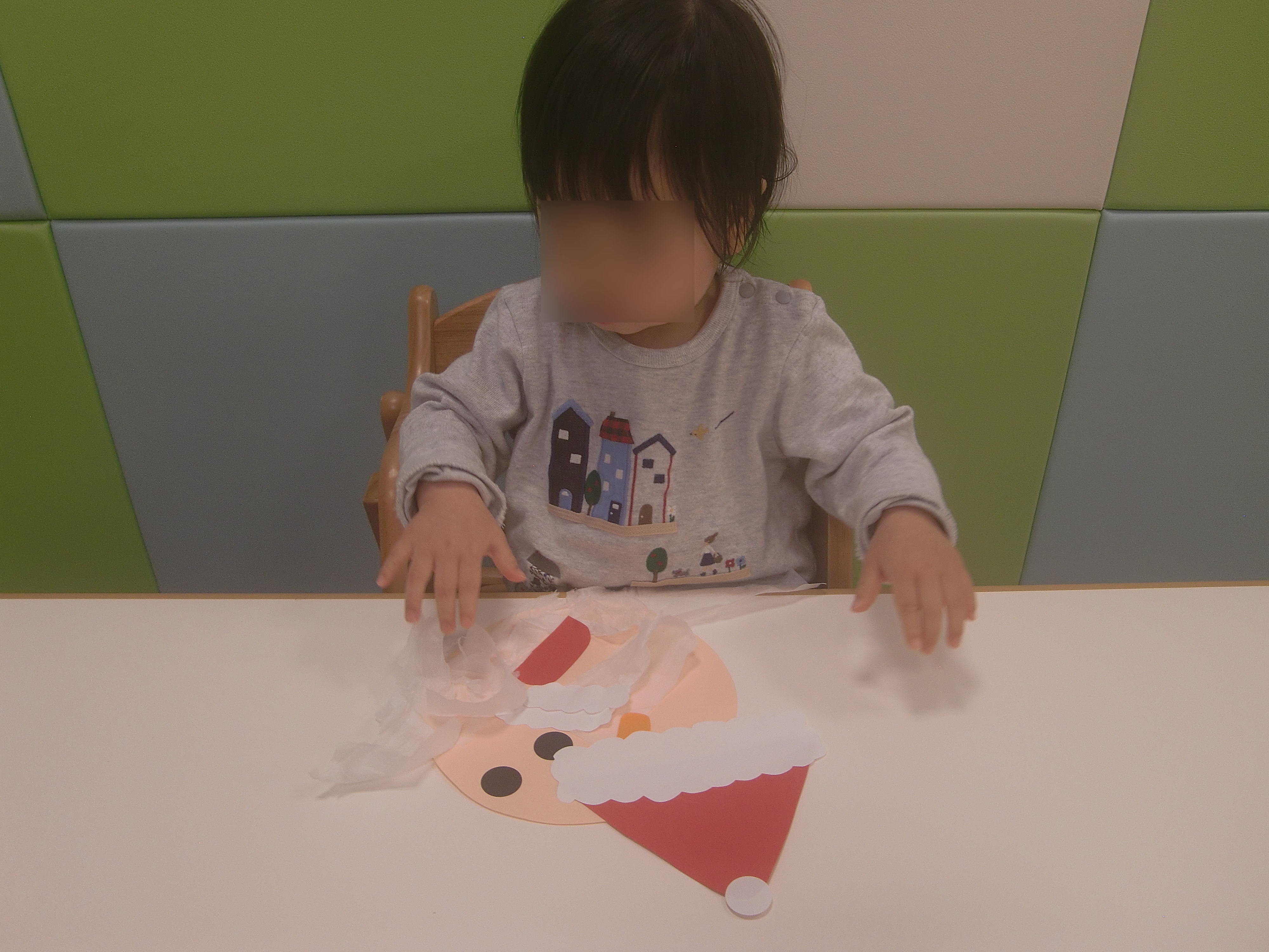 今週は、お花紙を使ってサンタさんのひげを作ってもらい