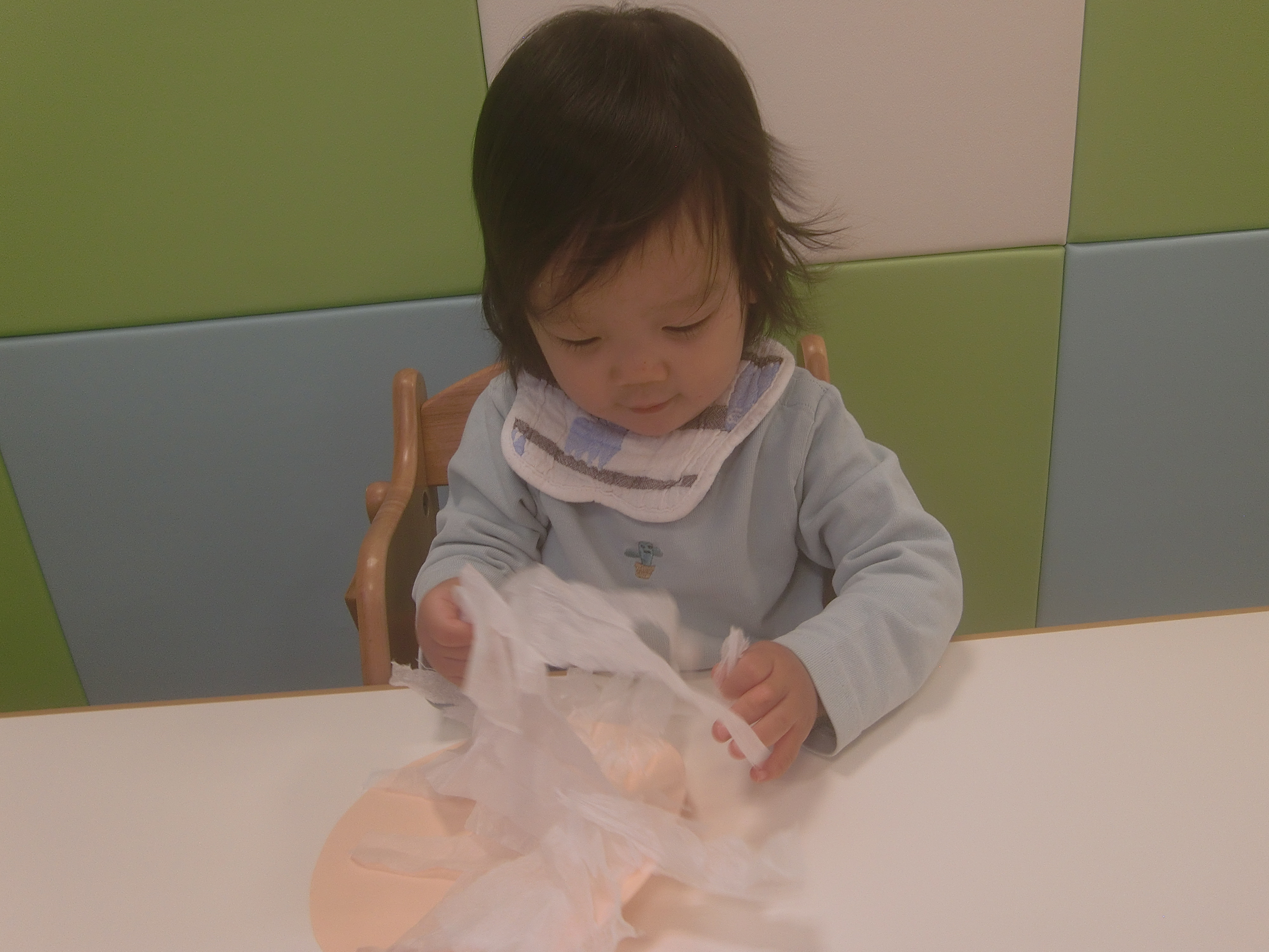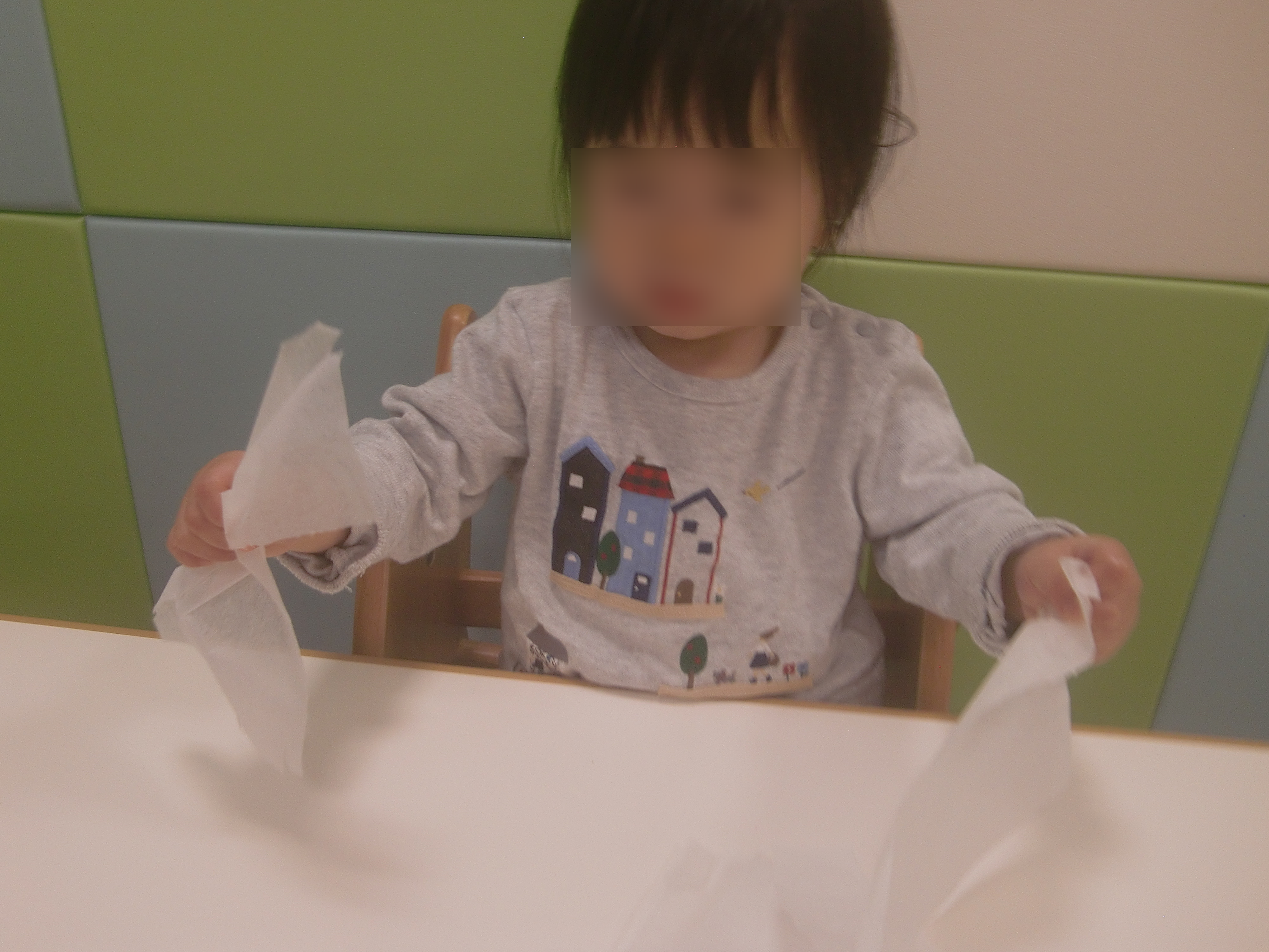 ちぎったお花紙をもしゃもしゃサンタさんのひげにするため、両面テープを貼ってある所へ・・・
