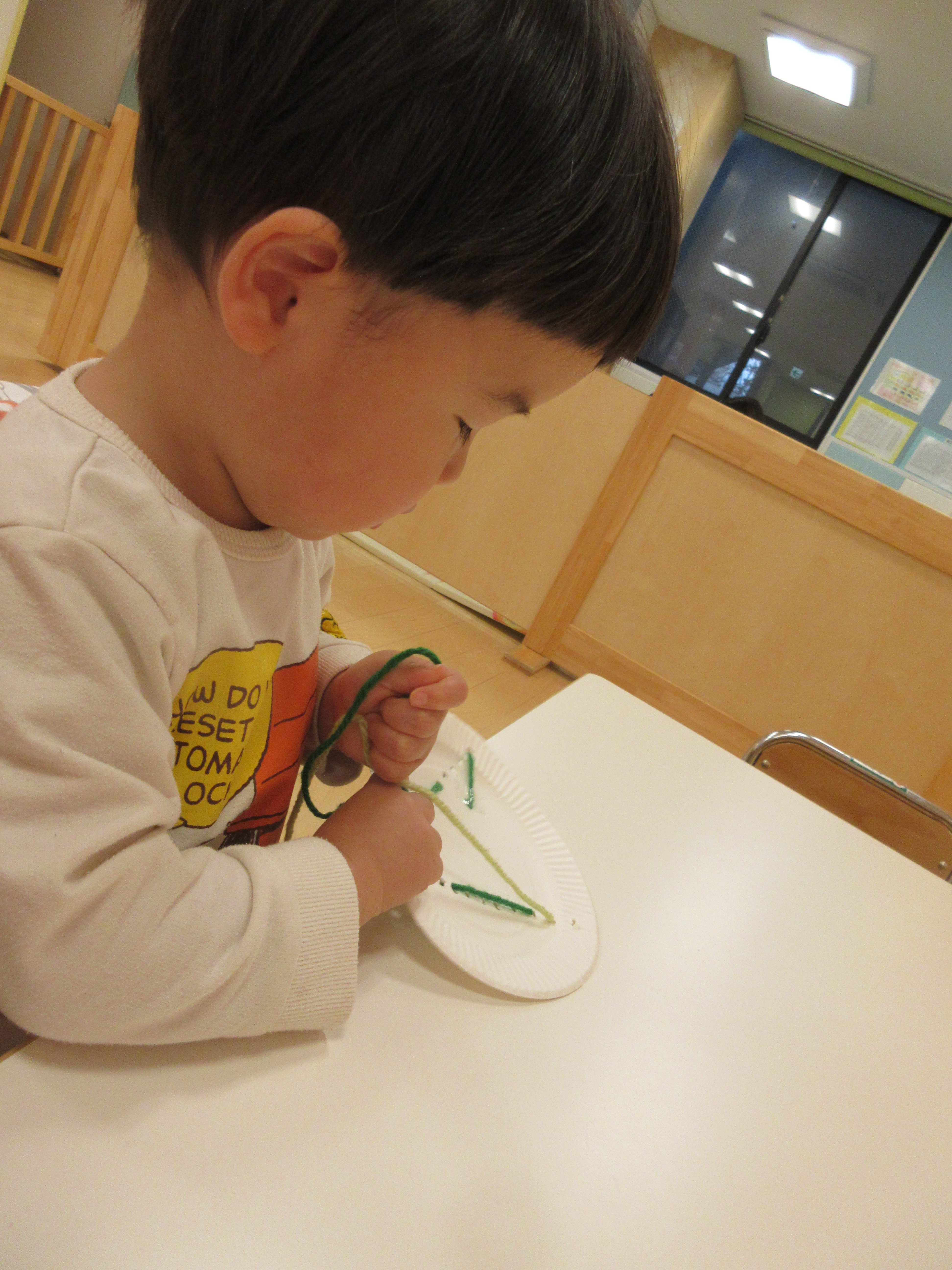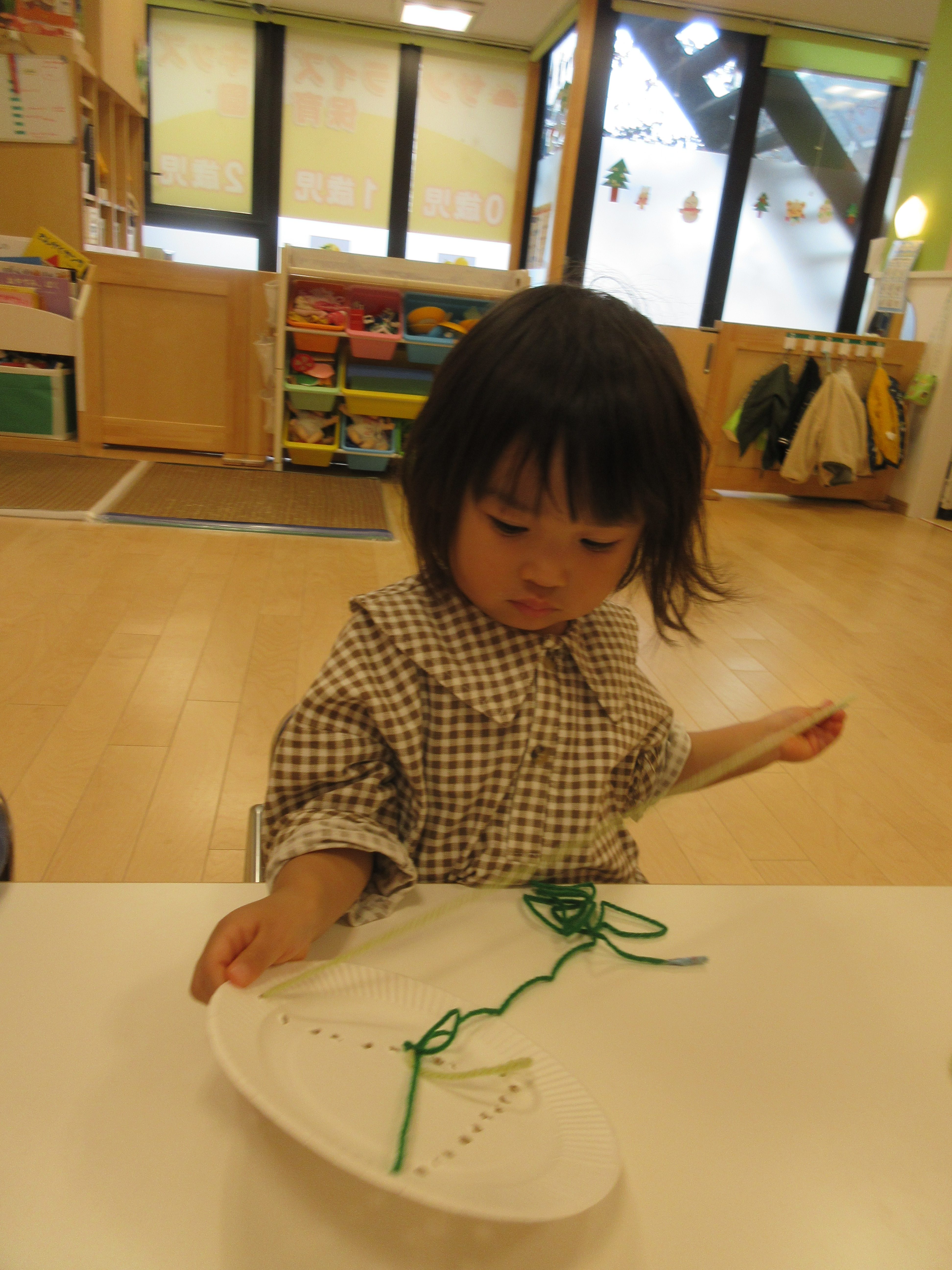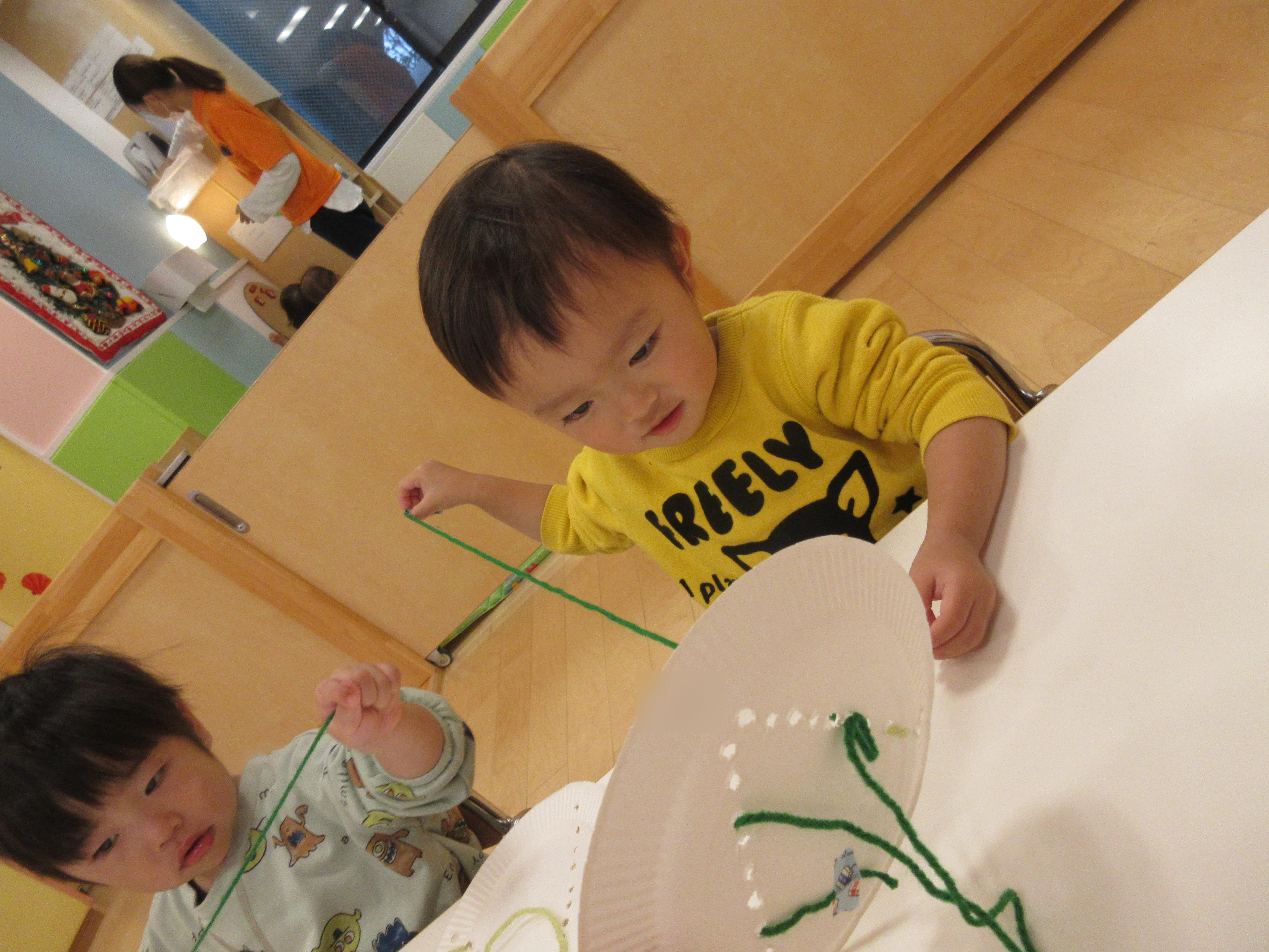 穴に通すのが難しくて「できないよ~」と言いながらもまずは自分で頑張る子どもたち![]()