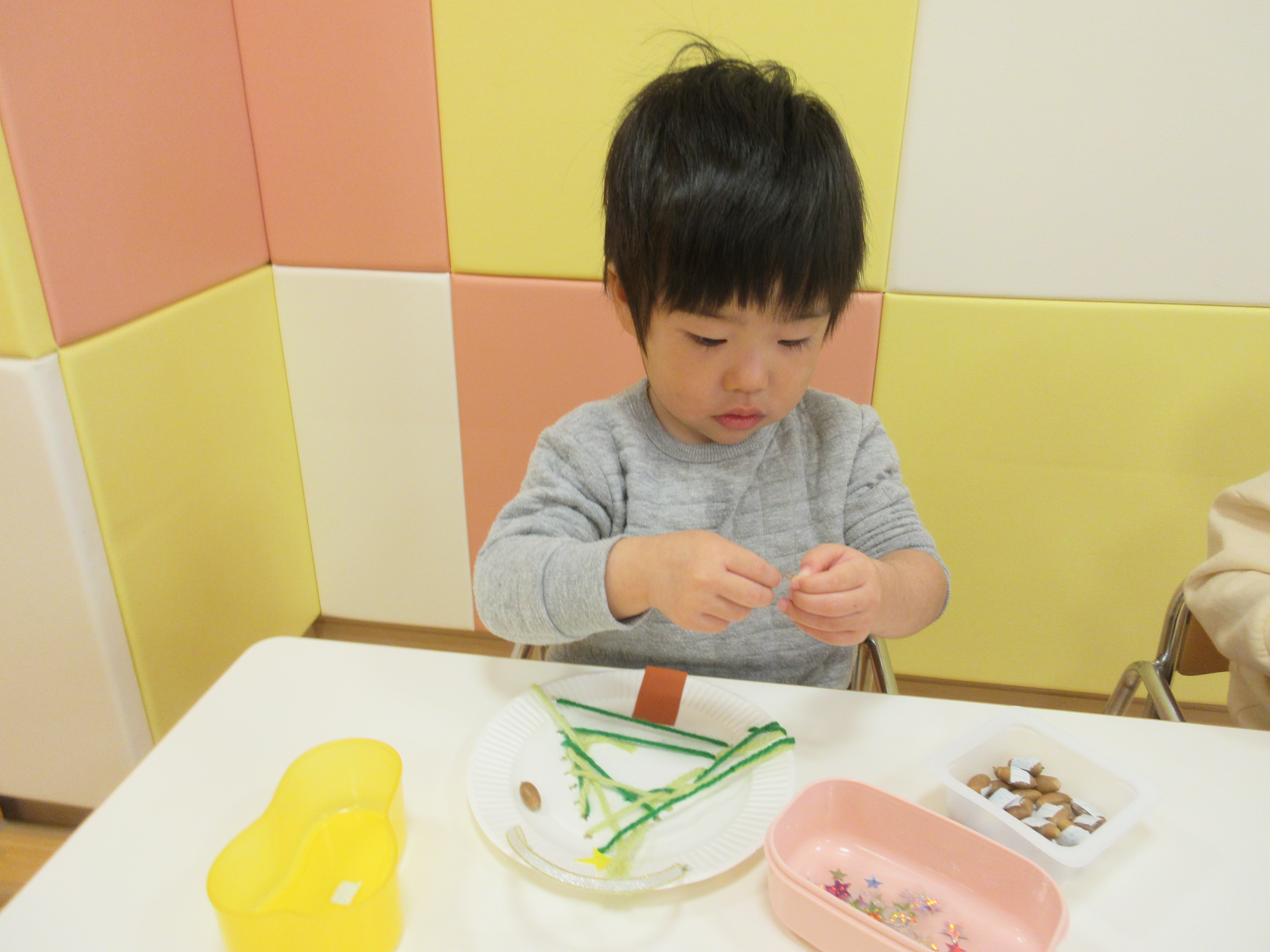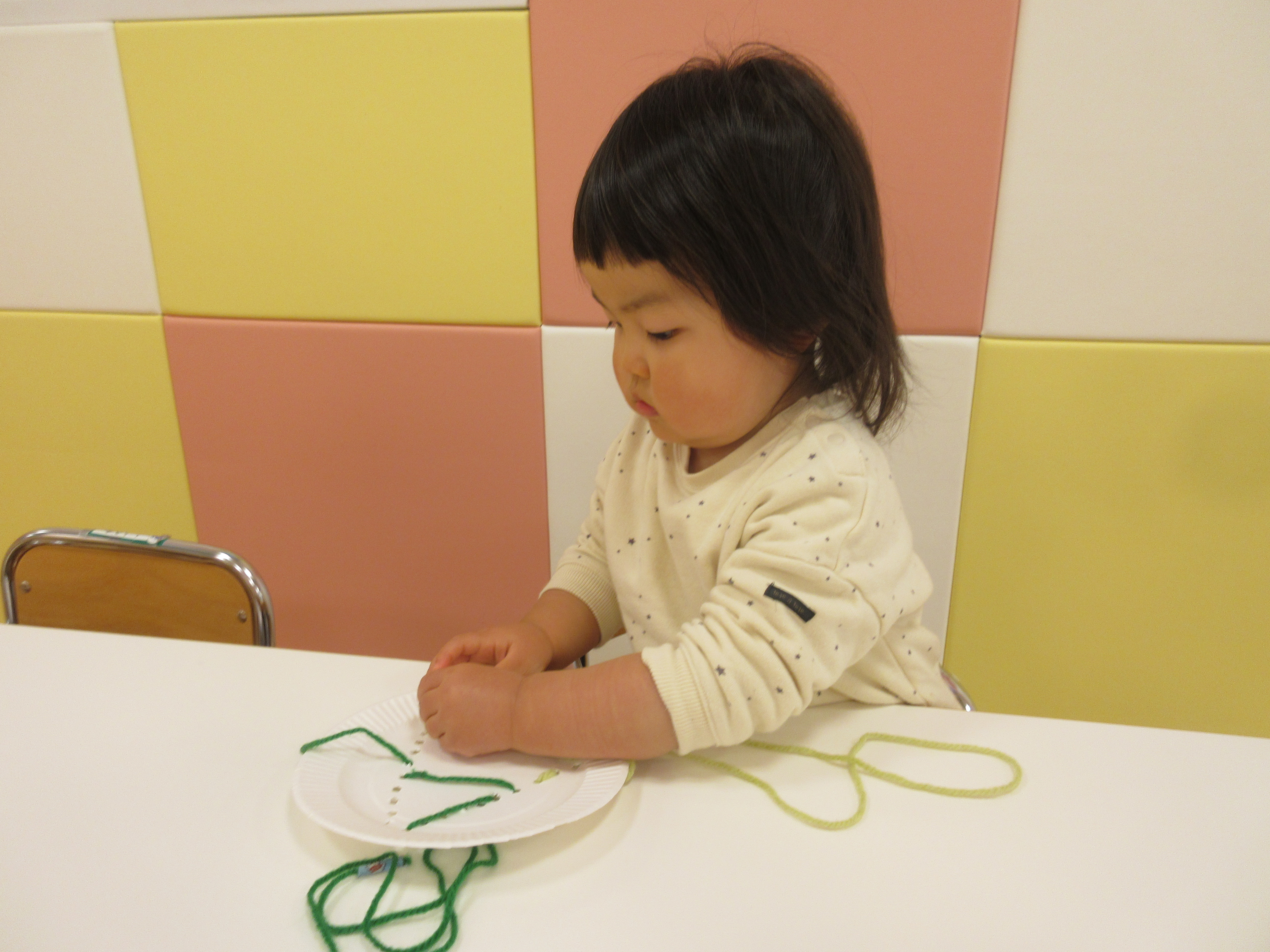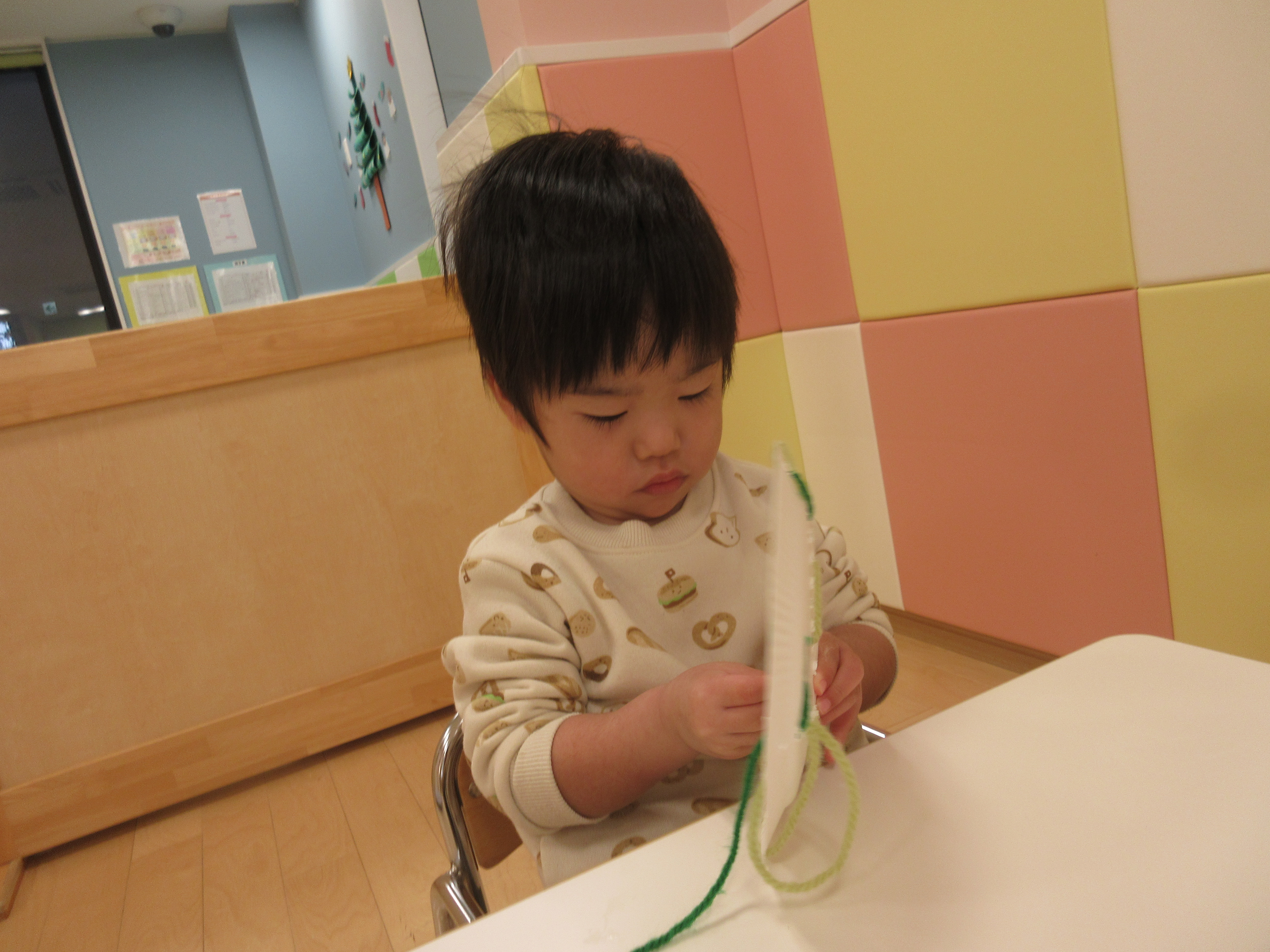穴に通すのが難しくて「できないよ~」と言いながらもまずは自分で頑張る子どもたち![]()