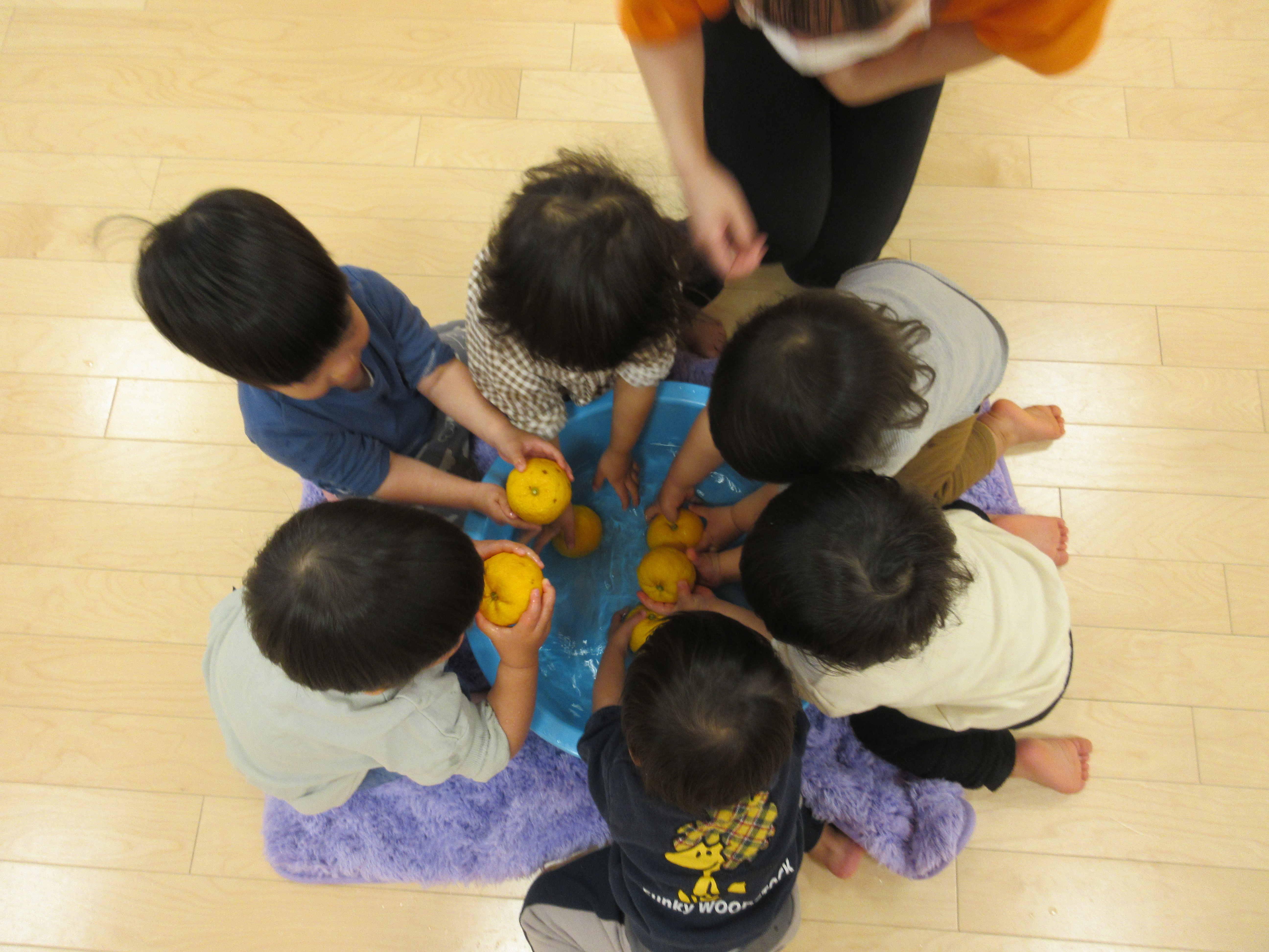 ぷかぷかと浮かぶゆずを嬉しそうに触り、綺麗に洗っている子もいましたよ![]()