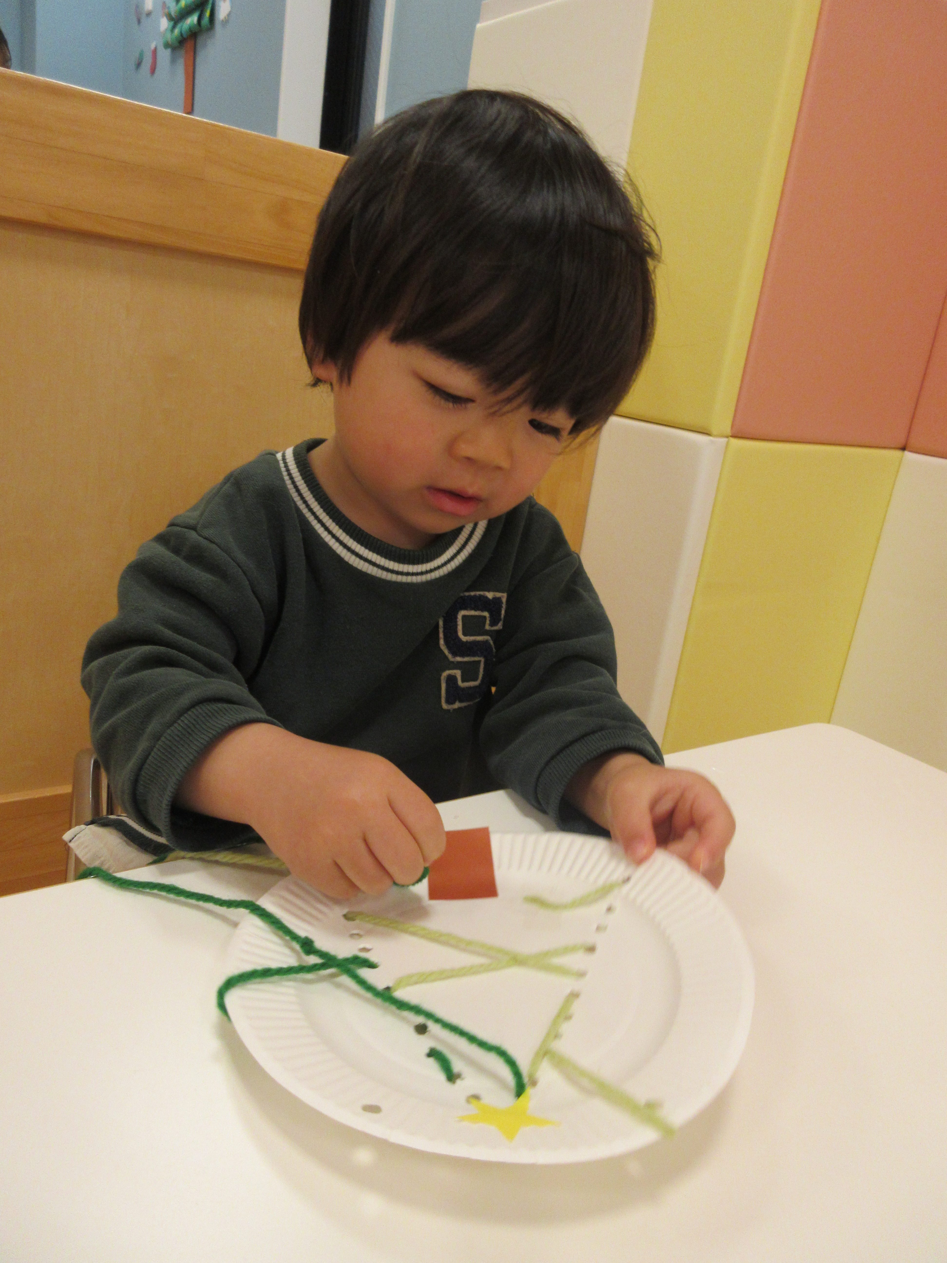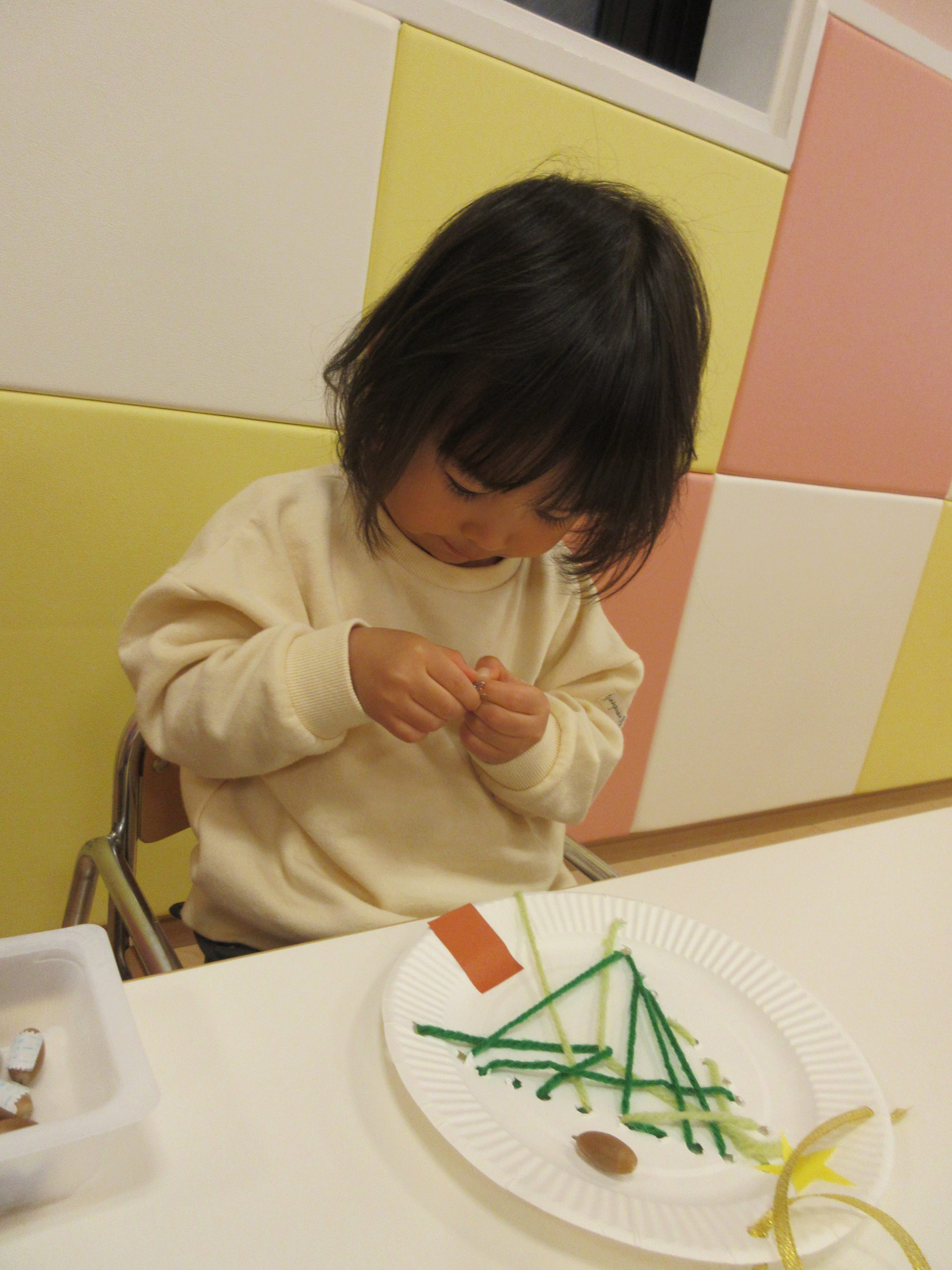 紙皿と毛糸でまずはクリスマスツリーの形作り![]()
