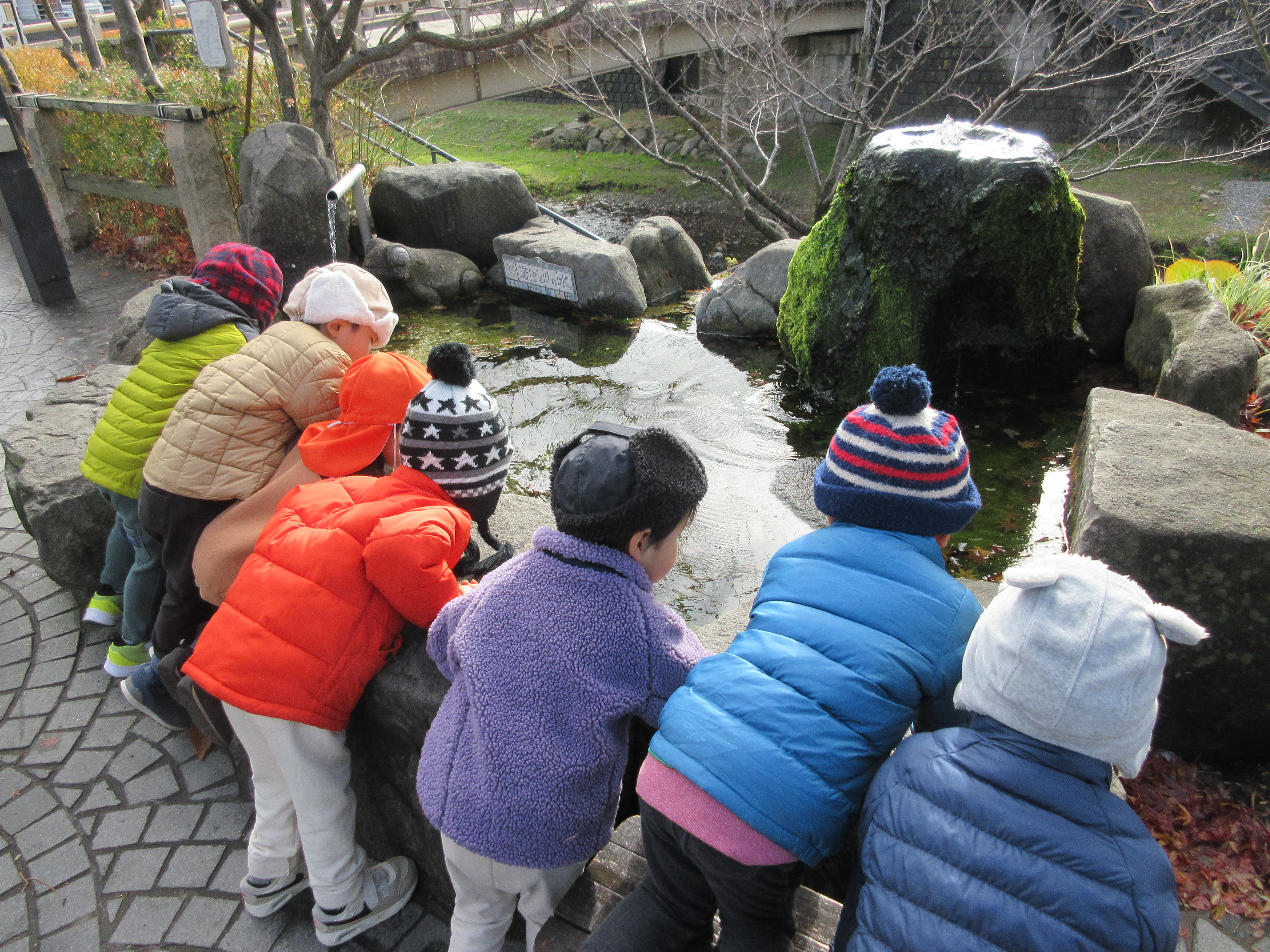 ⇩また、縄手通りにある「若返りの水」では、仲良く水の中を覗き込んで観察を楽しむ子どもたち。