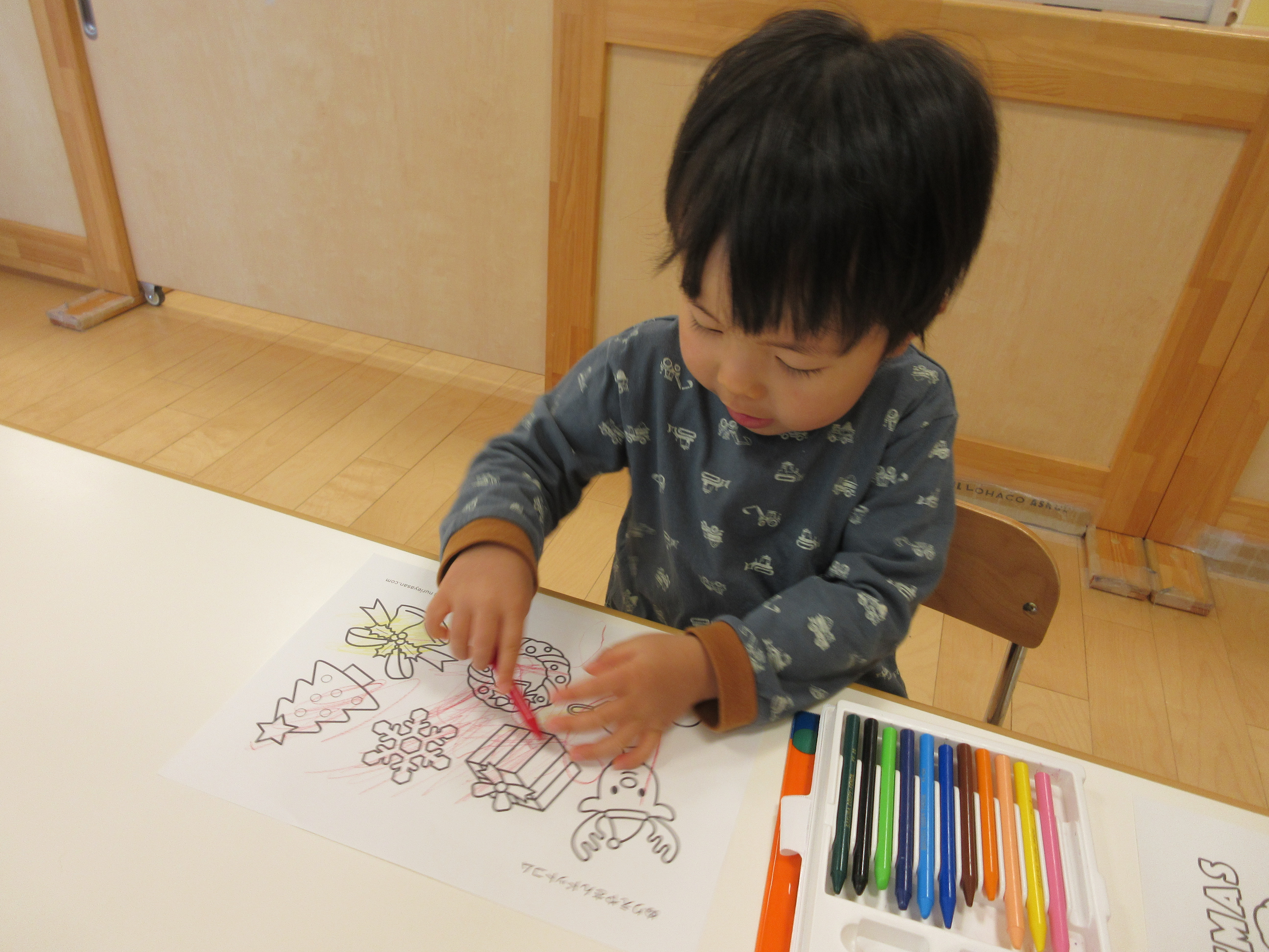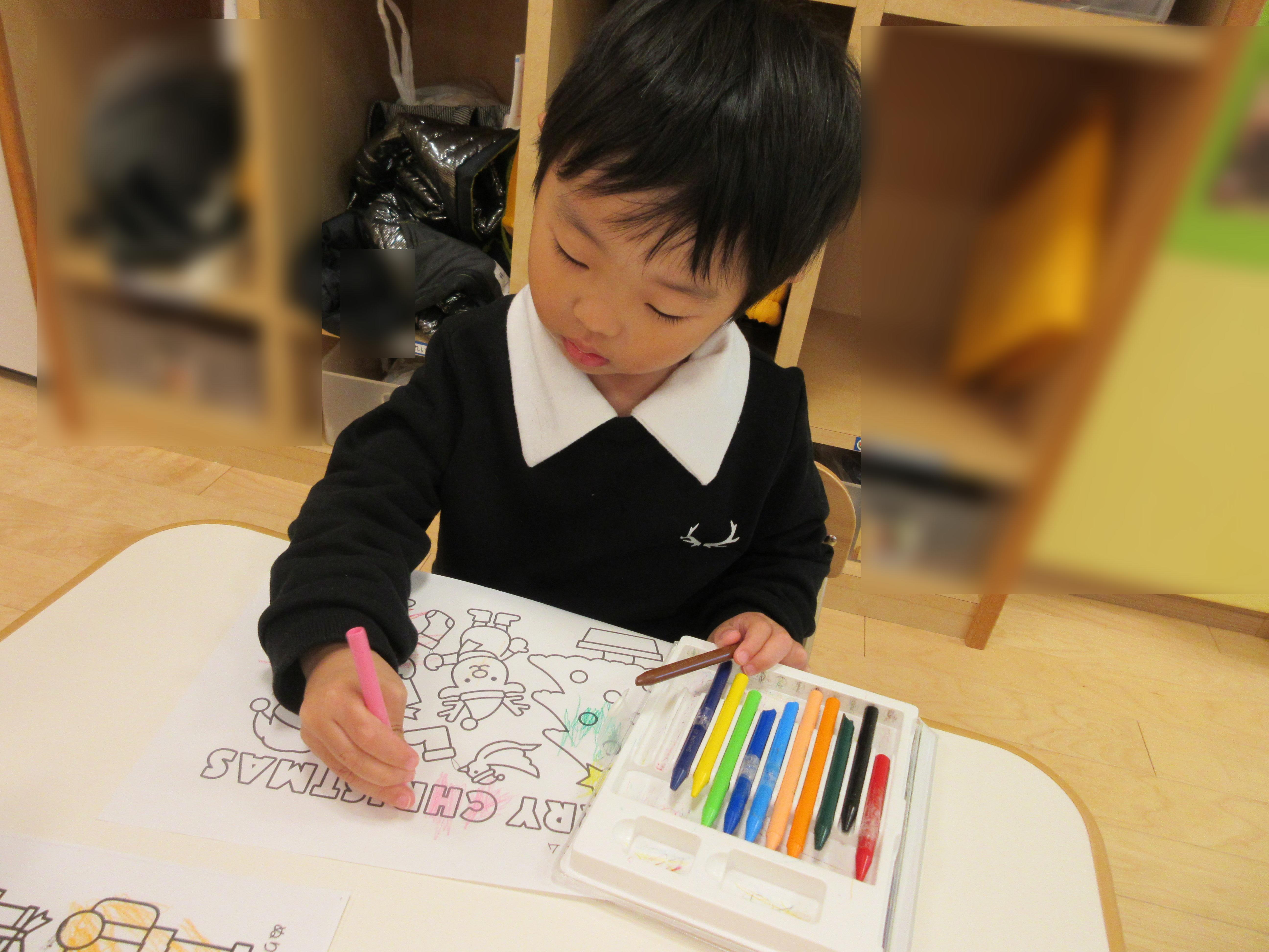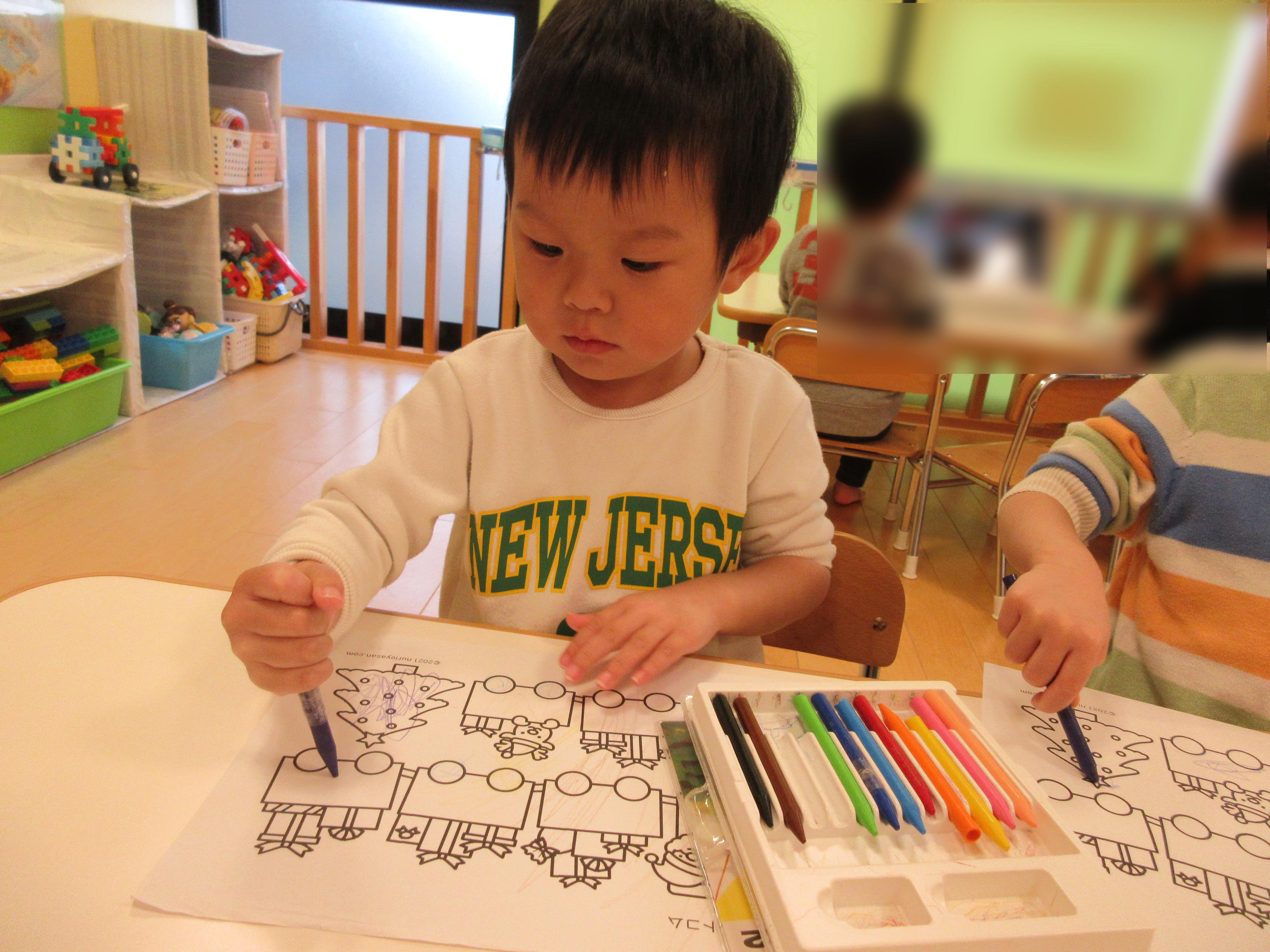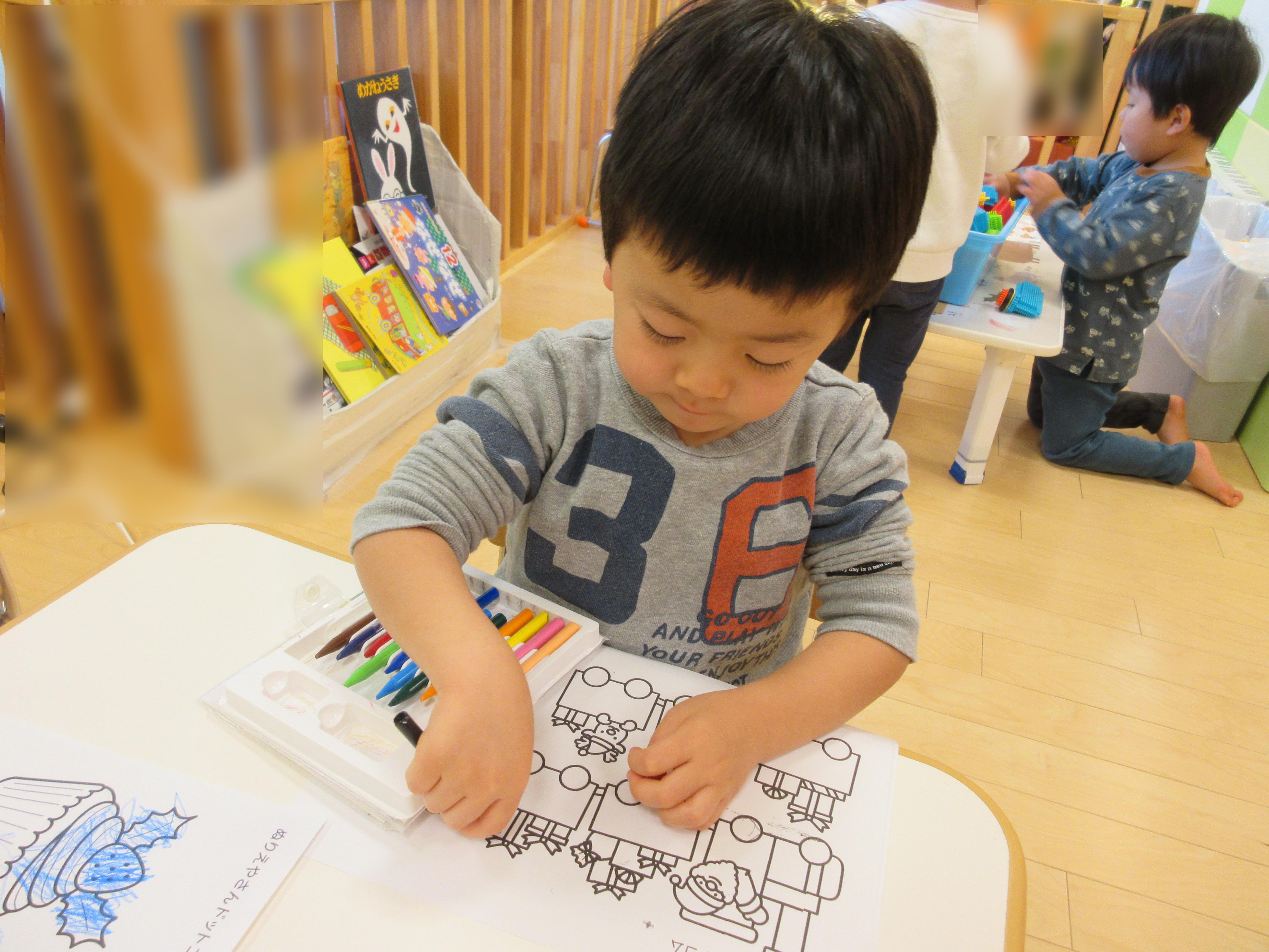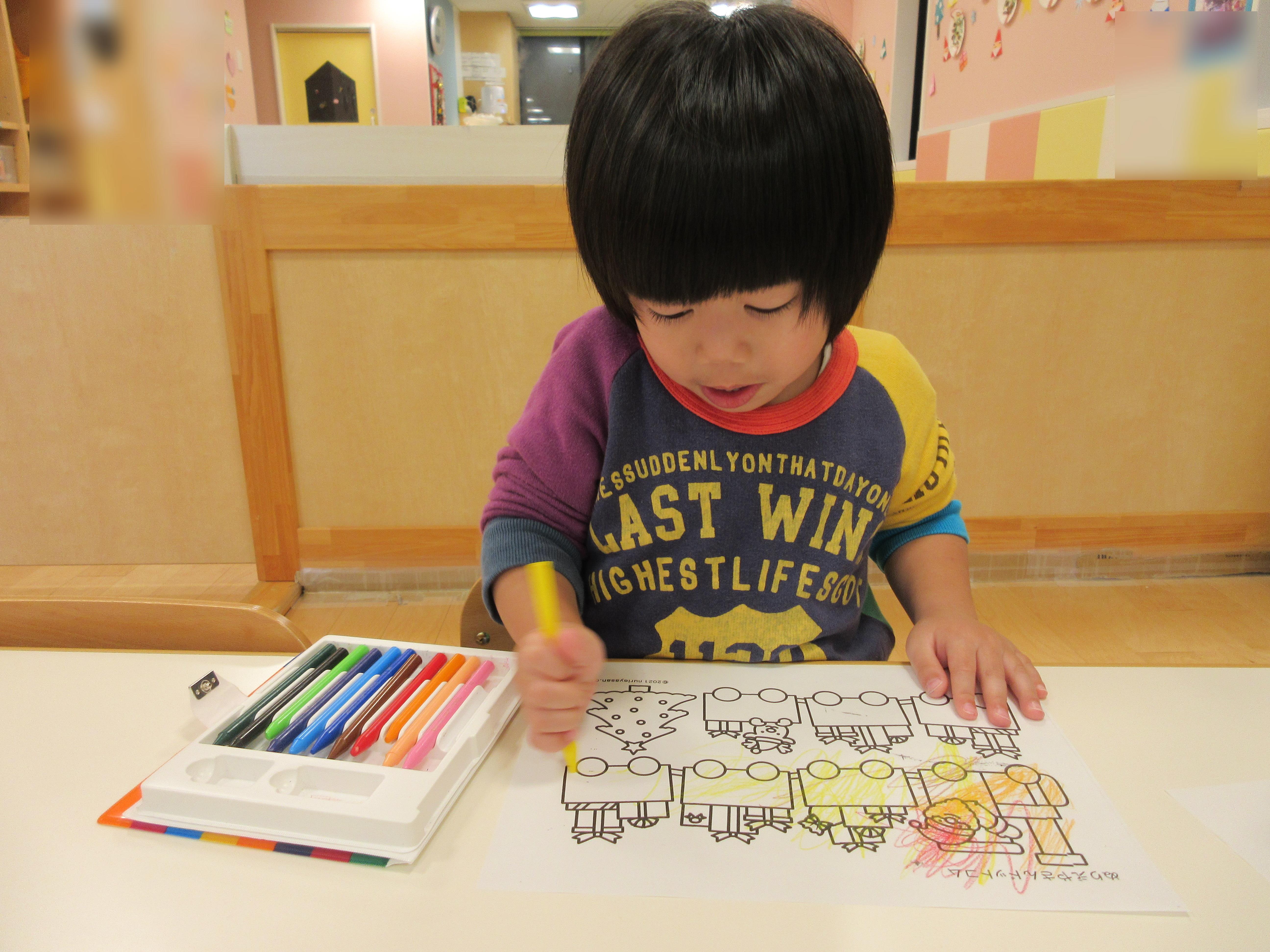 ⇩それぞれ好きな絵柄の塗り絵を選んで塗りました。上手にサンタの列車の中を塗っていた子、