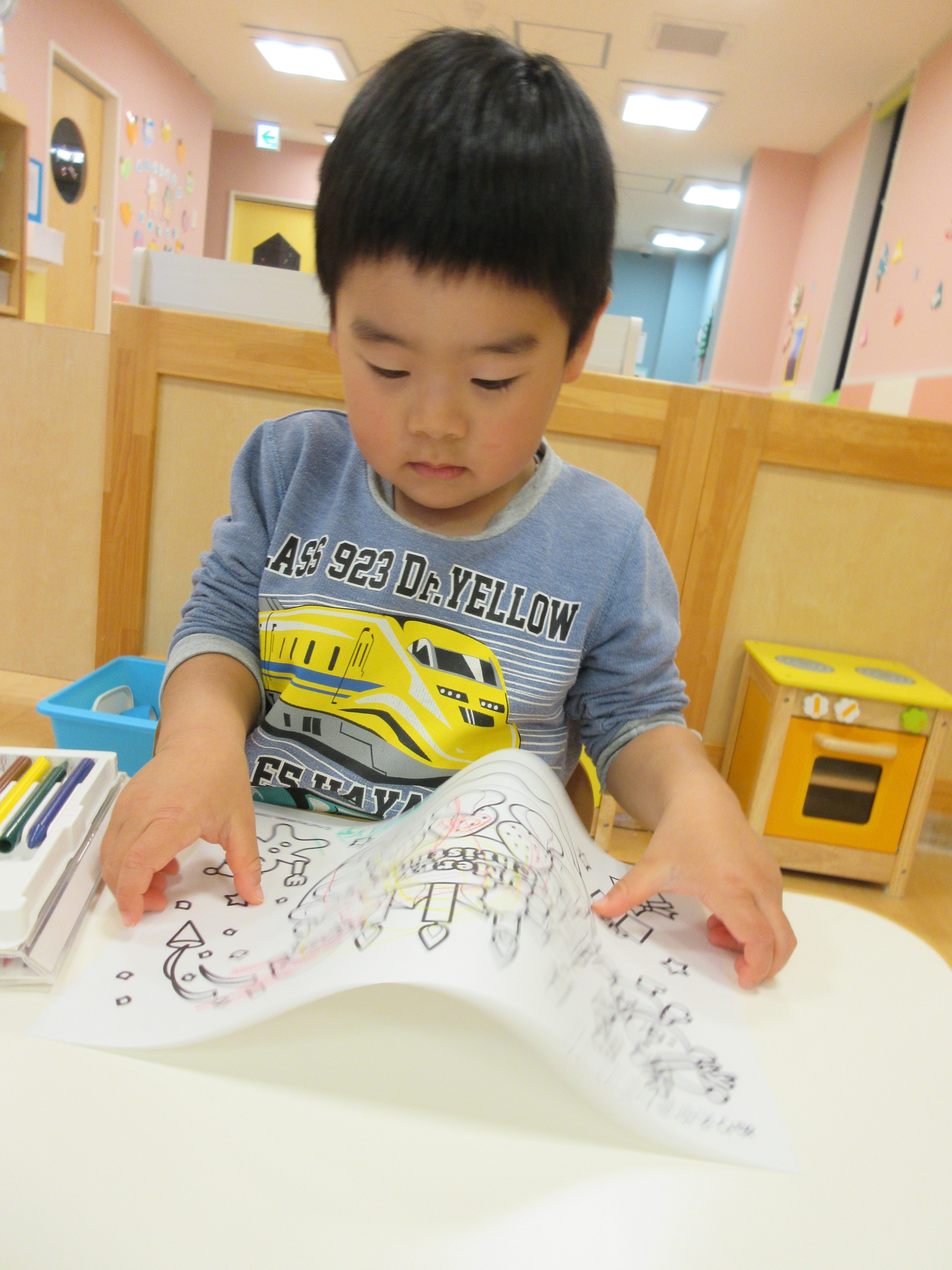 ⇩また、塗り終わると真剣に塗り絵を観察していた子、