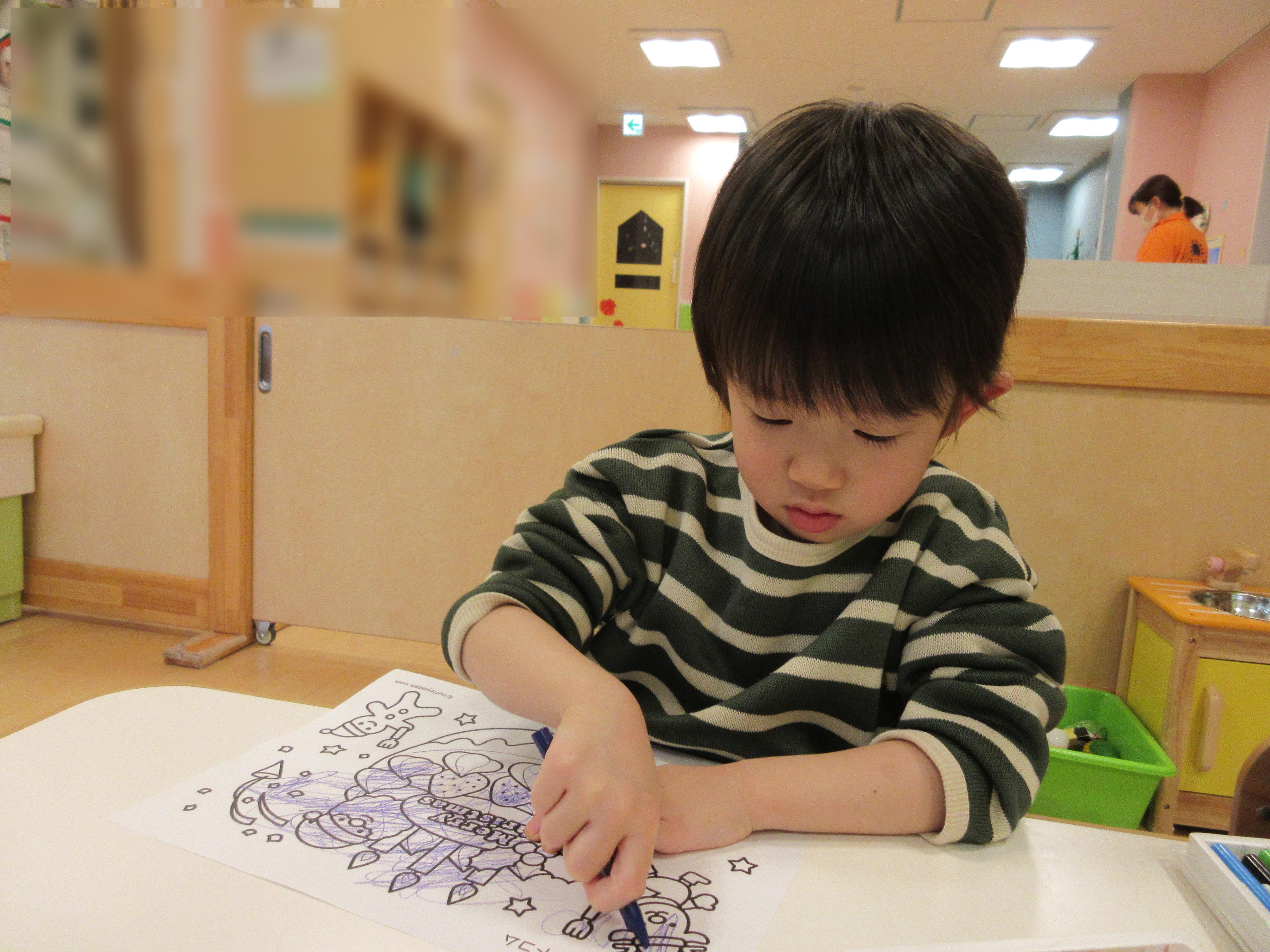 ⇩隣に座っていた友だちと仲良く同じ色を使って塗っていた子、