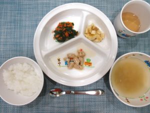 (写真は離乳食後期です。年齢によって盛り付け量を変えて提供しています。)