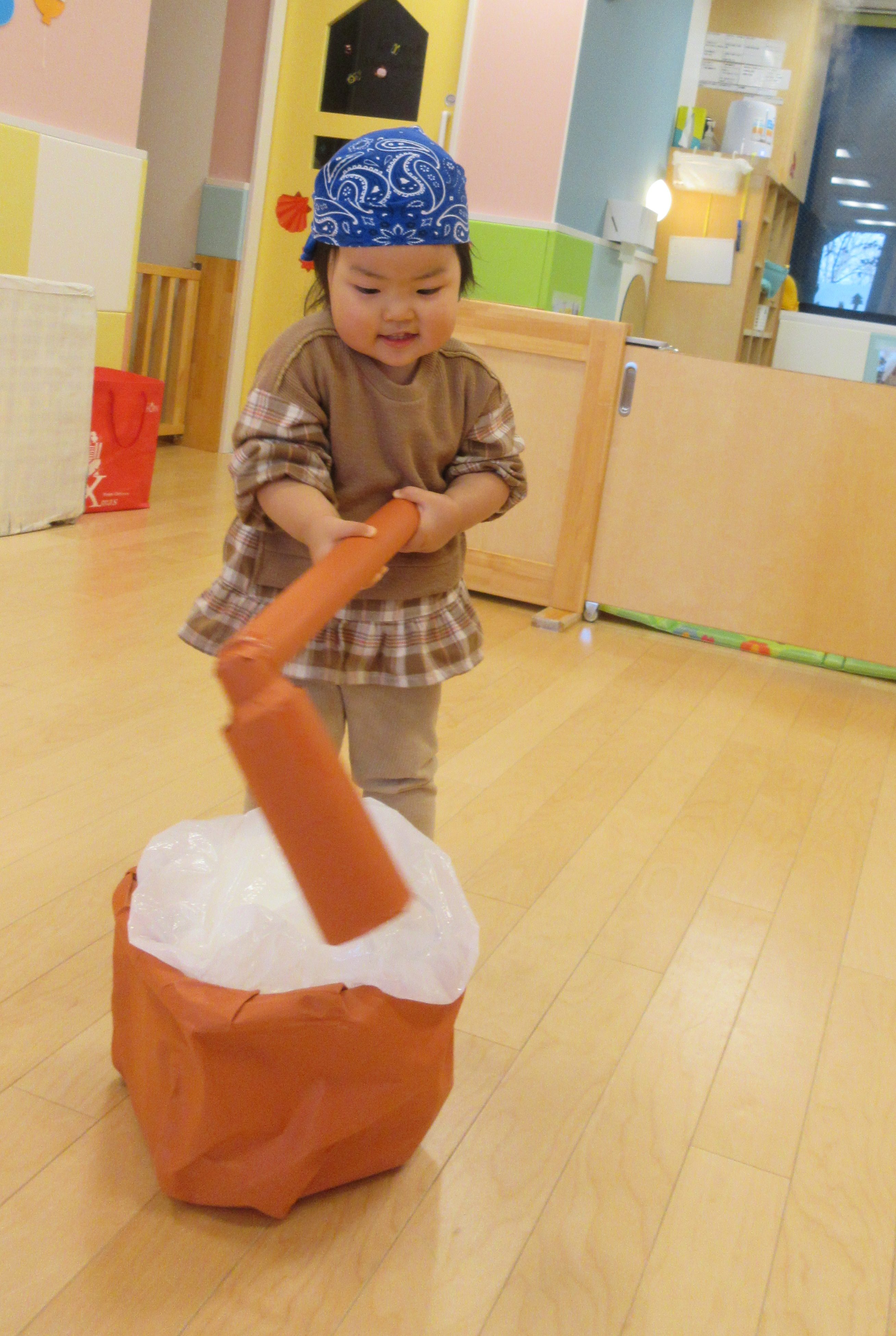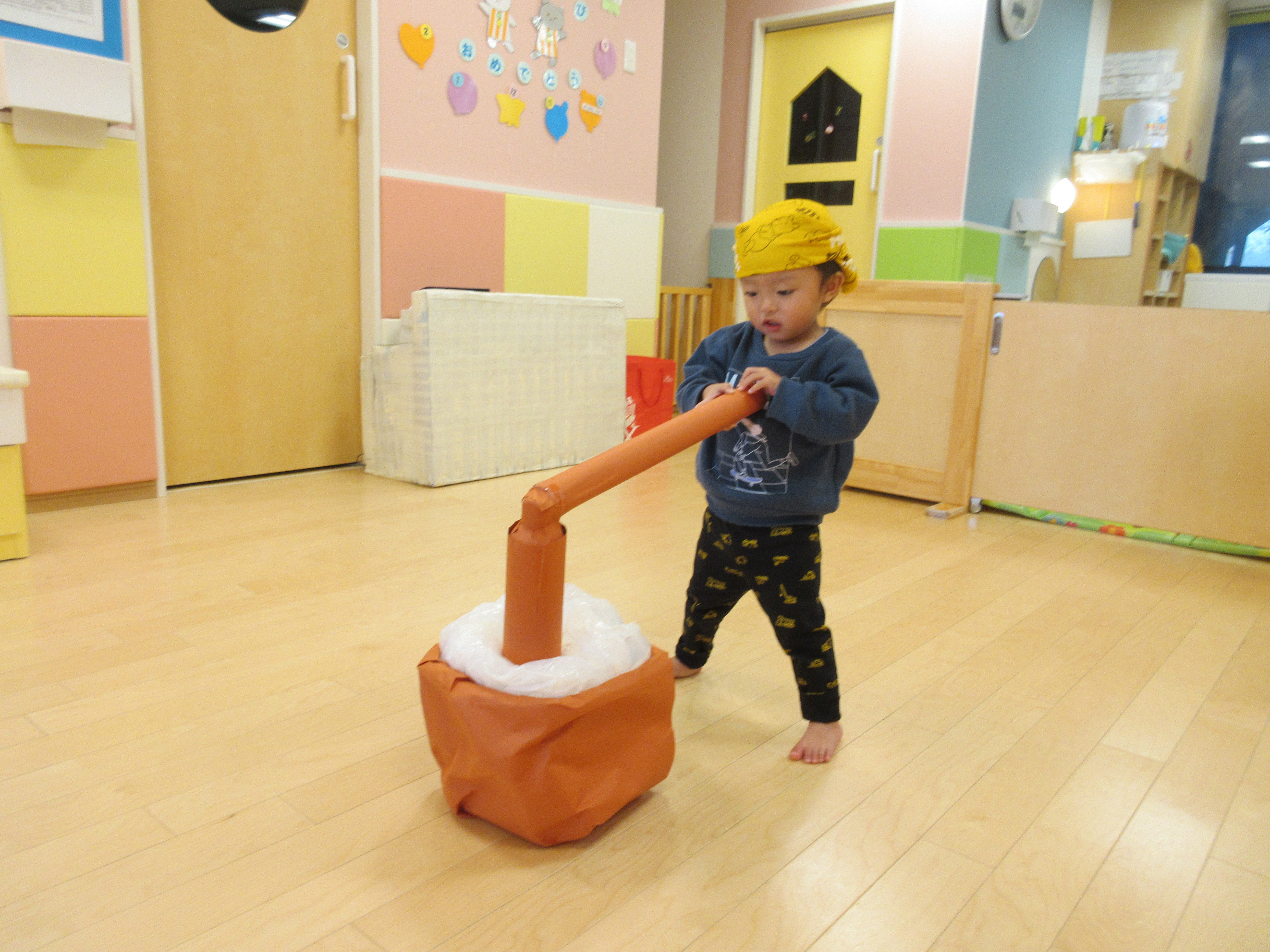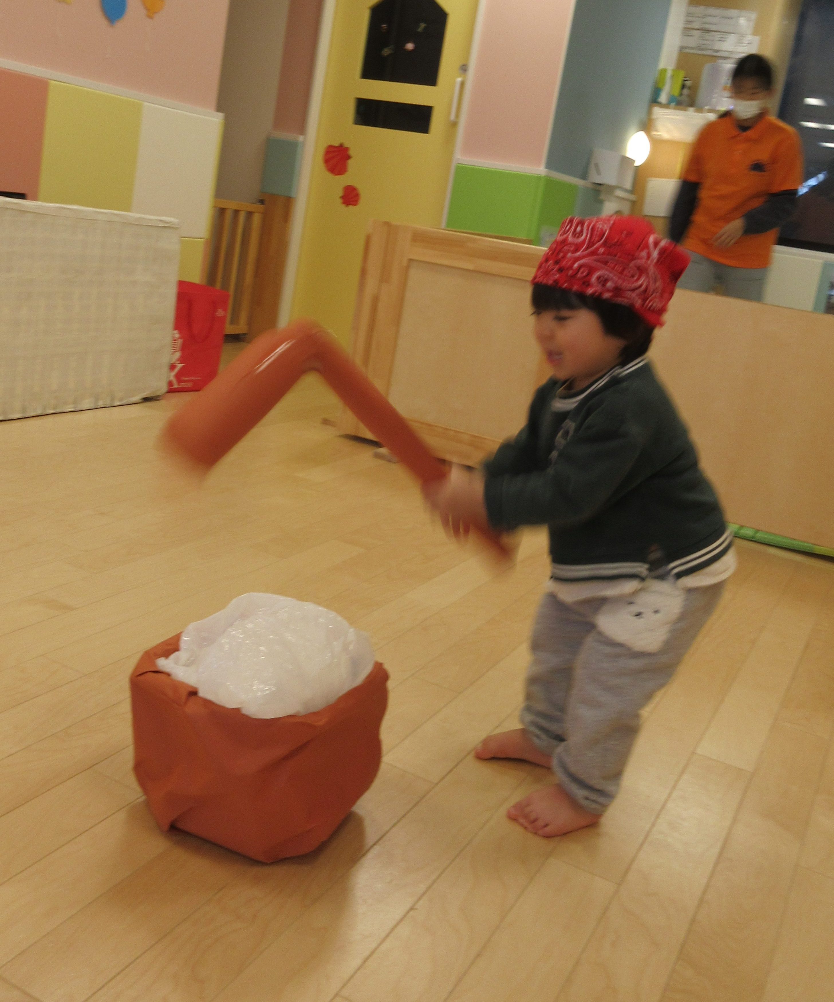 餅つきごっこでは、頭にバンダナを巻いて気合十分![]()