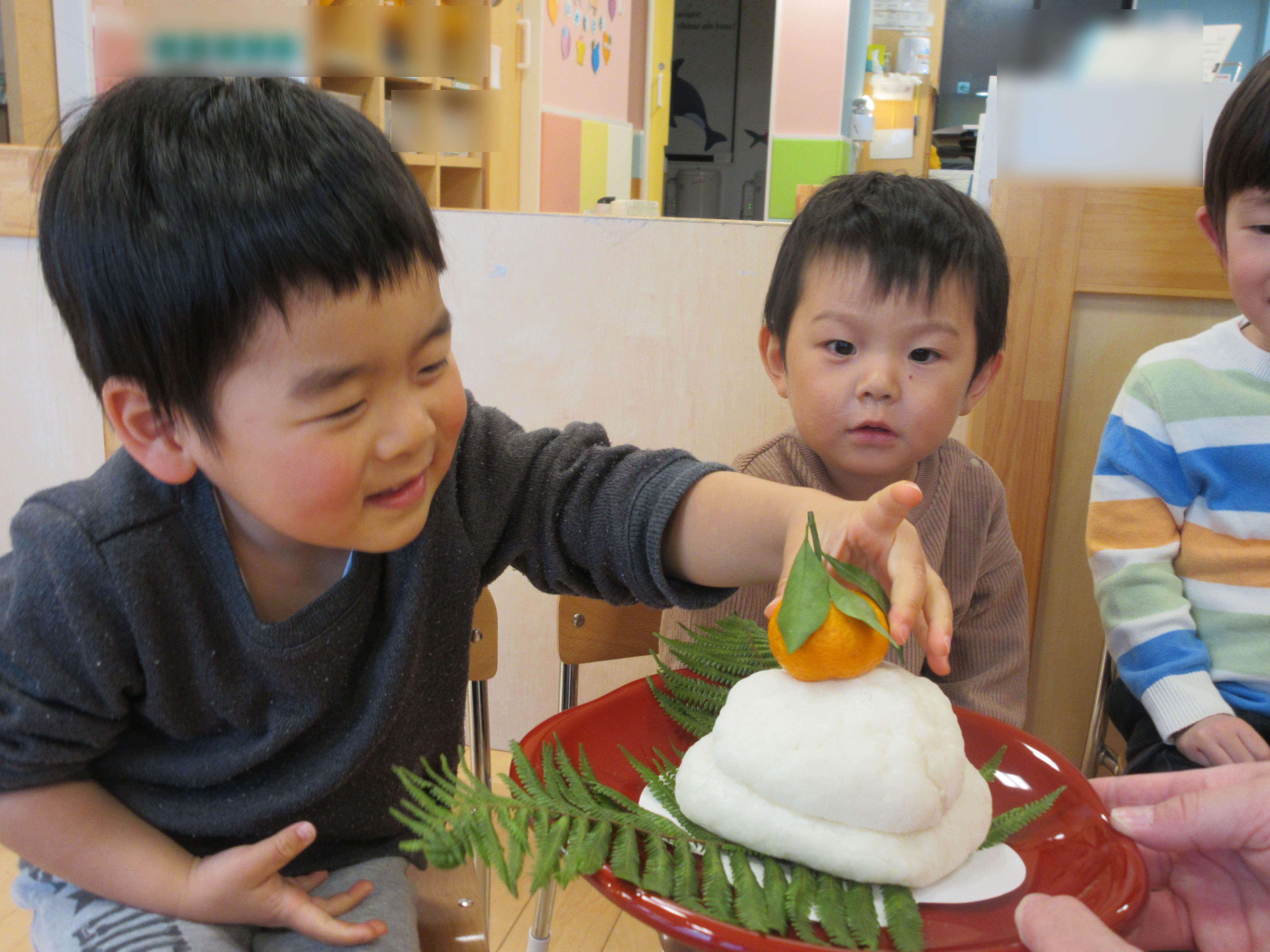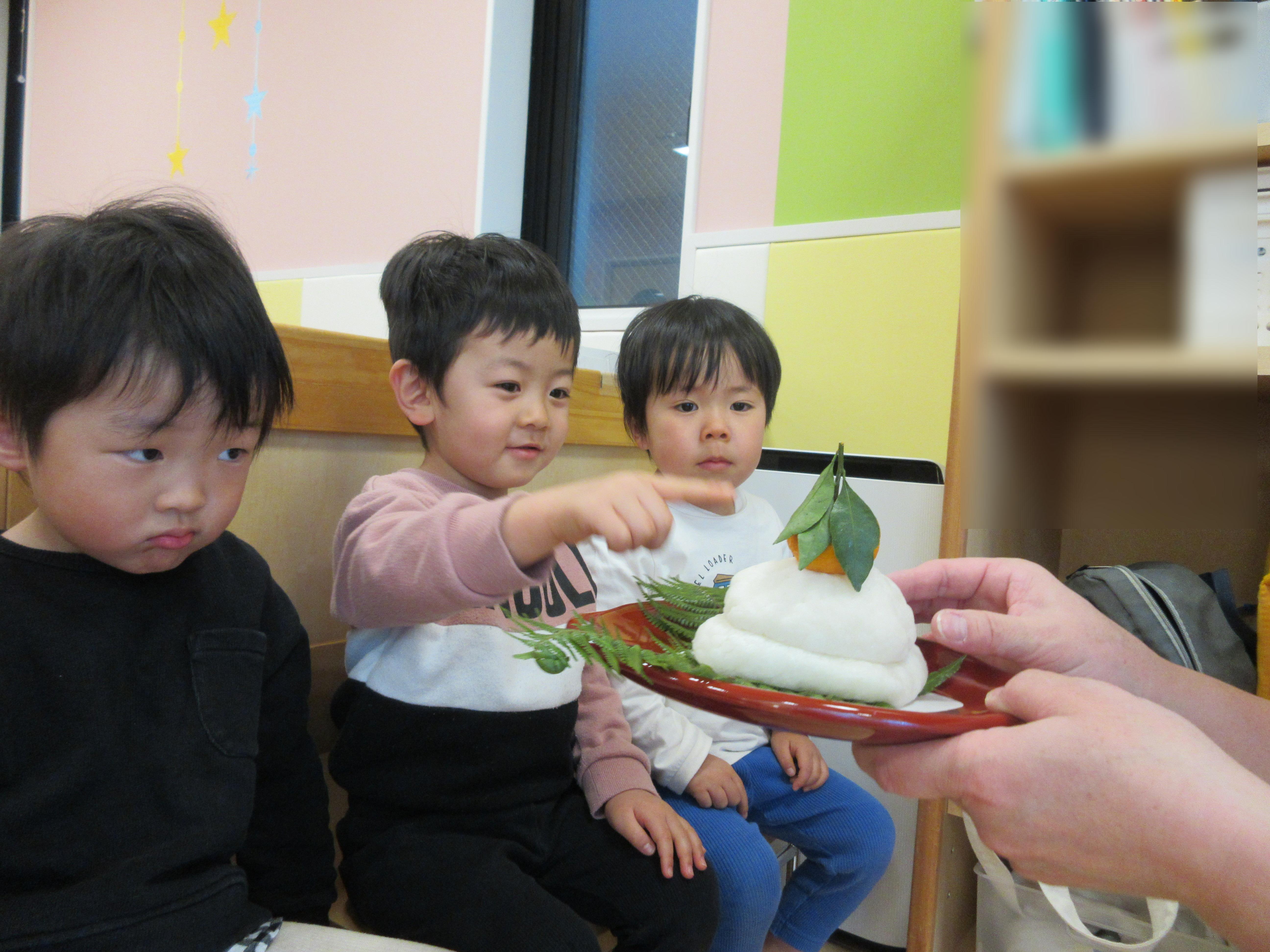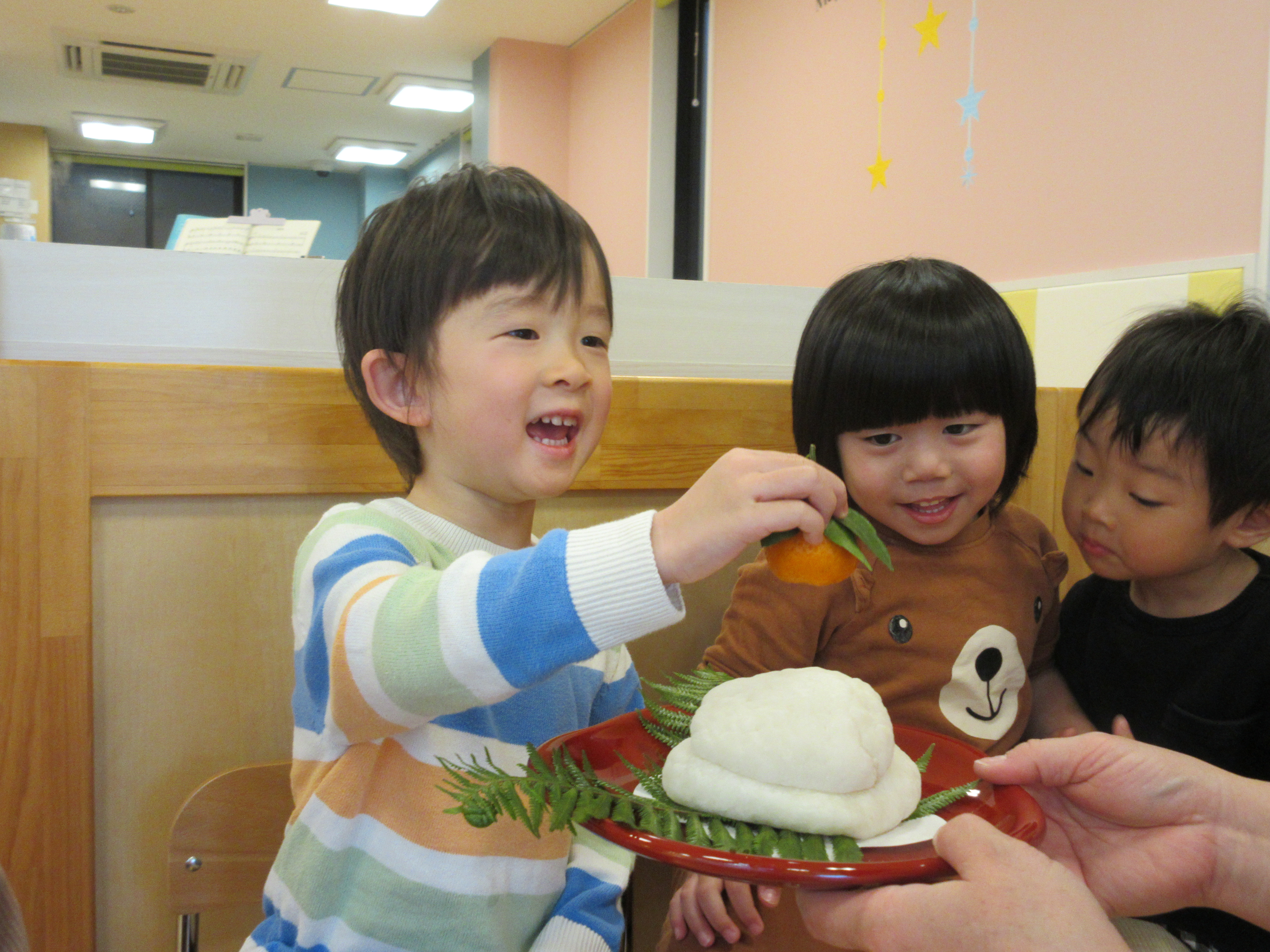 今回の鏡餅は保育園の玄関に飾らせていただきましたので、登園時や降園時に見ていただけたらと思います![]()
