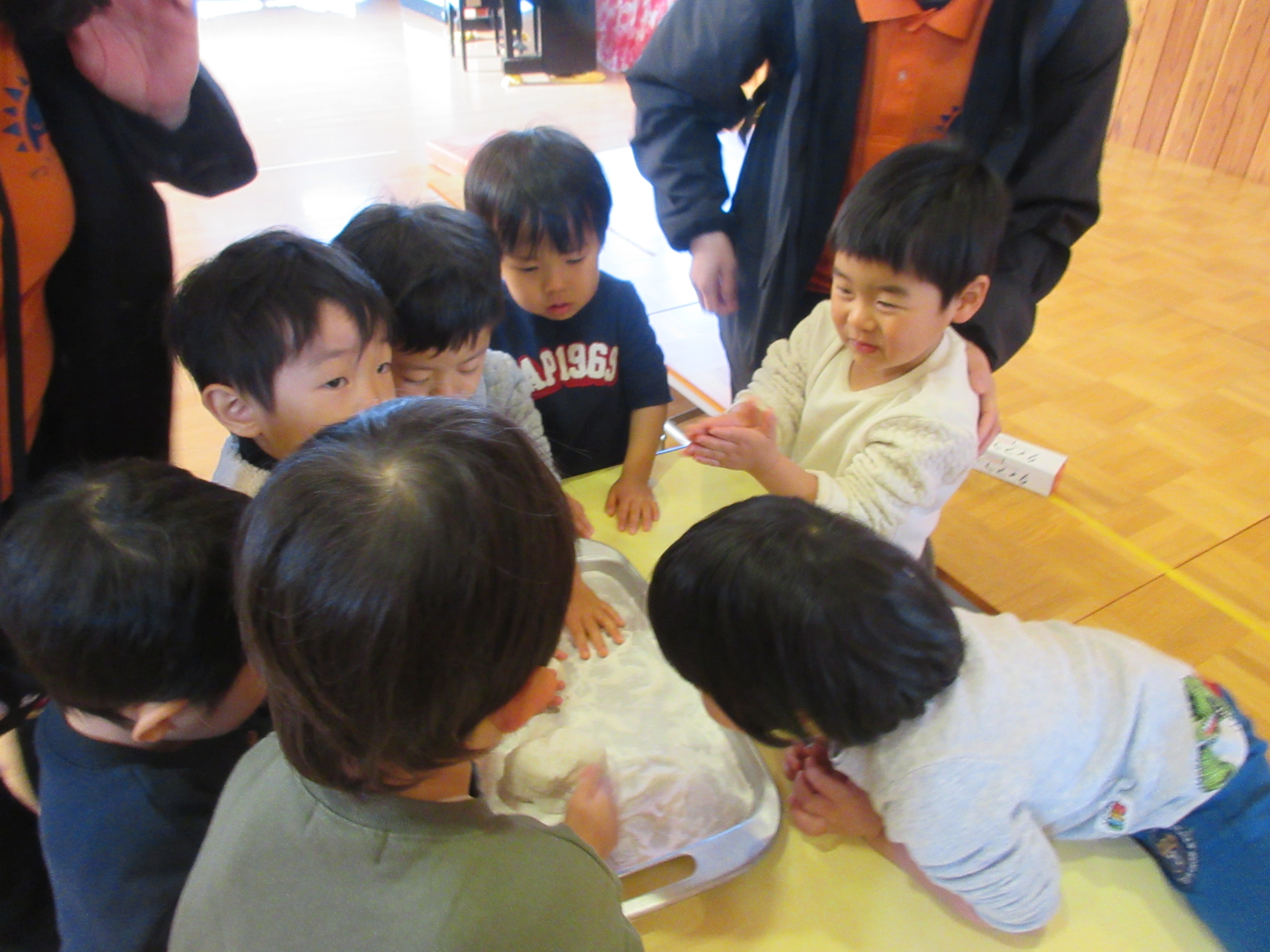 今週の火曜日に連携園のあがた保育園さんのお餅つき会を見させていただけることになり、