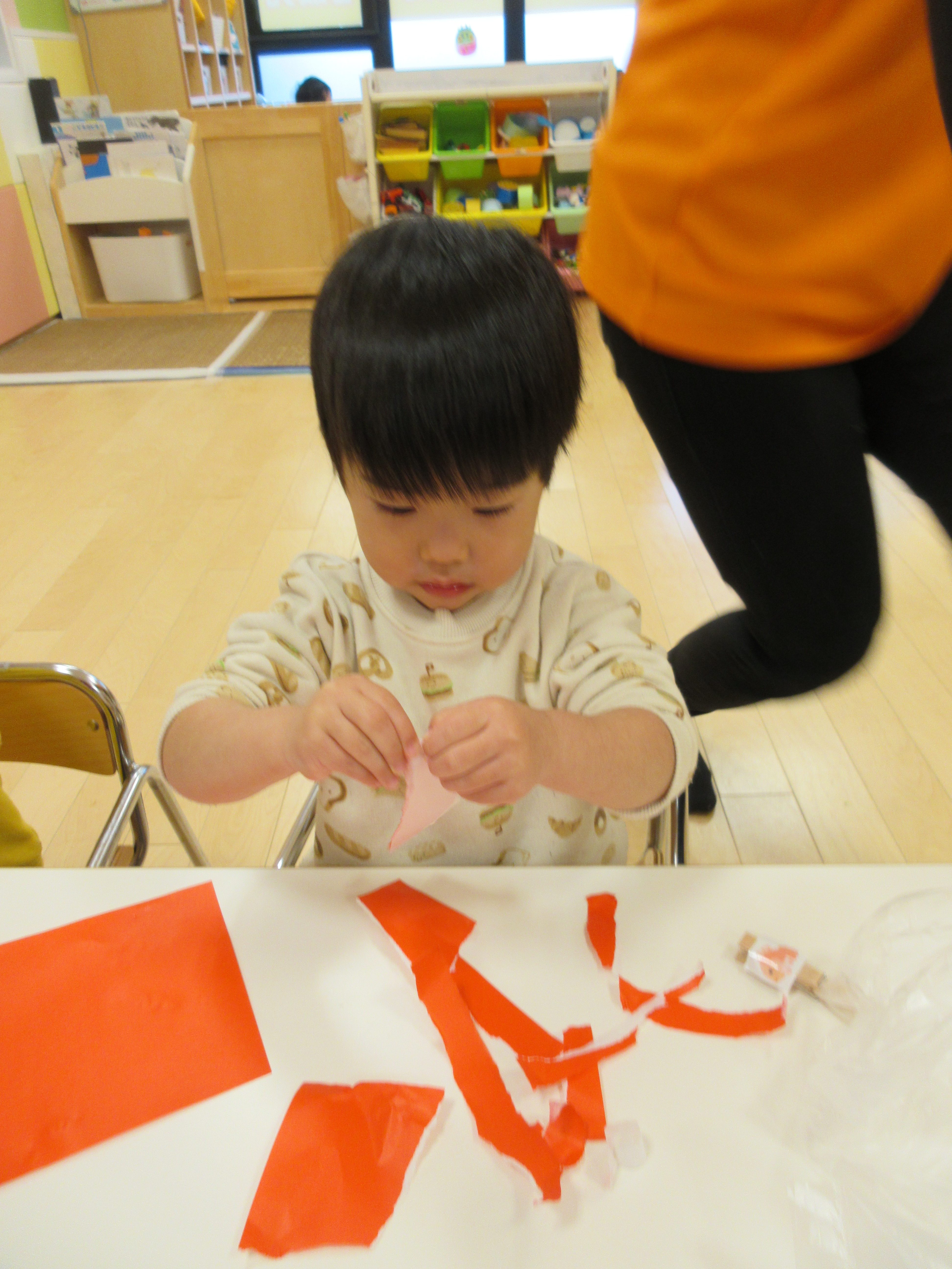 折り紙を破いた後は糊で画用紙に貼りつけ![]()