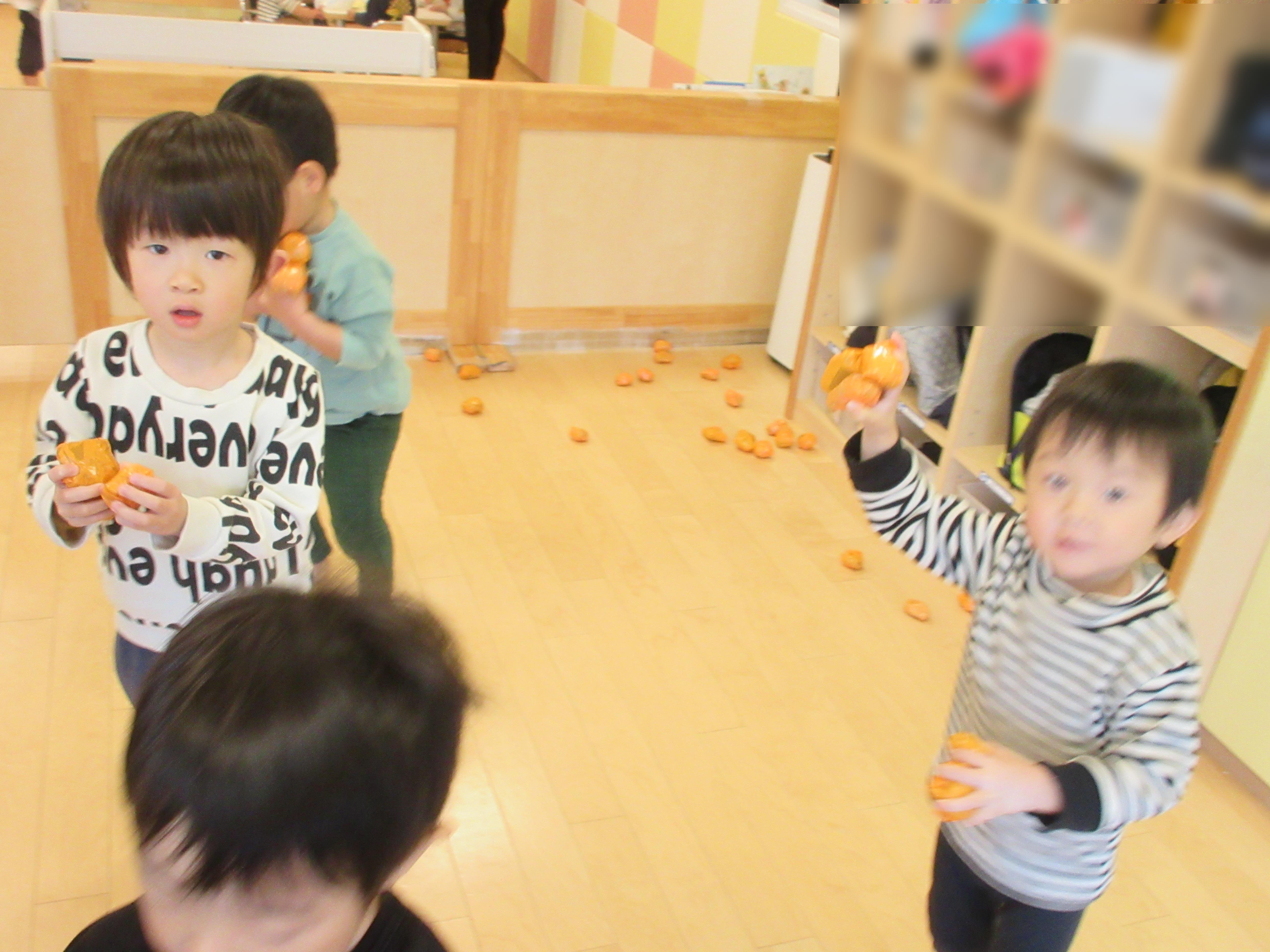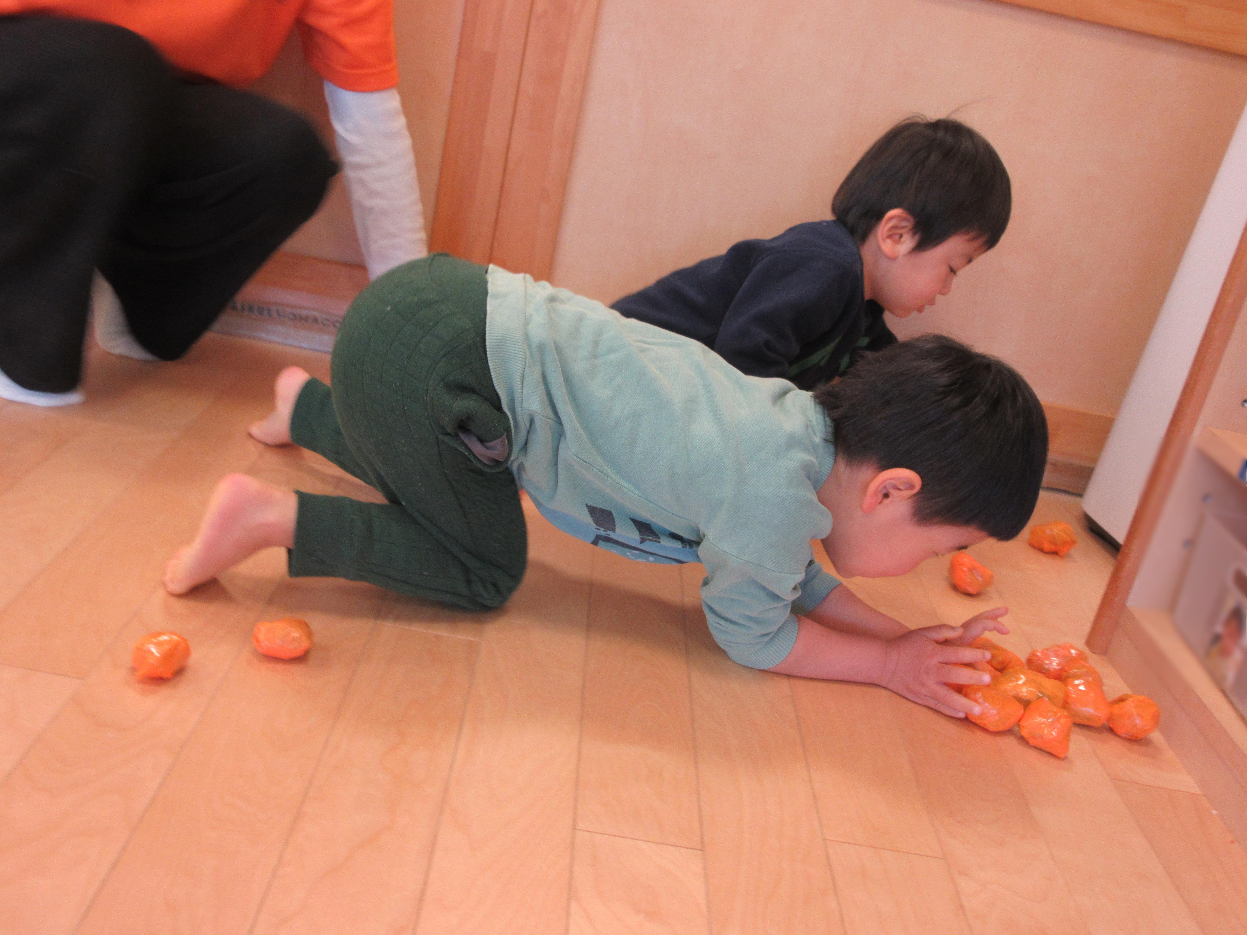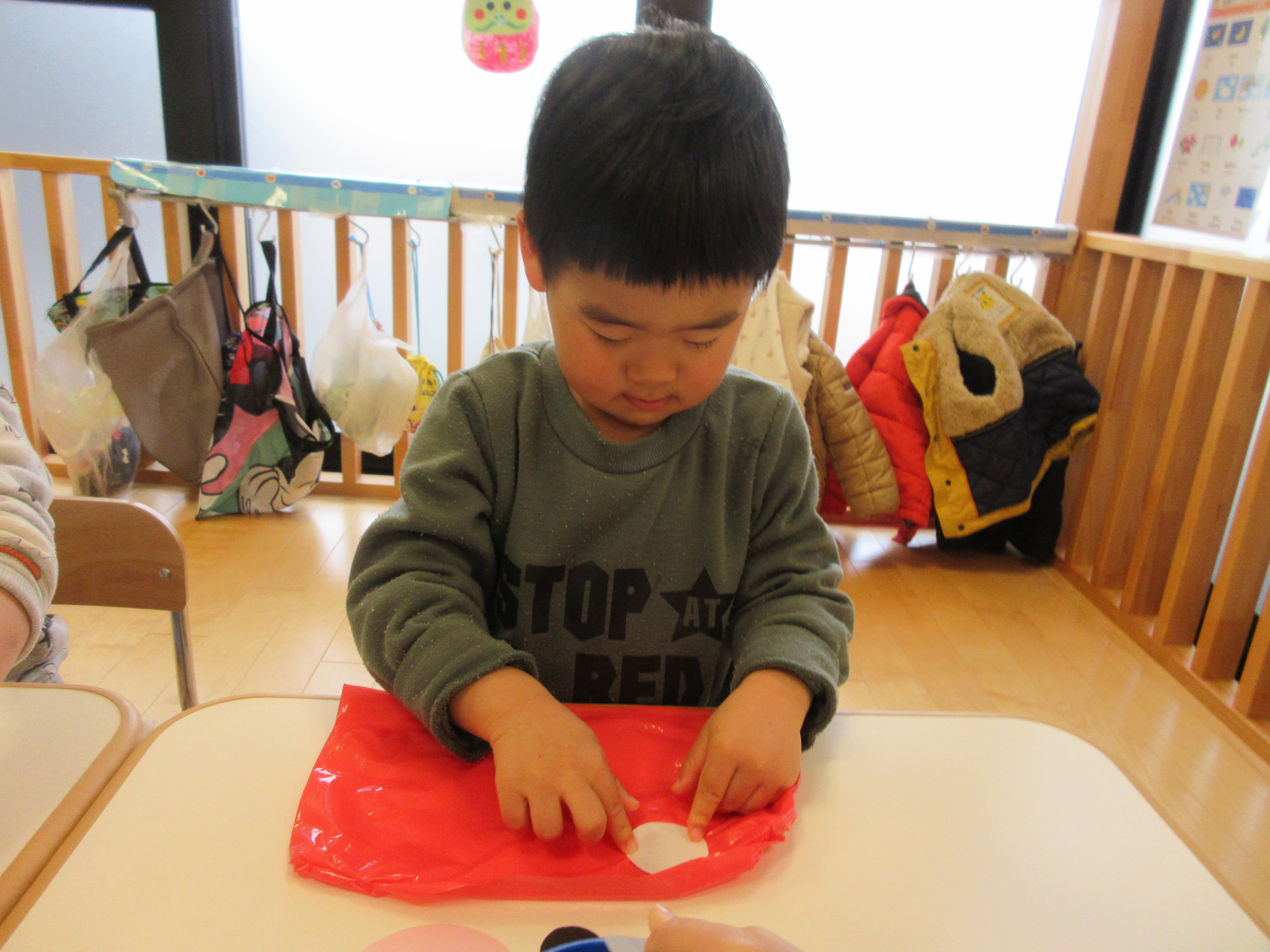 2月2日の節分会に向け、豆まきごっこをしたり「おにのパンツ」を