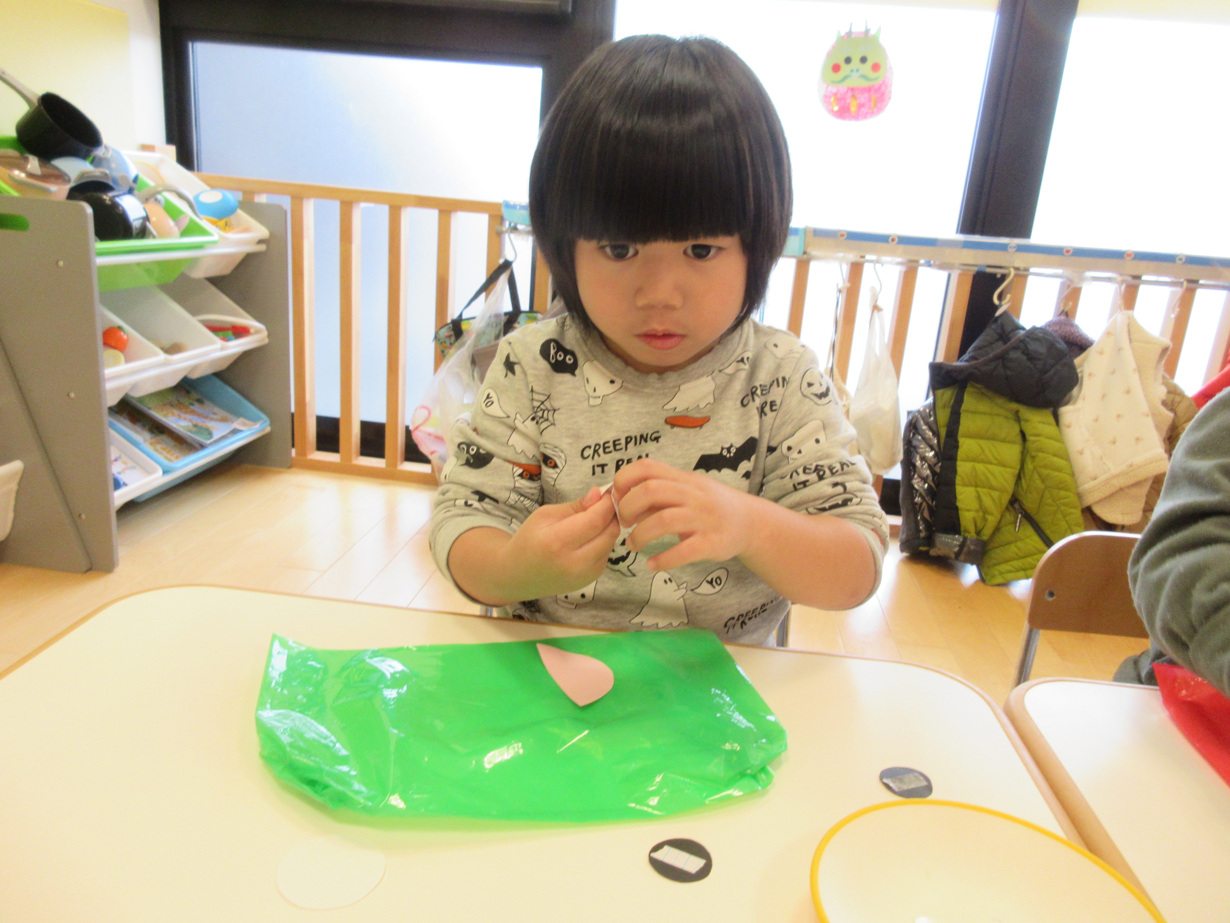 作り始めると⇩牙を口からはみ出さないように確認しながらしっかりと貼っていた子、