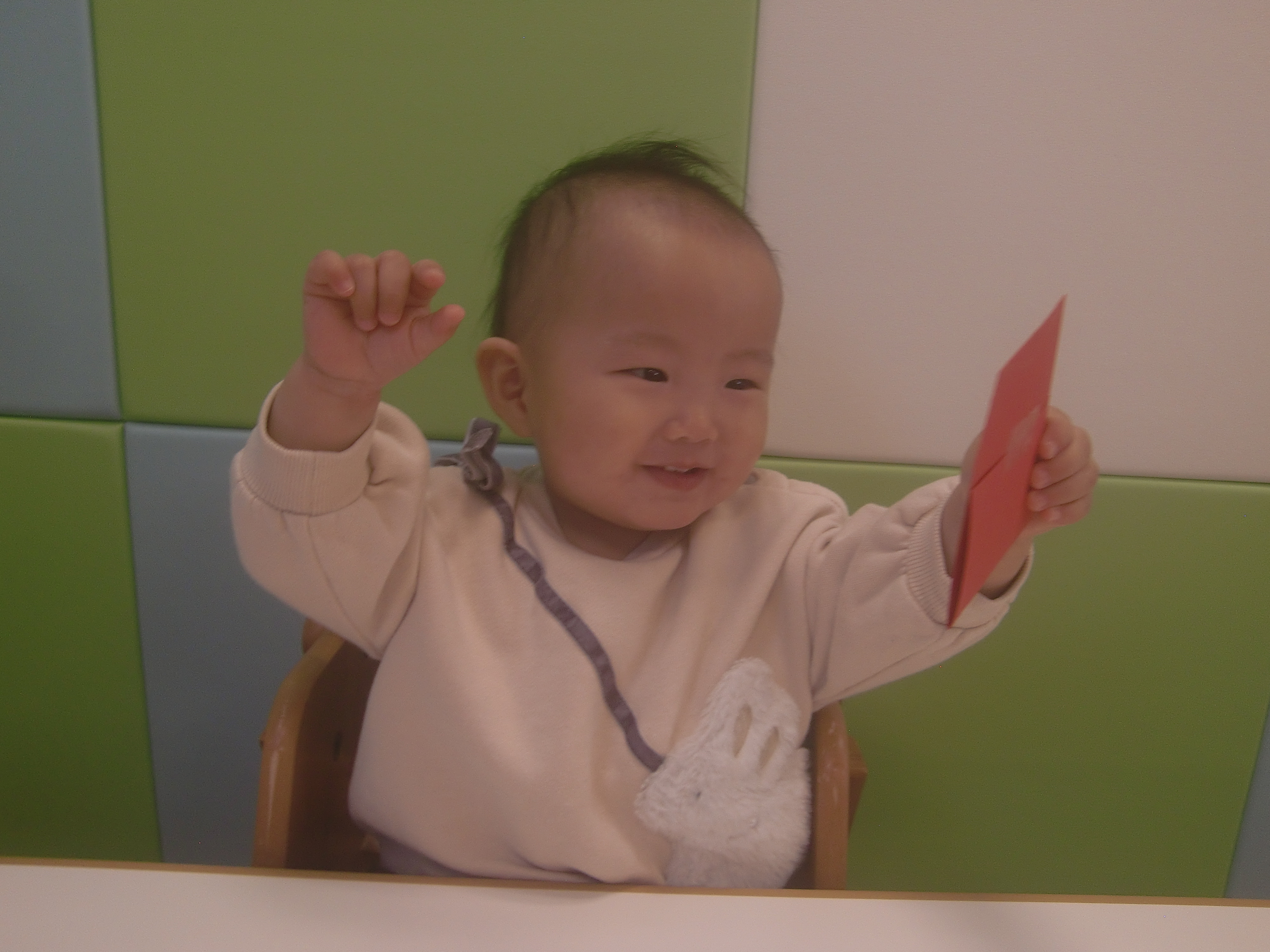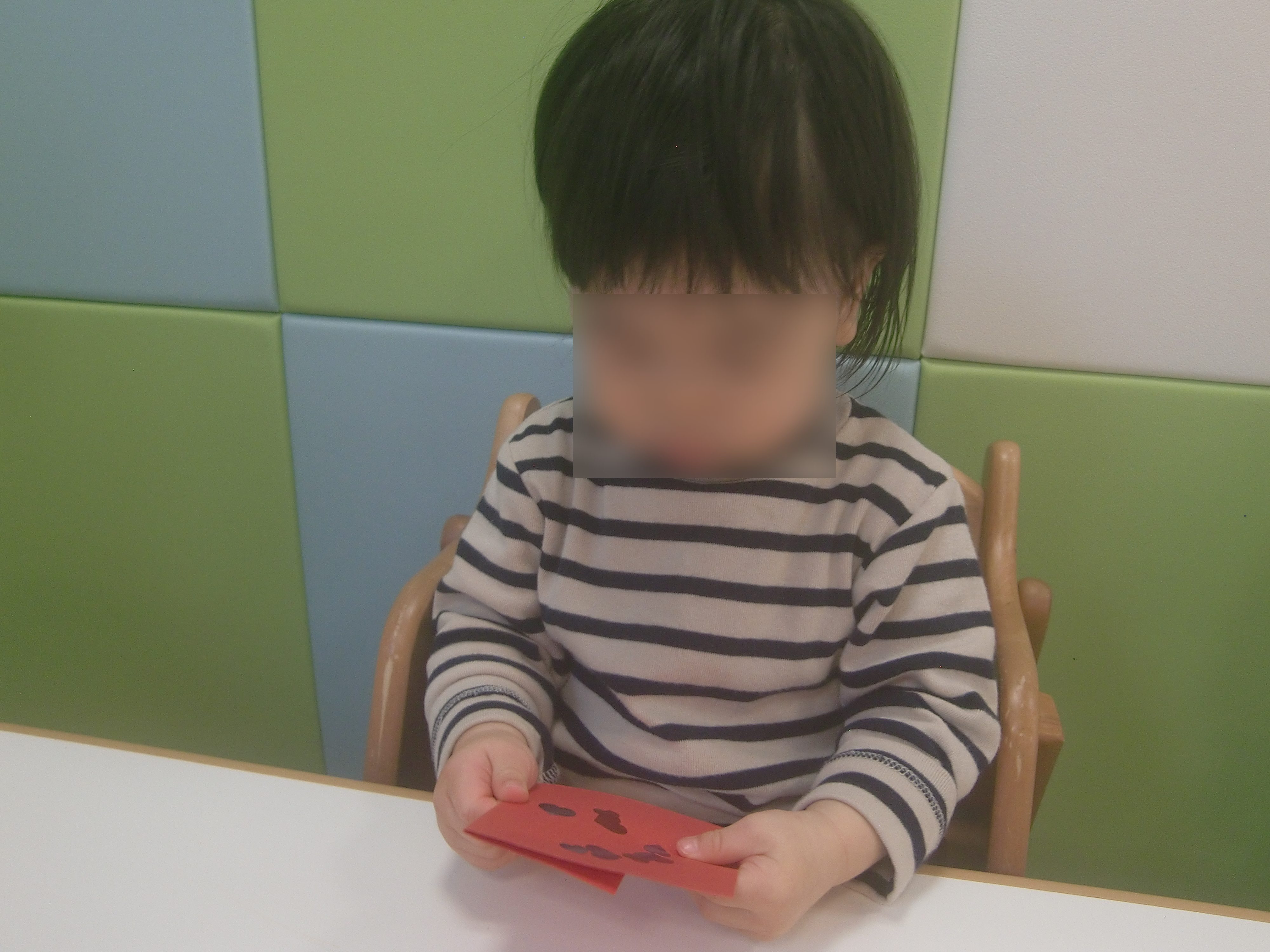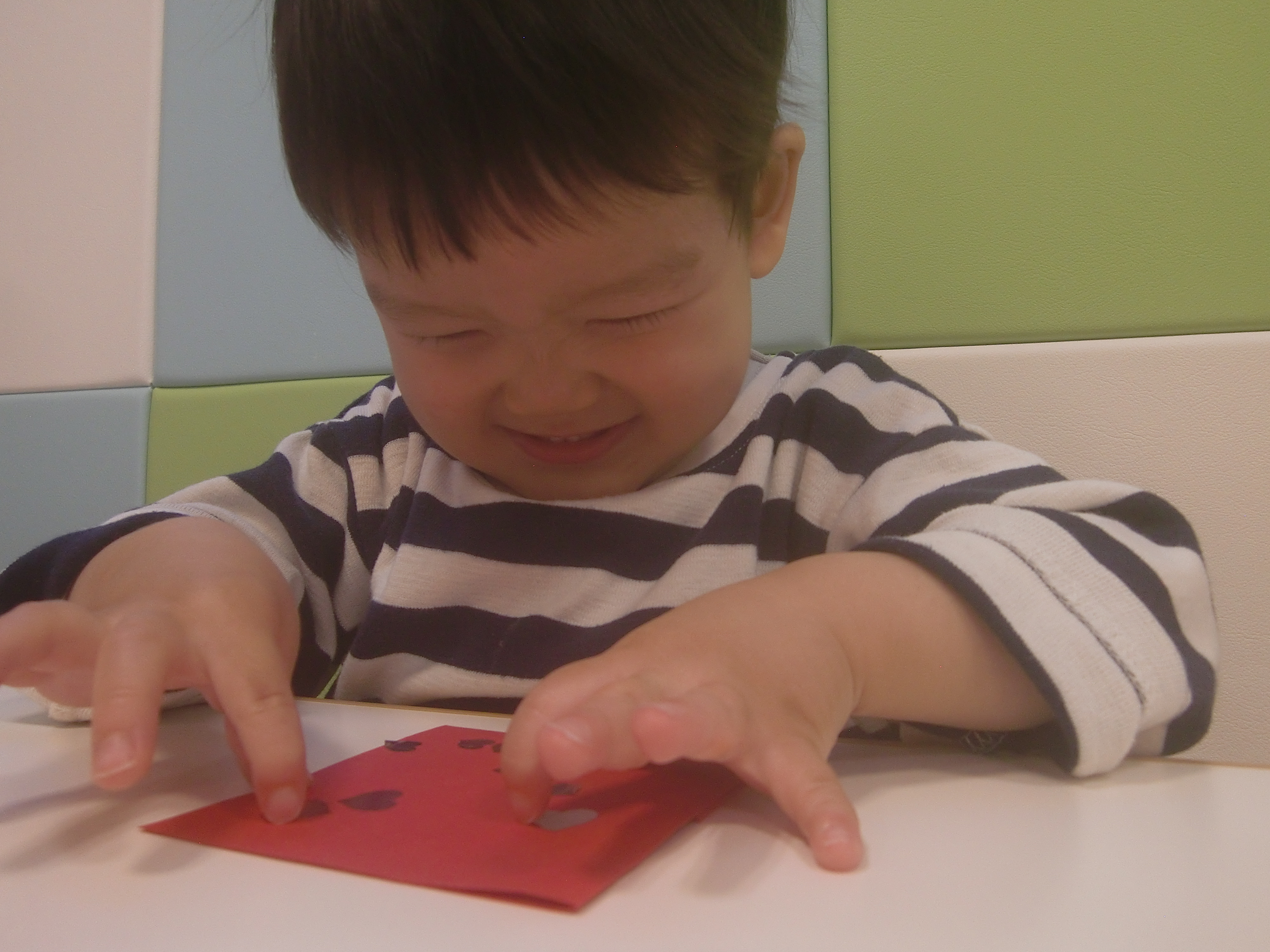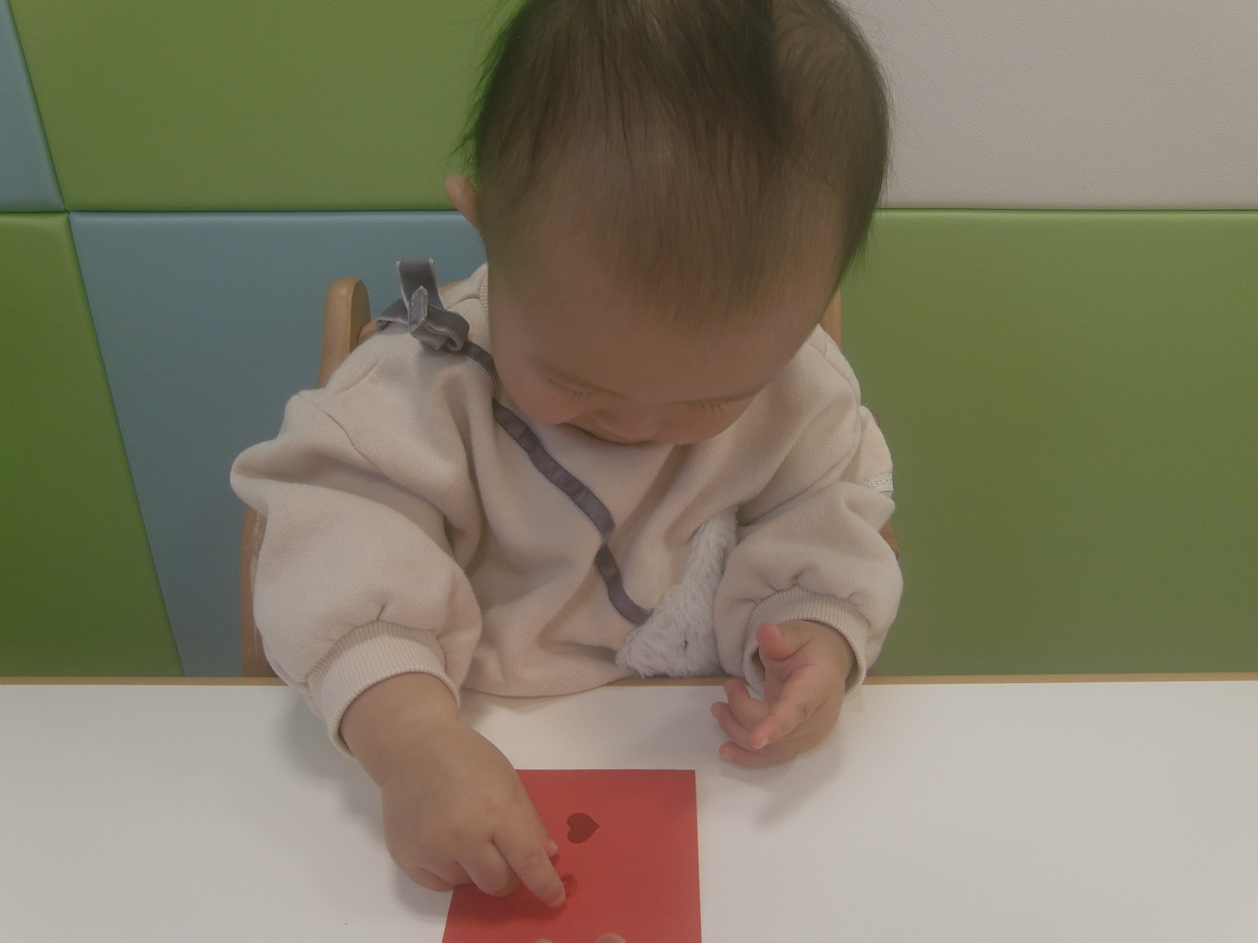 次は、パッケージに(赤い画用紙)薄い小さなハートのシールを貼ってもらいました![]()