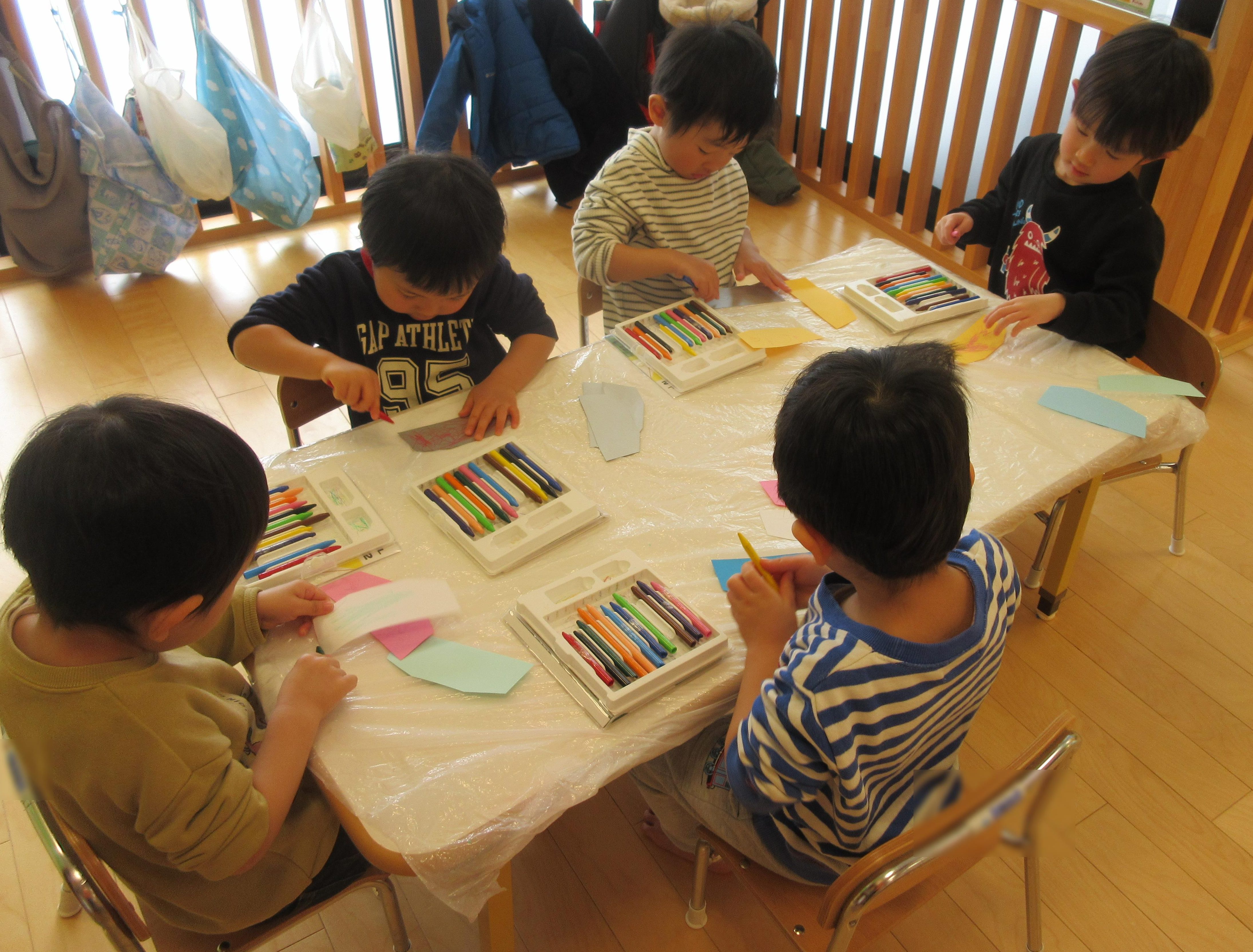 そのあとは好きな色のパンツを3つ選んでもらい、クーピーで模様を描きました。