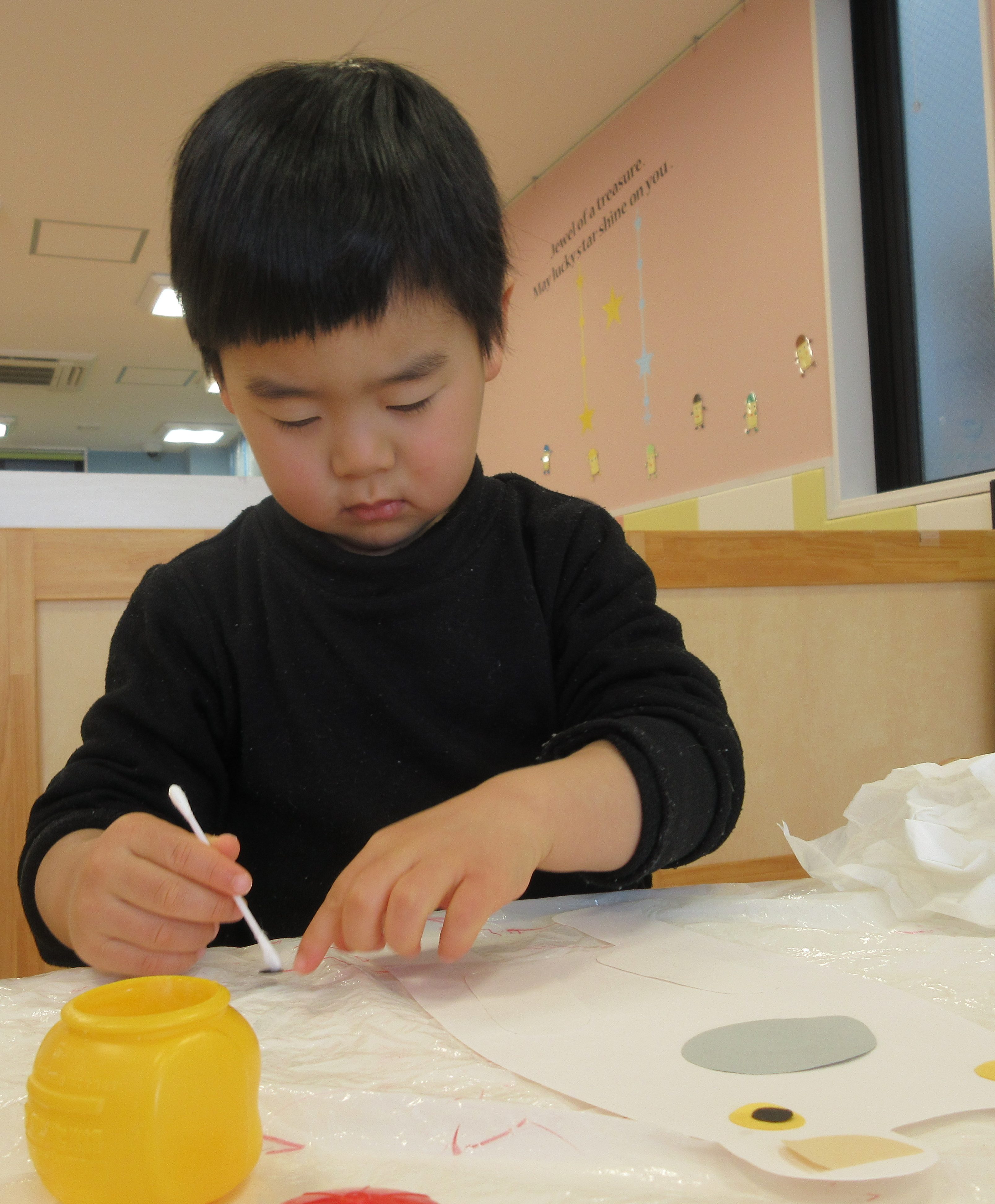 黒目と眉毛はとても小さいので、綿棒で糊を付けて貼ってもらいました。