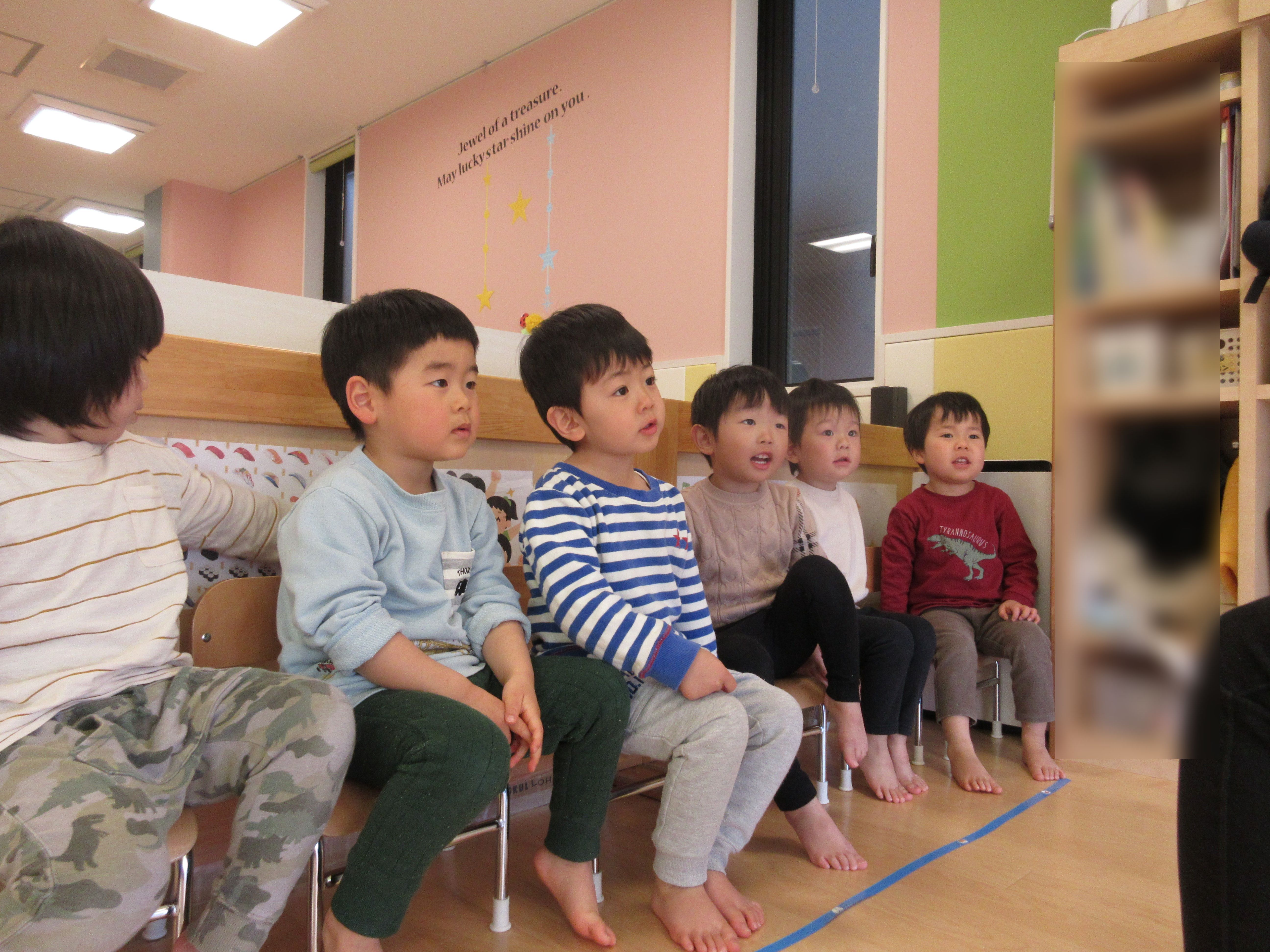 早いスピードで読み上げた後、ペースをゆっくりにし子どもたちに一緒に言葉にしてもらいます。