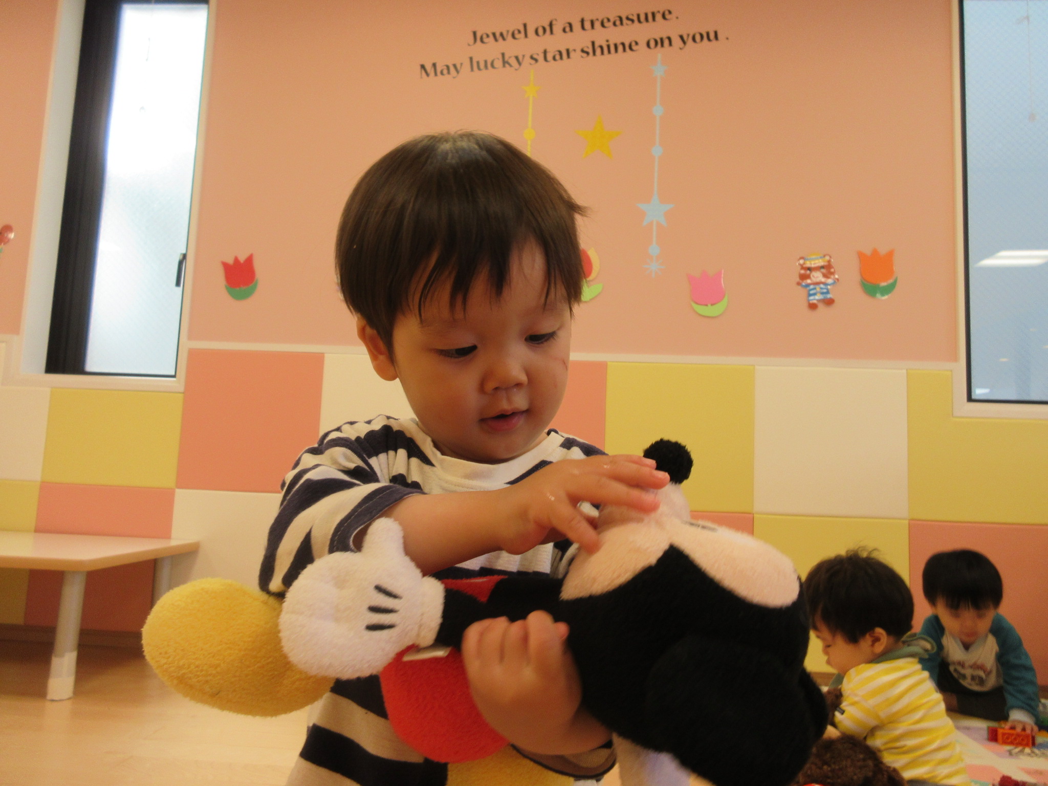 ↓ミッキーのぬいぐるみをぎゅっと抱っこして鼻を触って楽しんでいた子、
