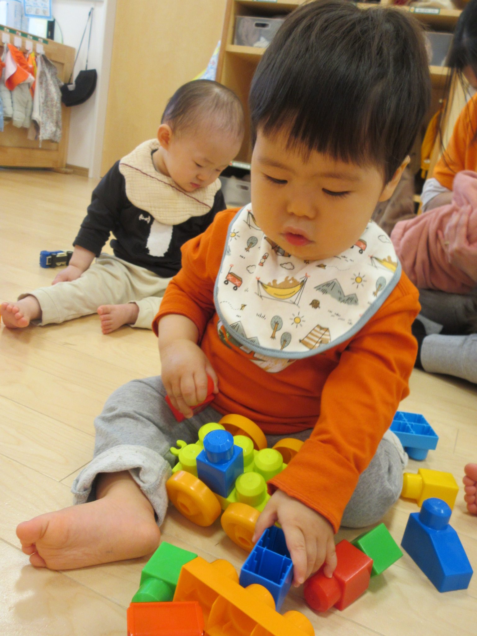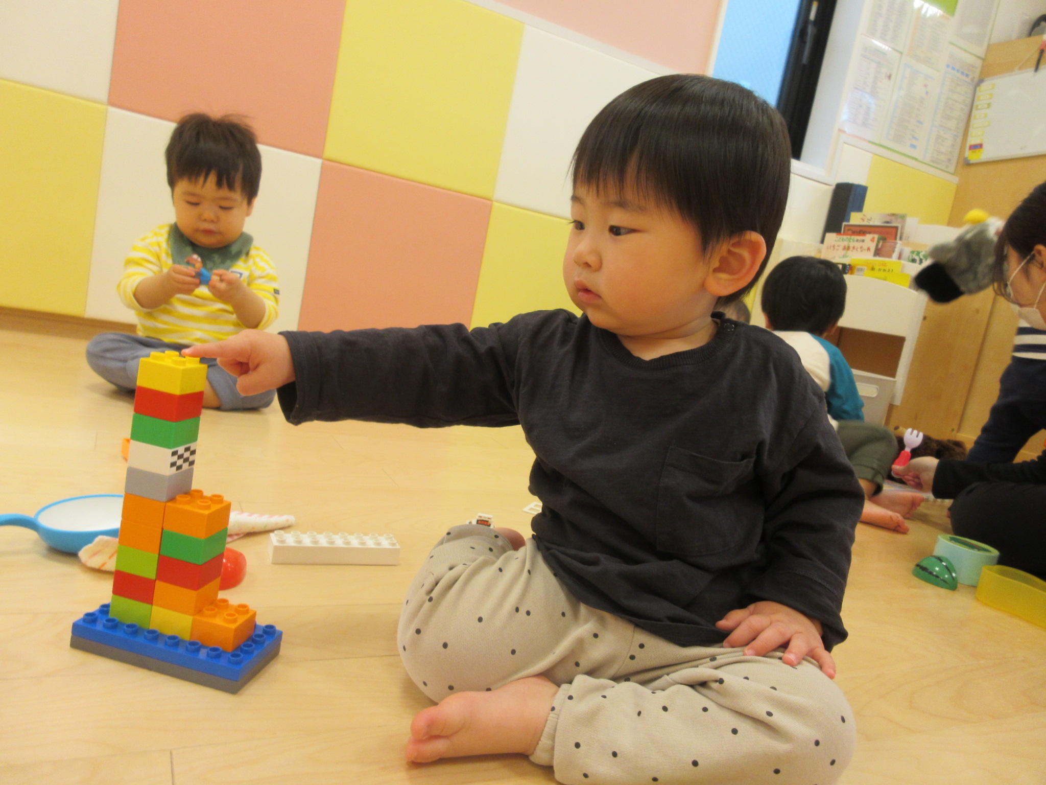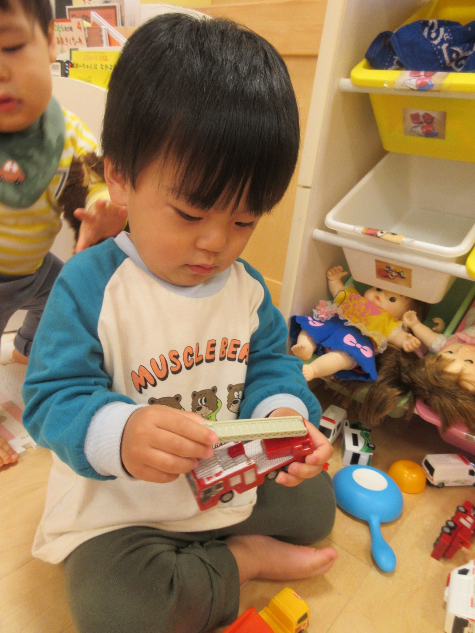 園での生活に慣れて、じっくりと遊ぶことができるようになってきているいちごぐみさんのお友だち。それぞれ色々な玩具で遊んでいました!