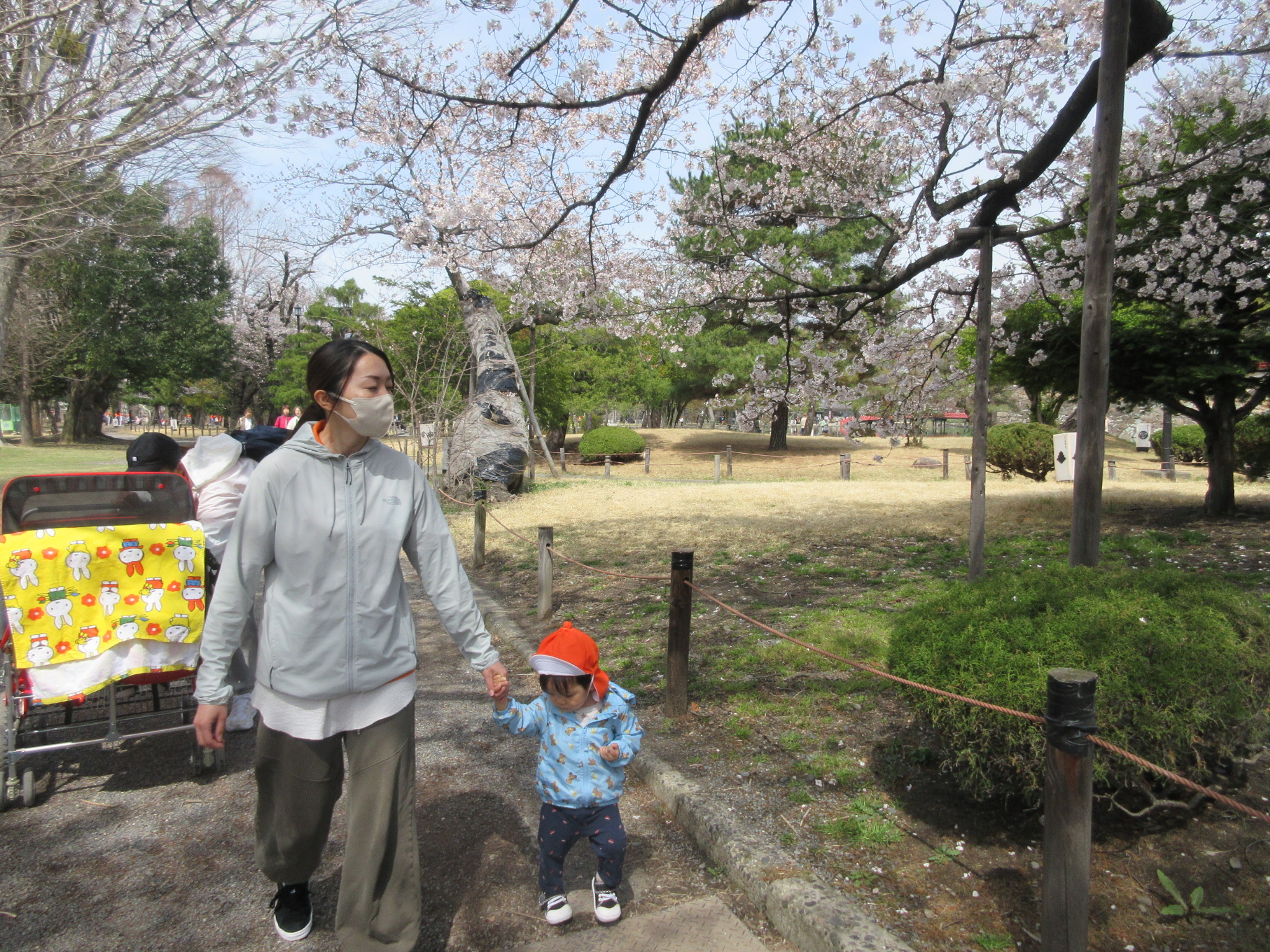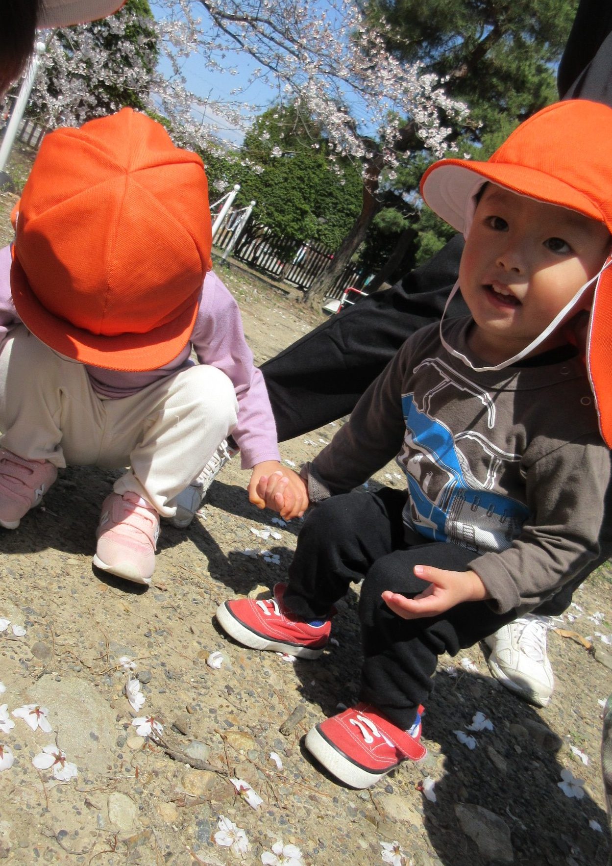 ↓手繋ぎで散歩を楽しんでいた子は、道に落ちている桜の花びらを見ていましたよ![]()