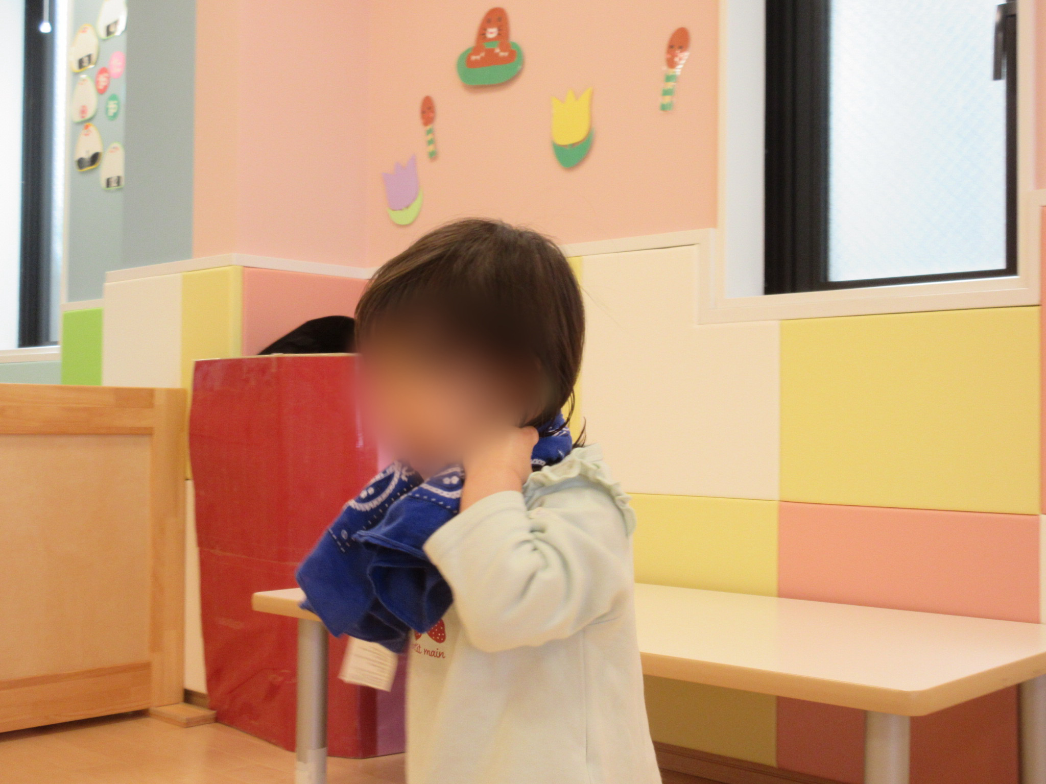 ↓布を首からかけて笑いながら何やら楽しそうに遊んでいたり、