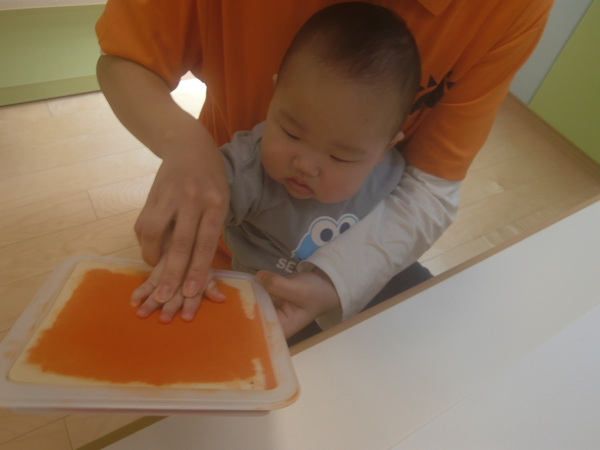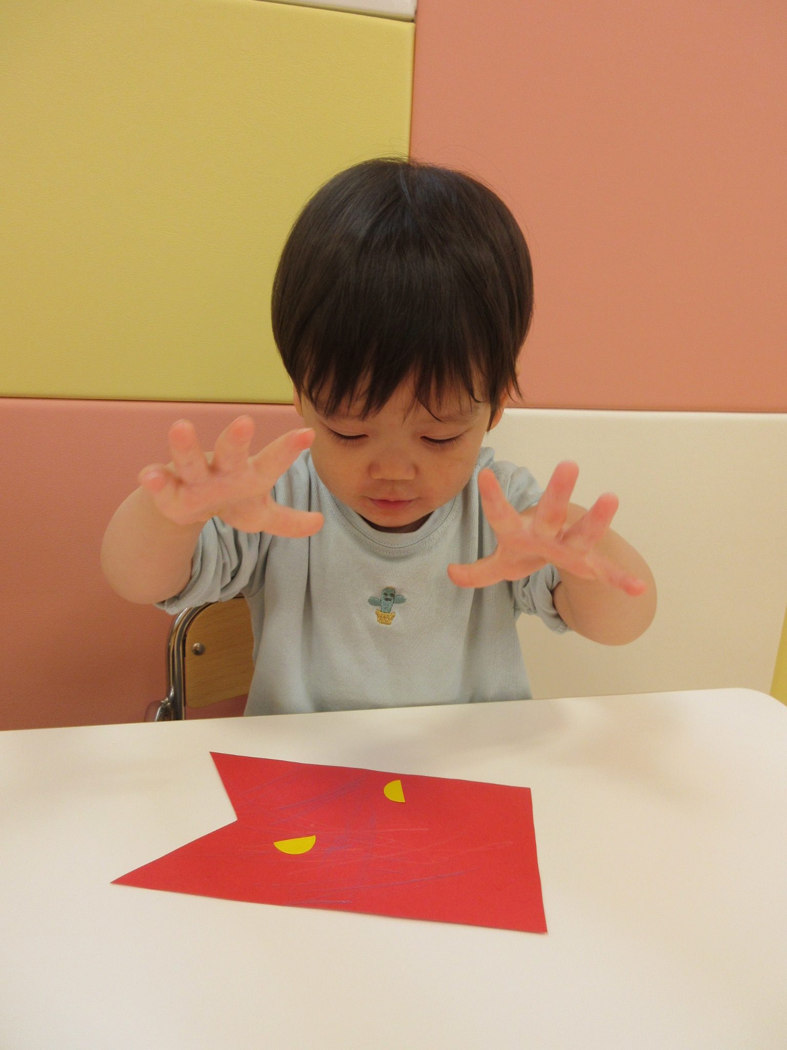 初めての絵の具の冷たさや感触に難しい顔を見せる子どもたちでしたが
