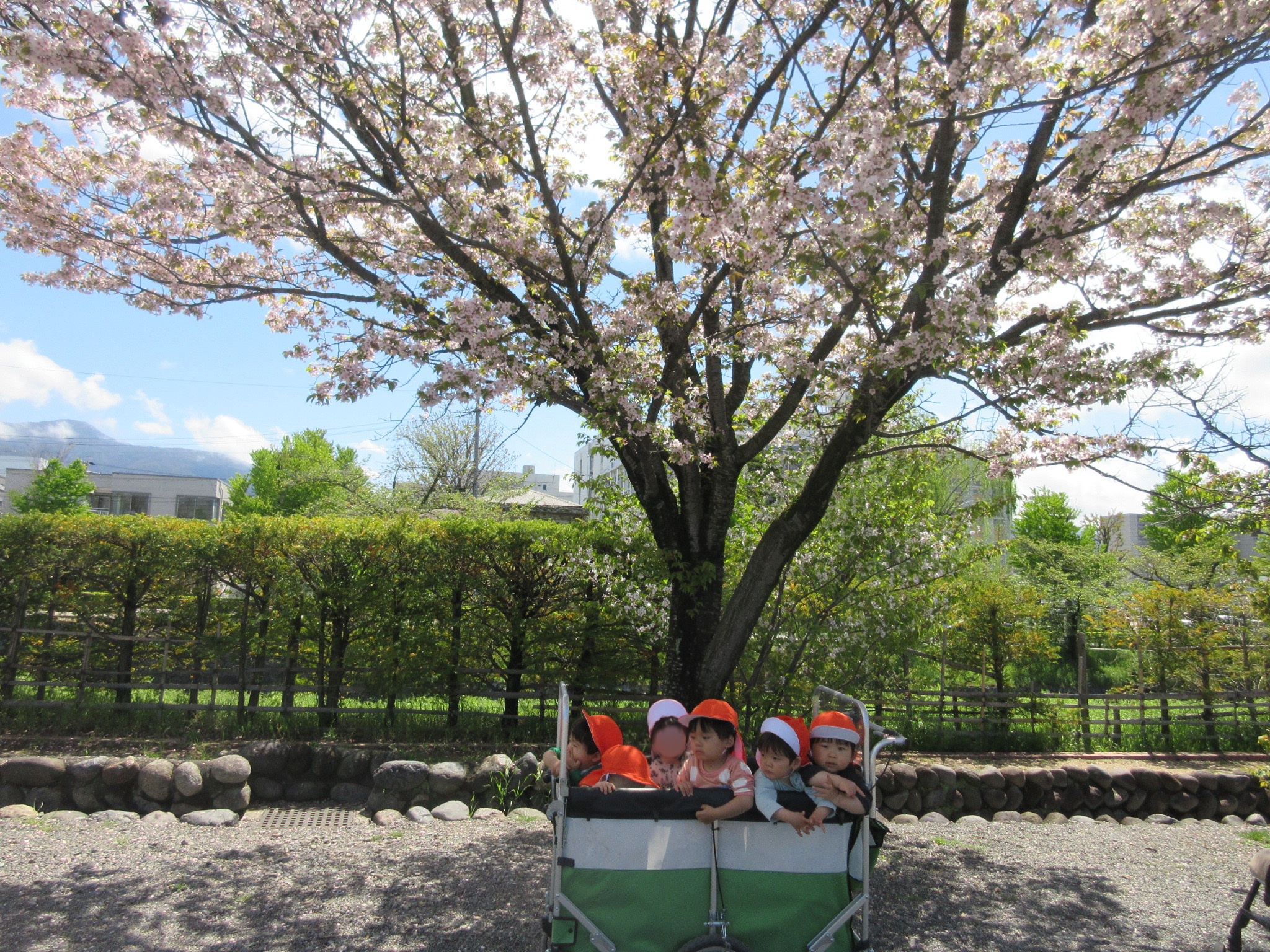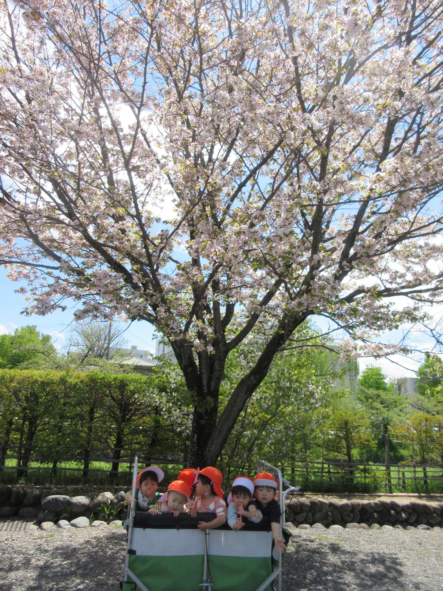 桜の木の下で記念撮影をしました!立ち乗りカートにみんなで乗って集まっている姿が可愛らしいですよね