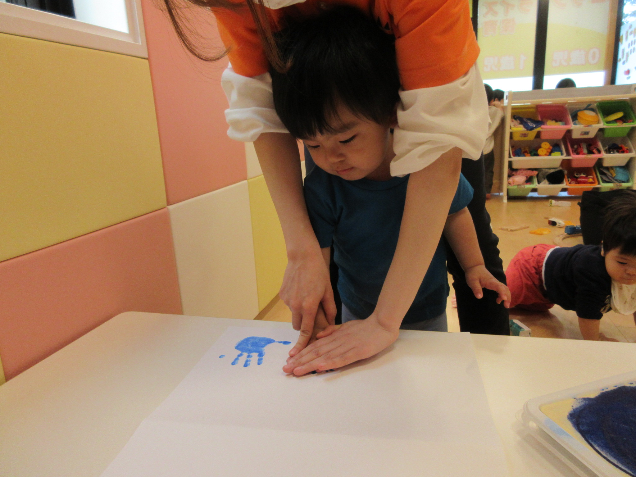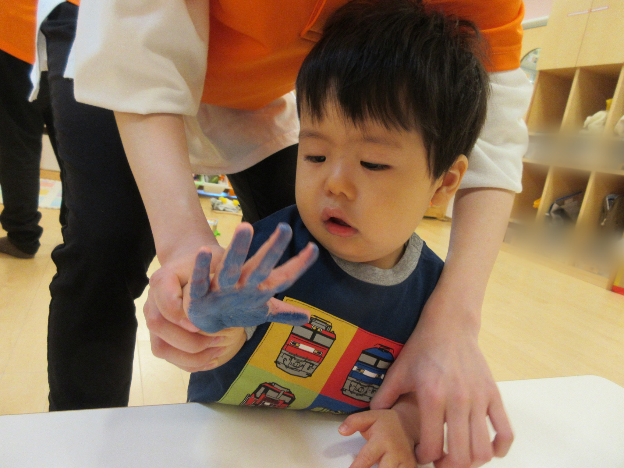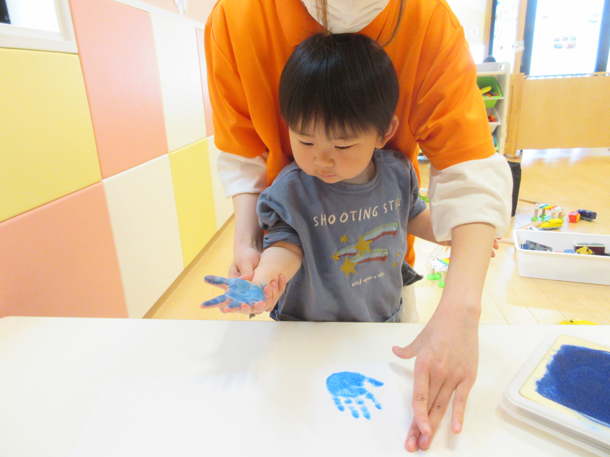 ↓手形はスタンプ台に手を乗せてインクを付けて取ったのですが、自分の手が青色になっていることが不思議なのか一生懸命手を見つめていました。