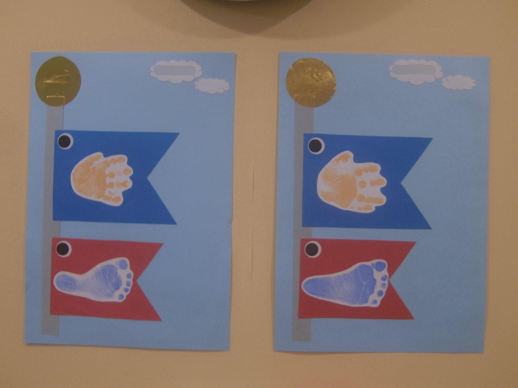 初めての製作ということもあり、今回は手形と足形でこいのぼりの鱗に見立てて見ました
