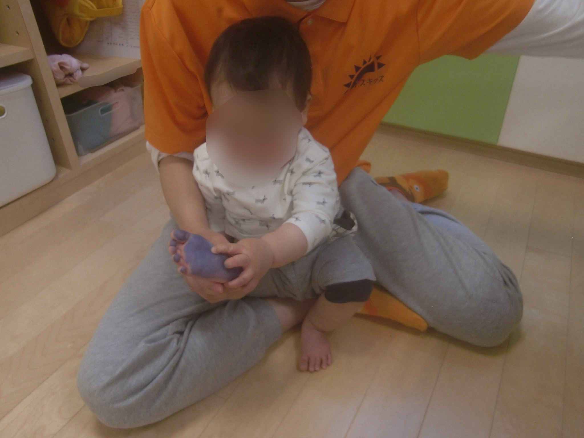 自分の足が青色になっているのが不思議なようで何度も触っていました