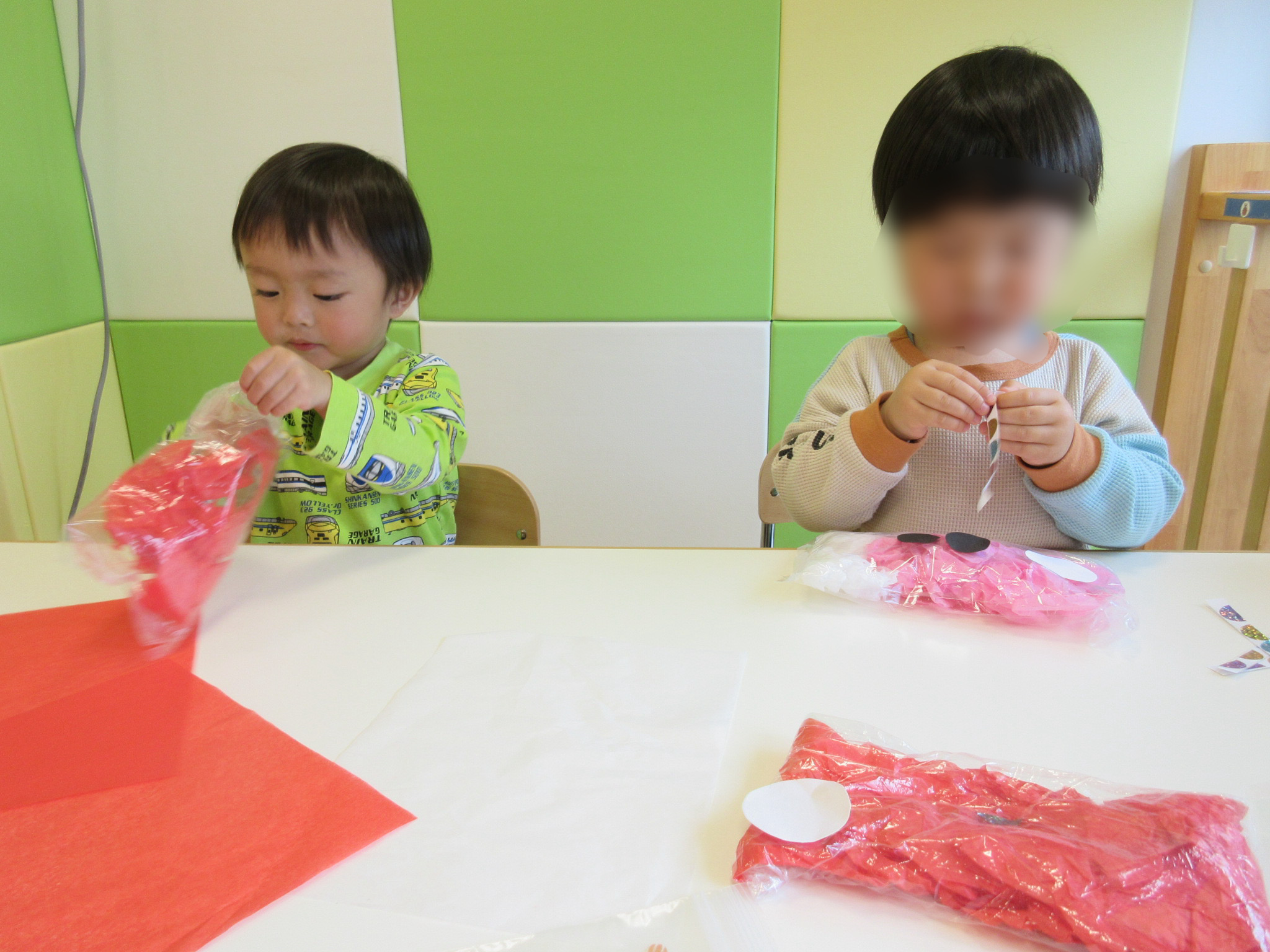 新入園児の子どもたちは初めての製作にドキドキ周りの友だちの様子を見ながら作っていました。