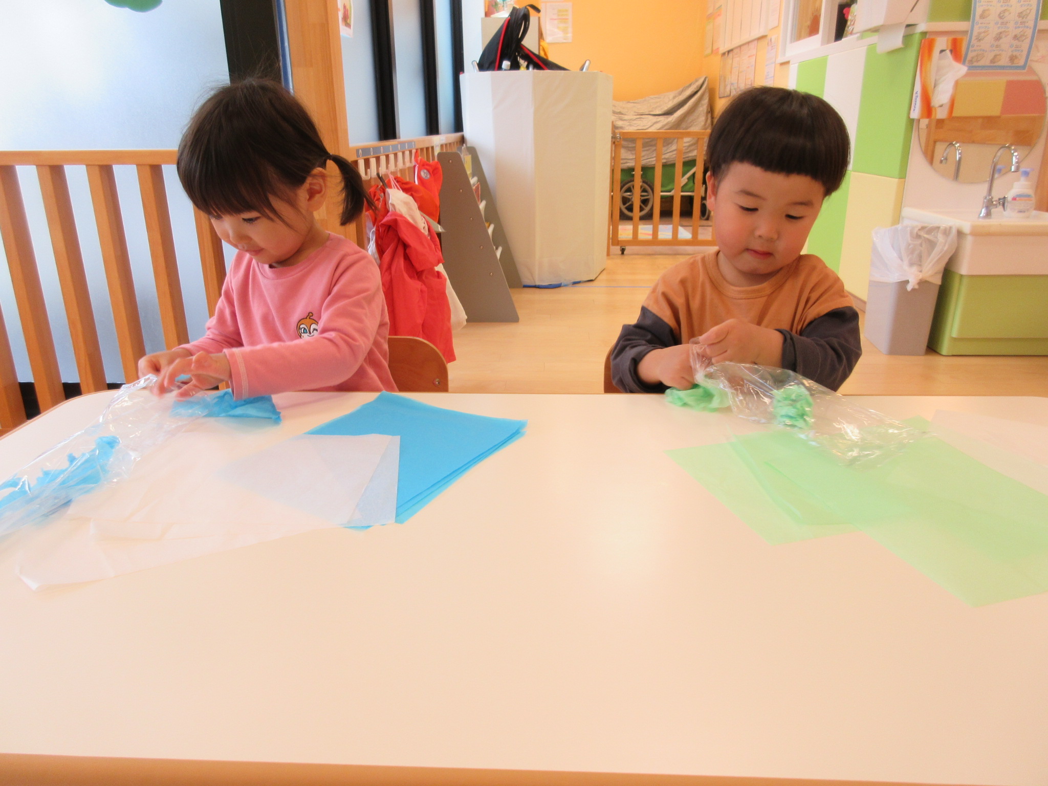 お花紙に興味津々の子どもたち