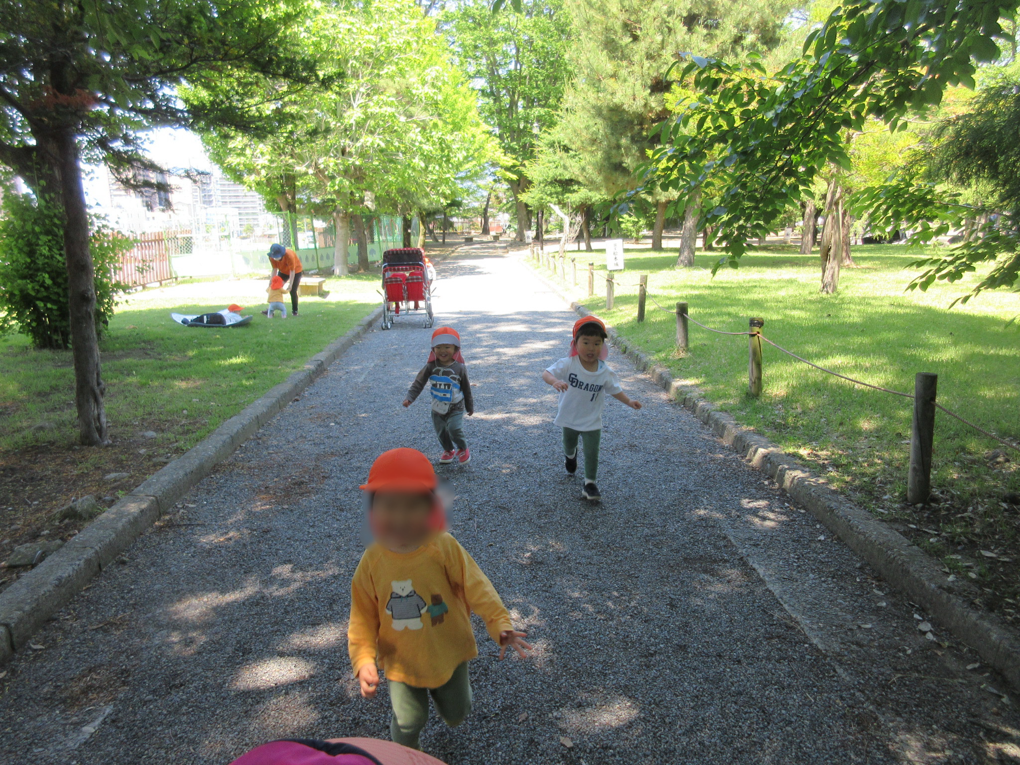 よーいどん!の掛け声で走り出す子どもたち。ゴールで待っている保育士を目指して元気いっぱい走っています![]()