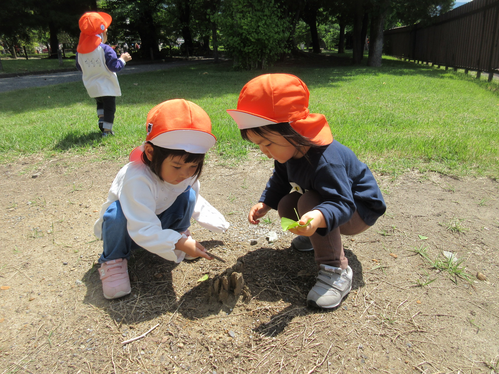 葉っぱや木の枝でツンツン。「なにかいるかな?」自然物を使って楽しんでいまね![]()