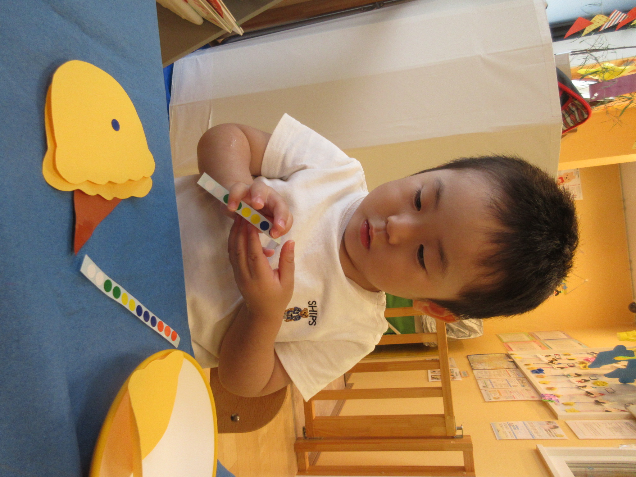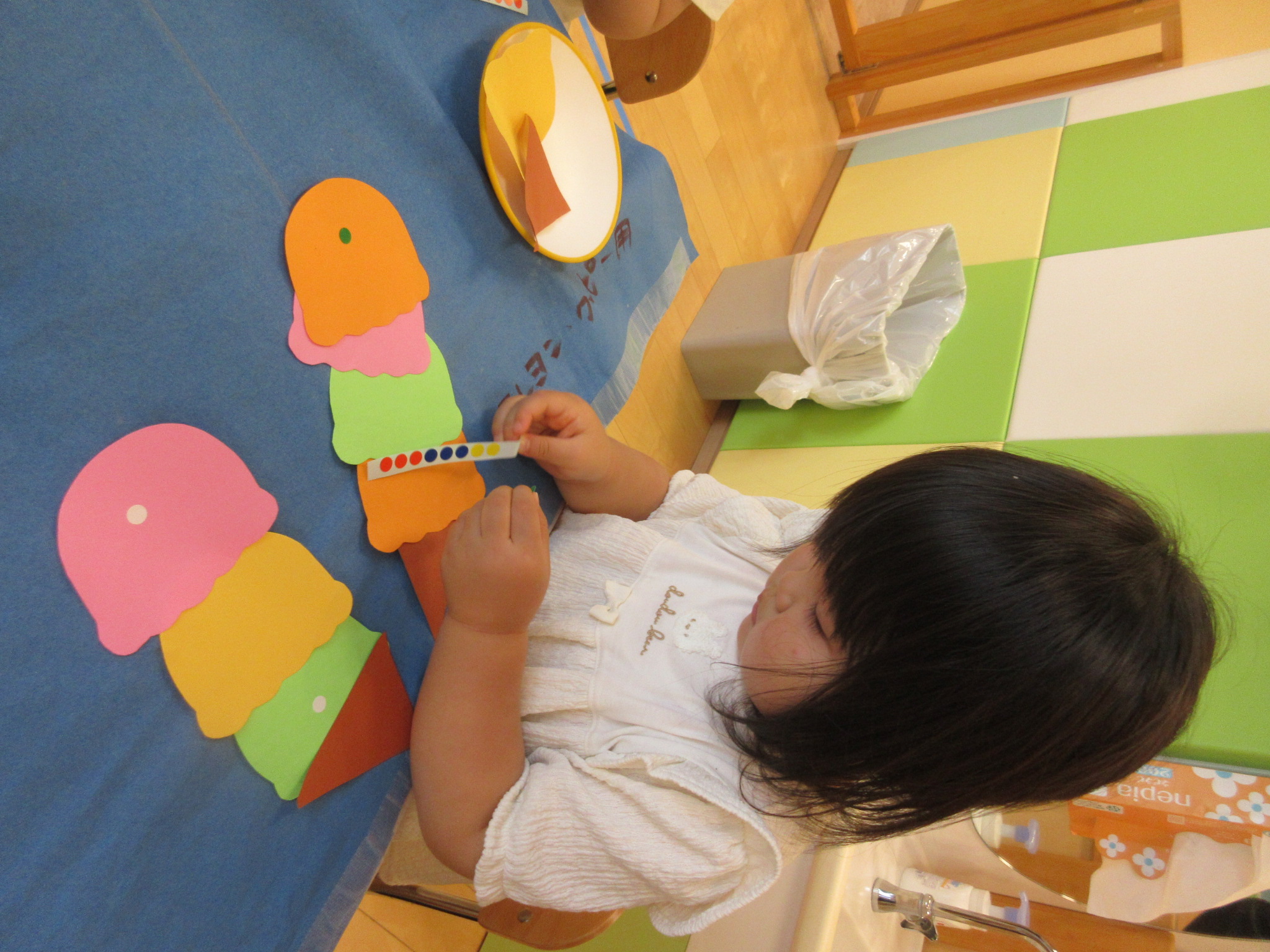 好きな色のアイスを選び、シールをペタペタ貼ったりお絵描きをし、思い思いのトッピングをしました![]()