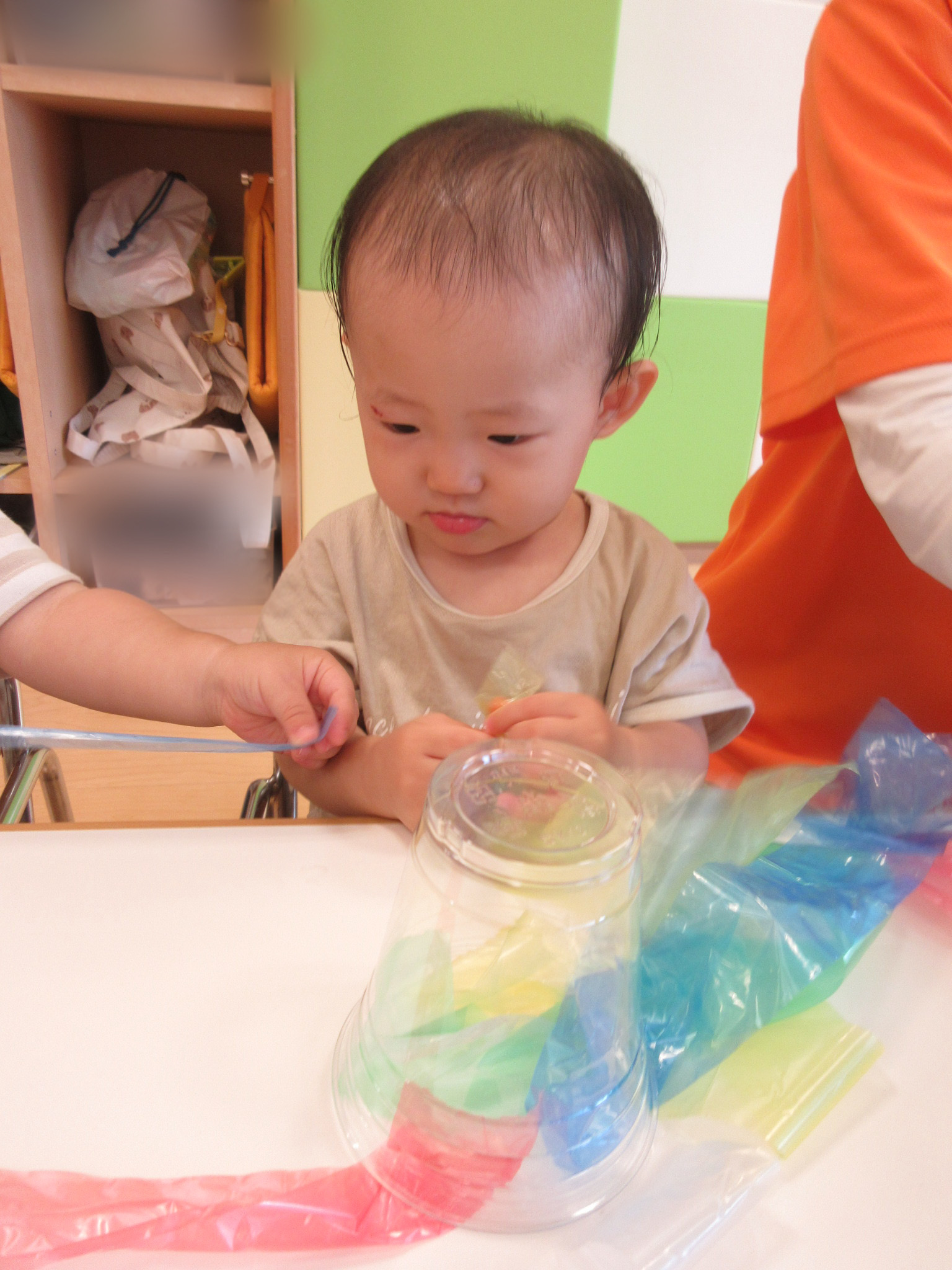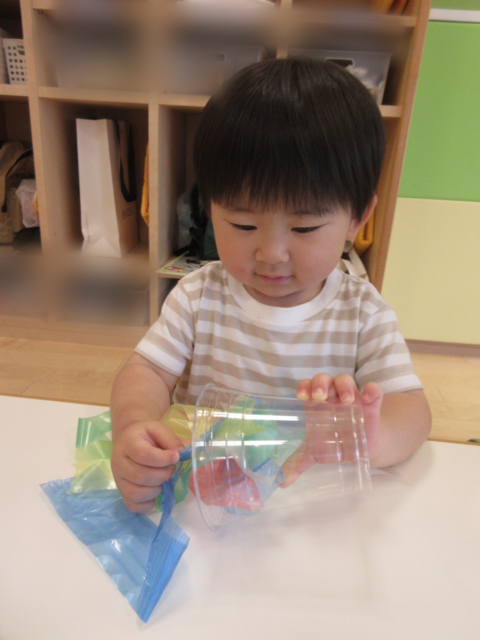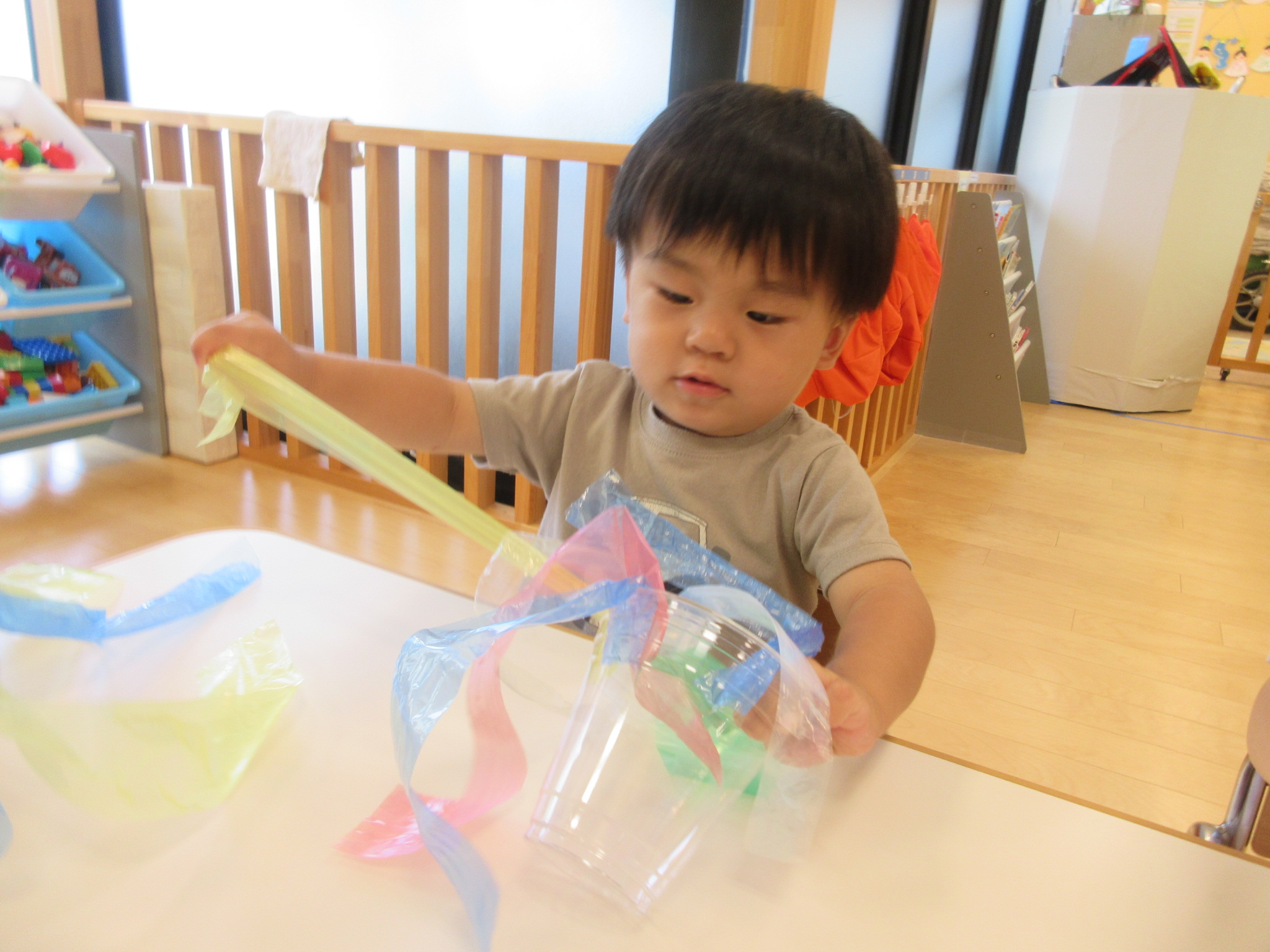 ↓こちらの子はカップの中にスズランテープを入れることが楽しいようで詰めていました![]()