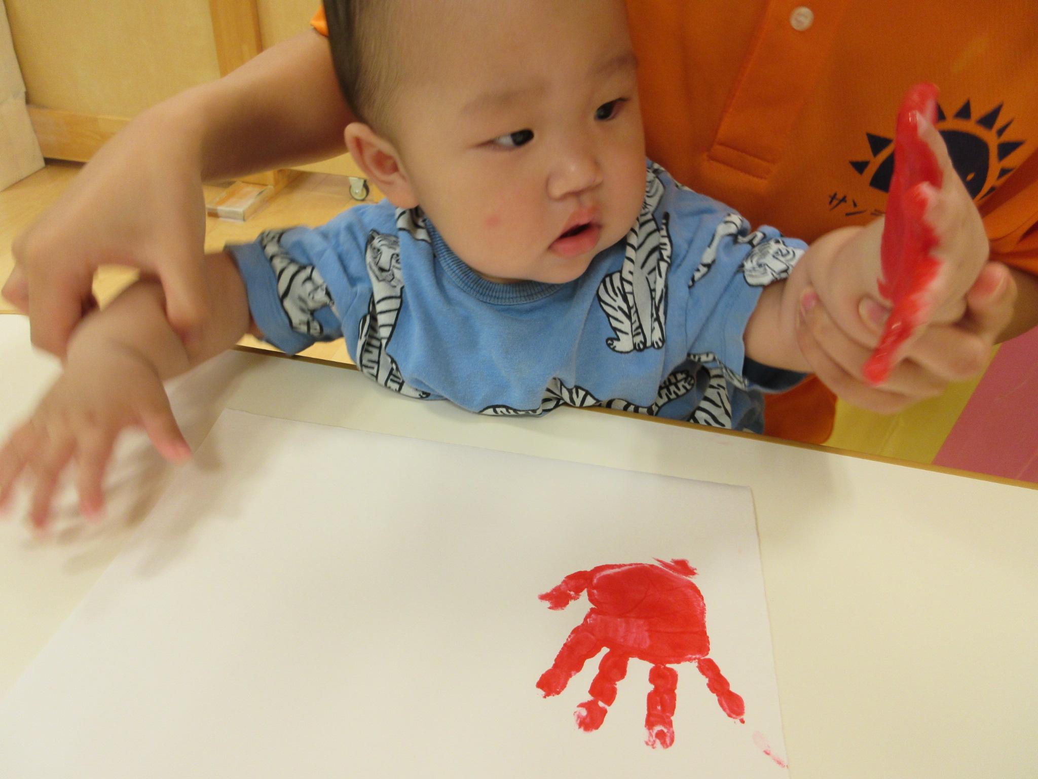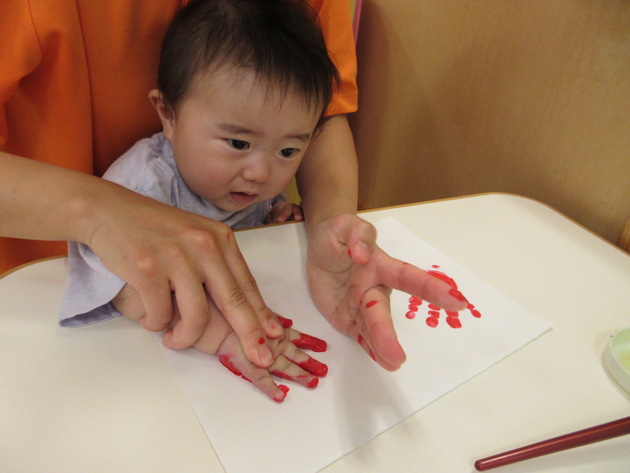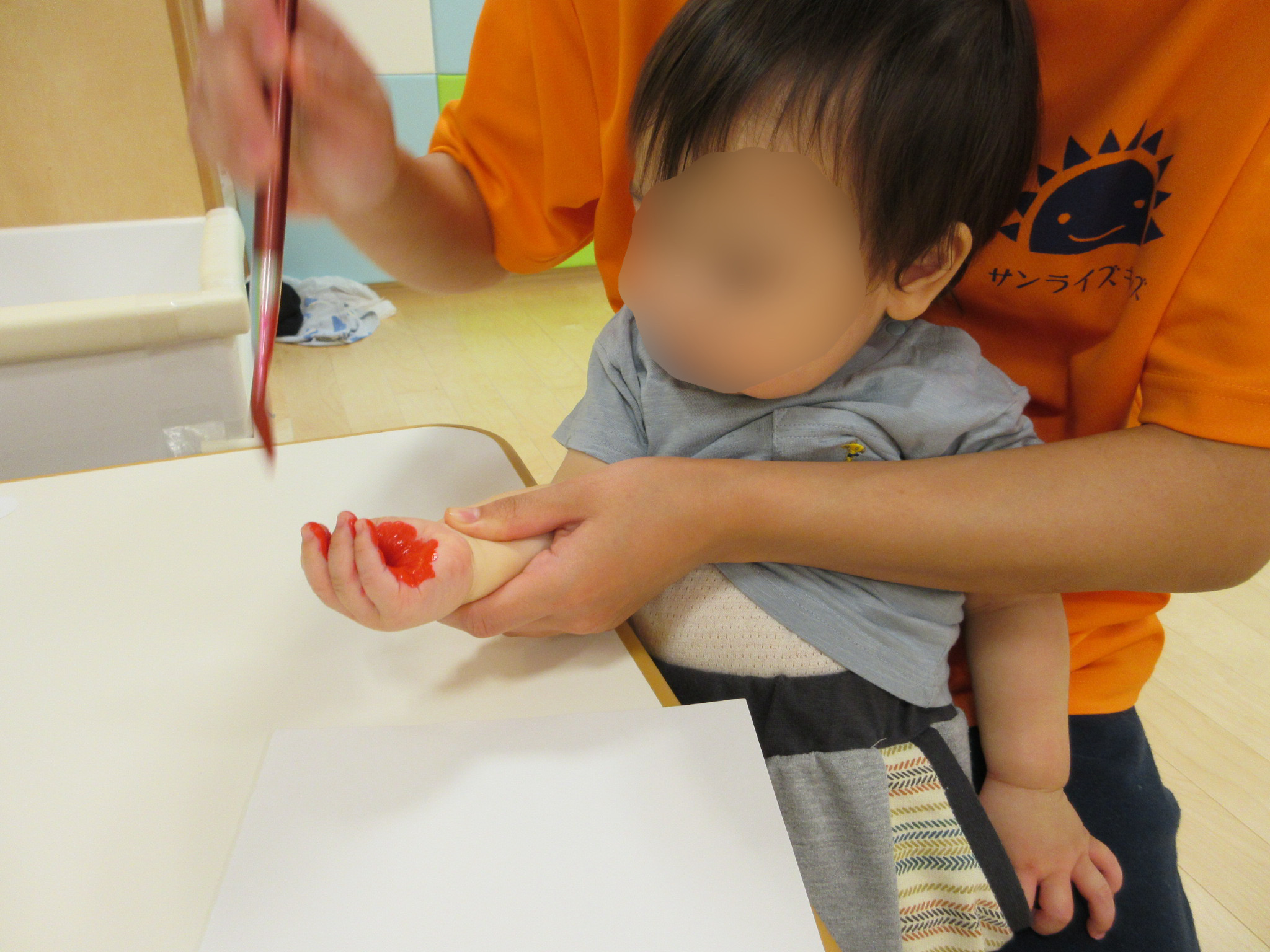 まずは、赤い絵の具を手の平にぬりぬり・・・![]()
