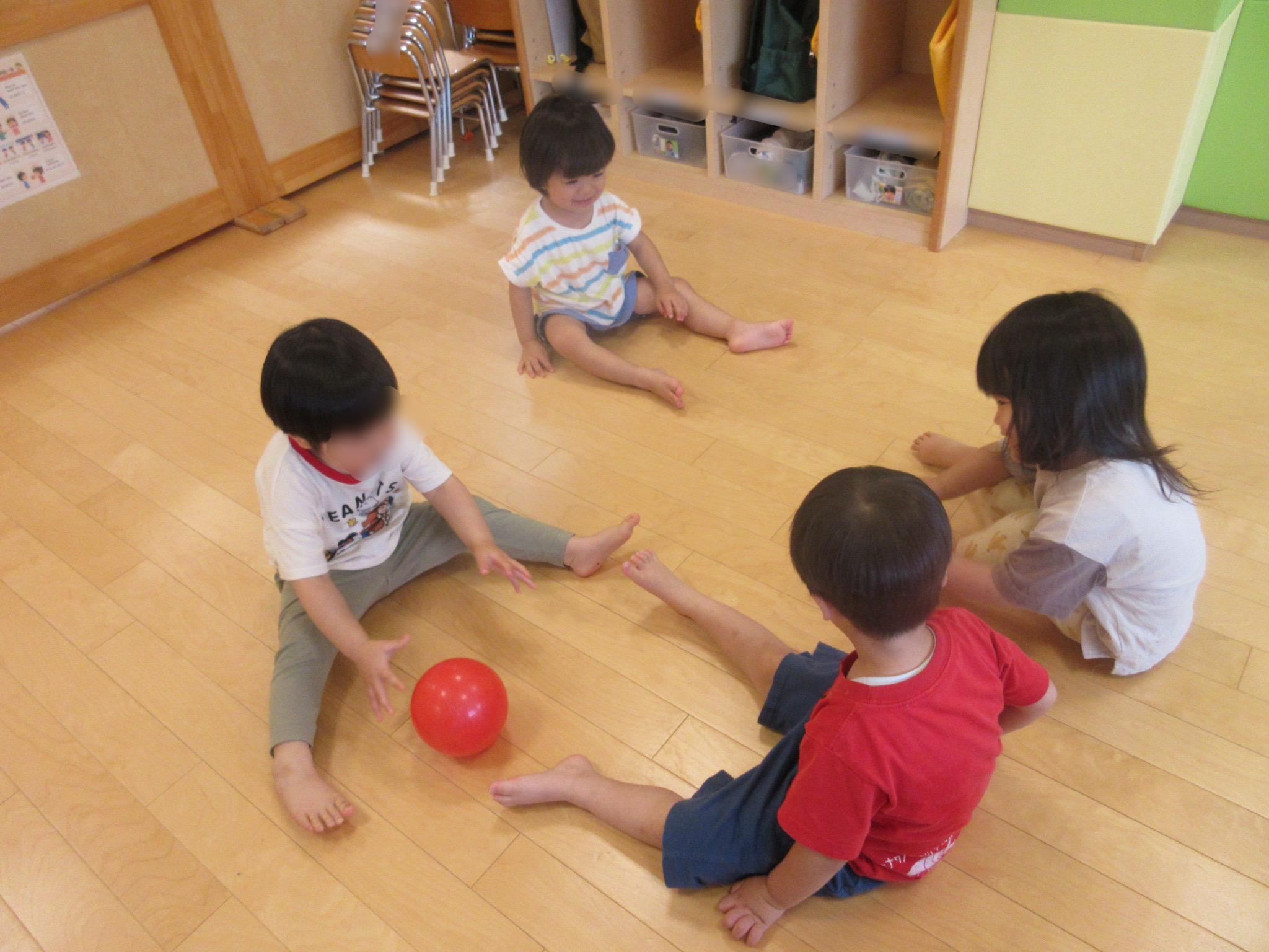 向かい側にいるお友だちとボールを転がし合ったり…